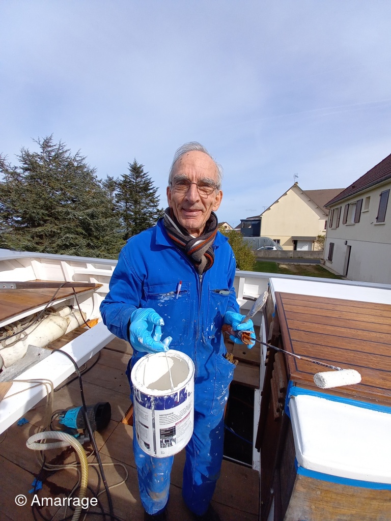 NEREÏDES: branchement électrique terminé - mise en place ligne d'ancrage - ponçage pont avant - peinture blanche sur le rouf - travail sur les espars. tout cela sent la mise à l'eau prochaine.
