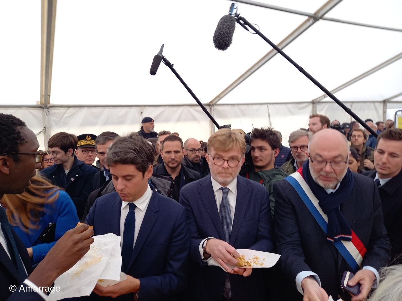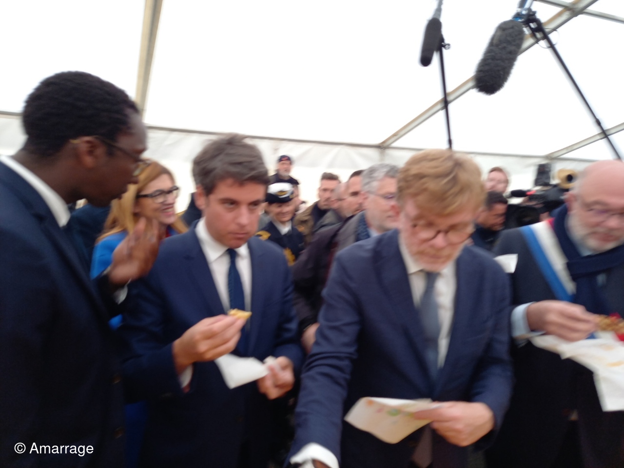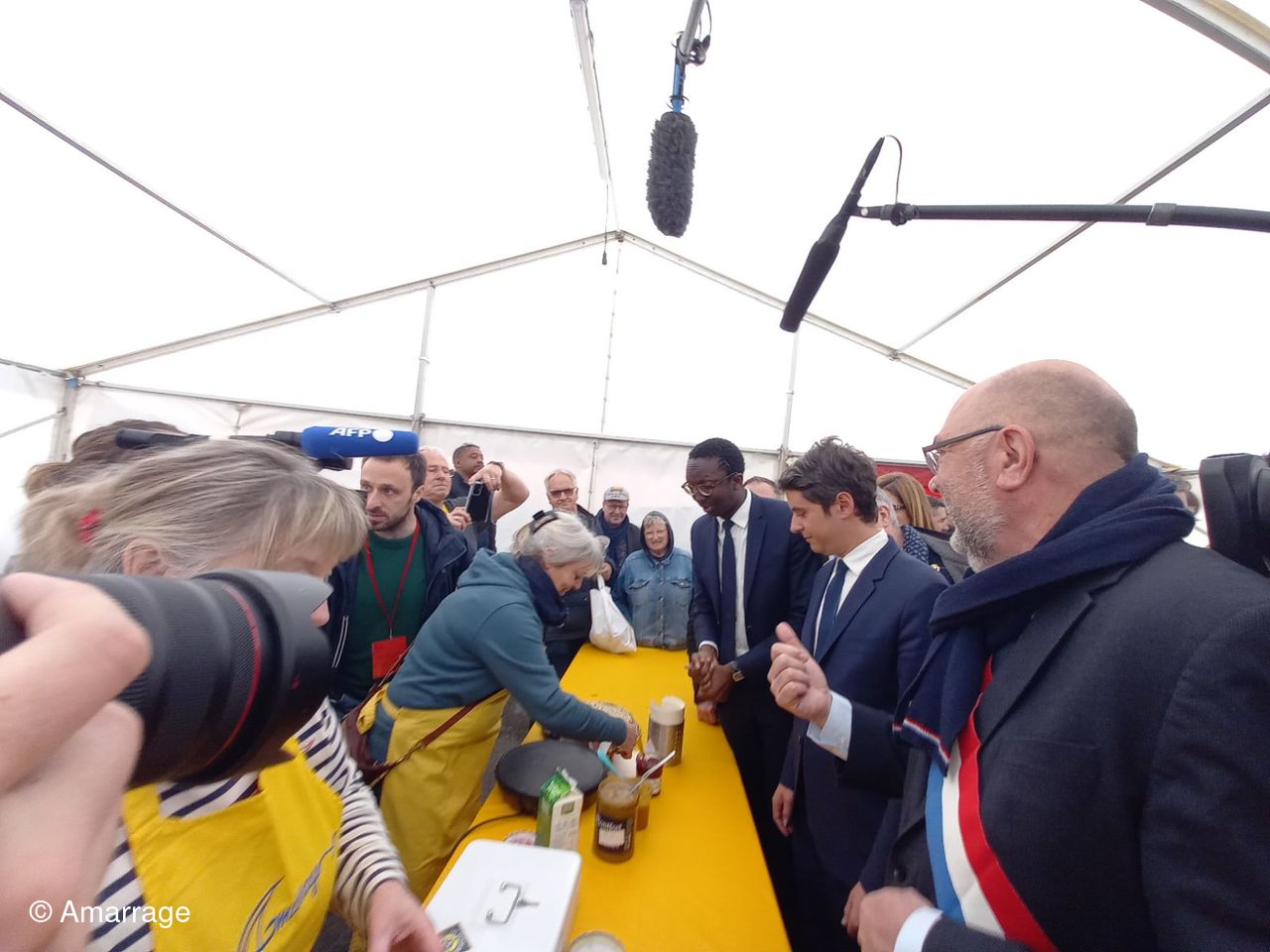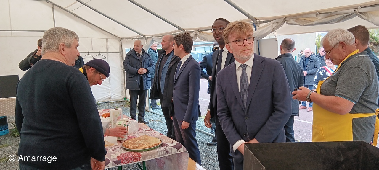 Nous avons eu la visite le samedi 27 de notre Premier ministre Gabriel Attal, accompagné par le Ministre de l'Agriculture Marc Fesneau et du Secrétaire d'Etat chargé de la mer Hervé Berville. Durant 2 heures ils ont sillonné les allées de la foire, et chanté avec nous "Santanio". Avant de quitter les lieux, ils se sont arrétes à notre stand "des crépières" et ont goûté à nos crêpes qu'ils ont fort apprécié. Ce n'était pas prévu au programme.