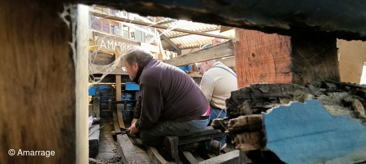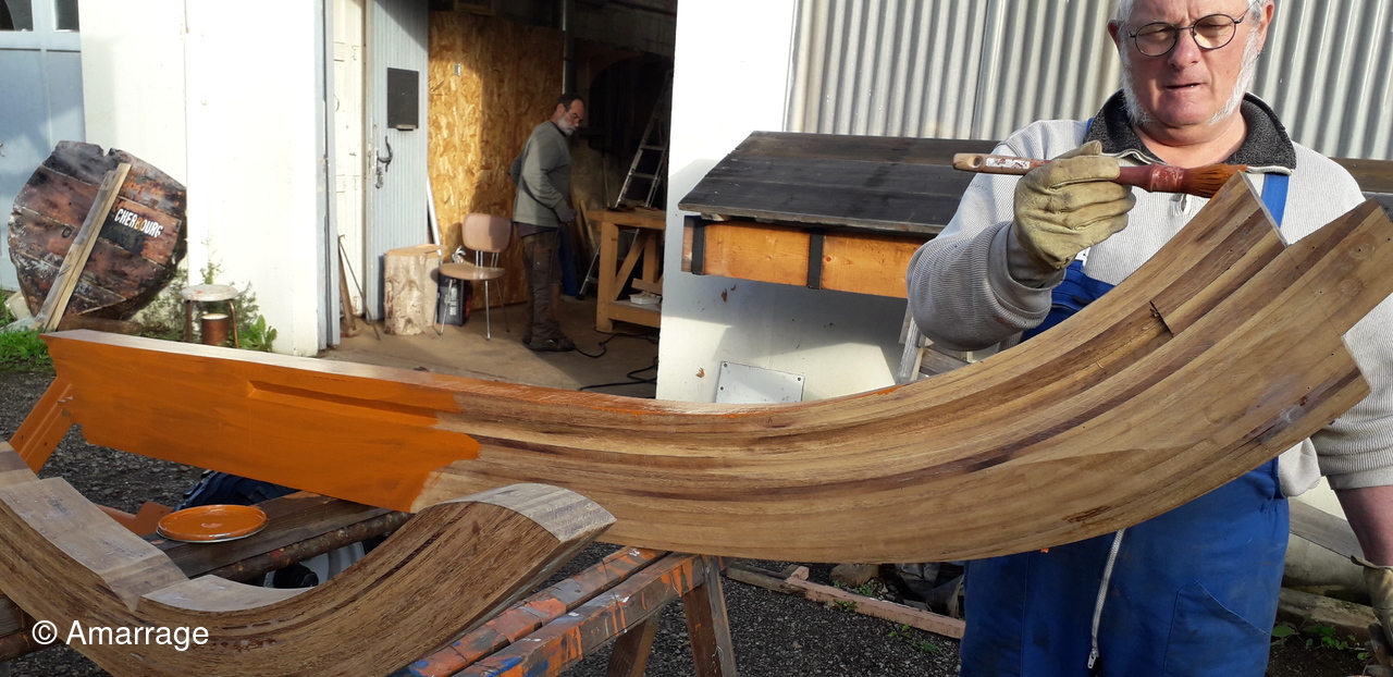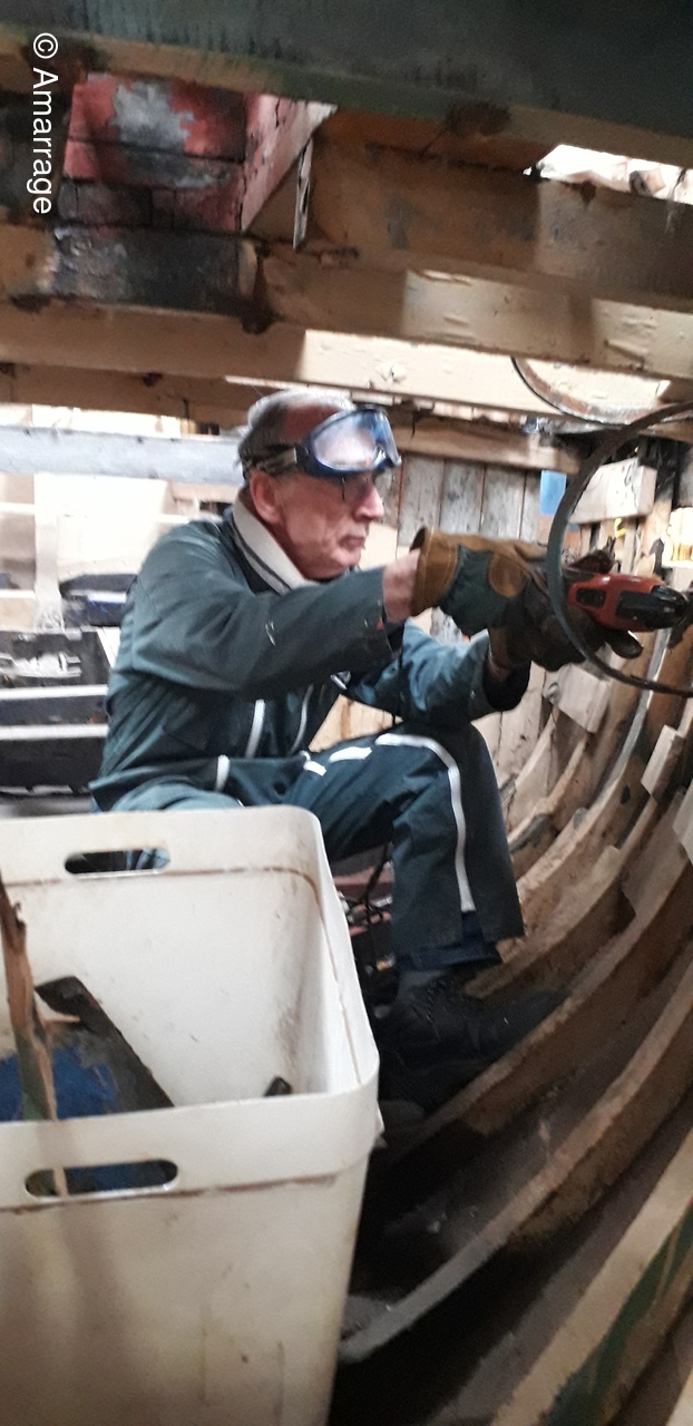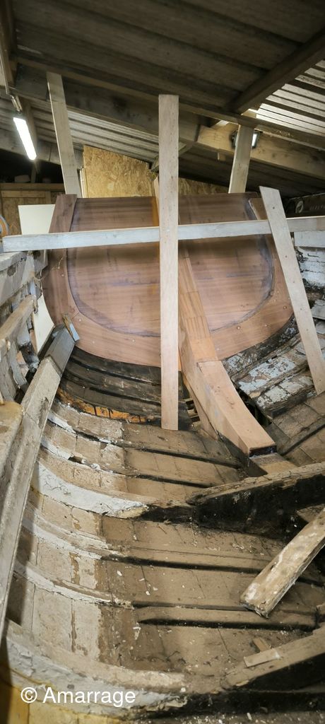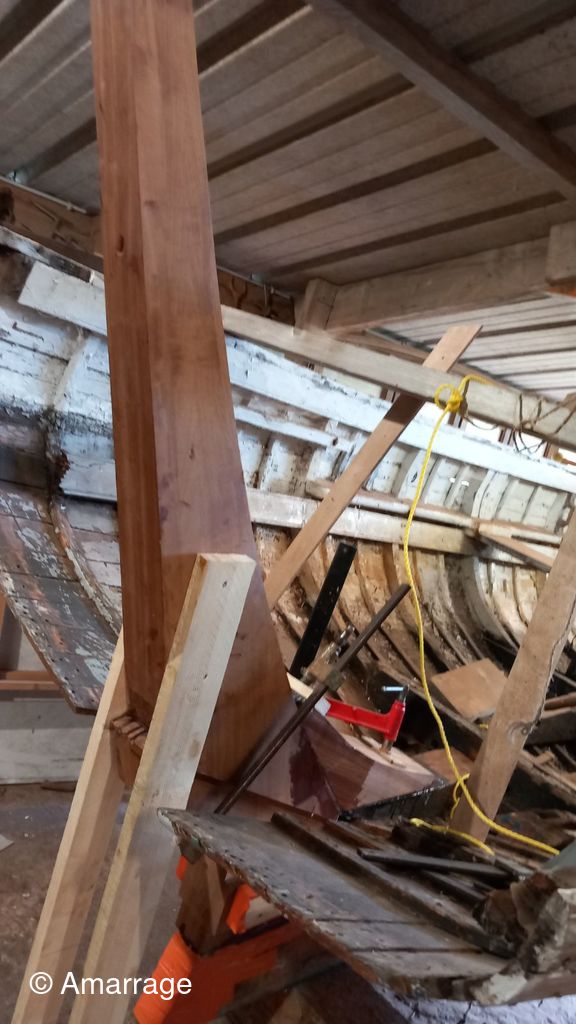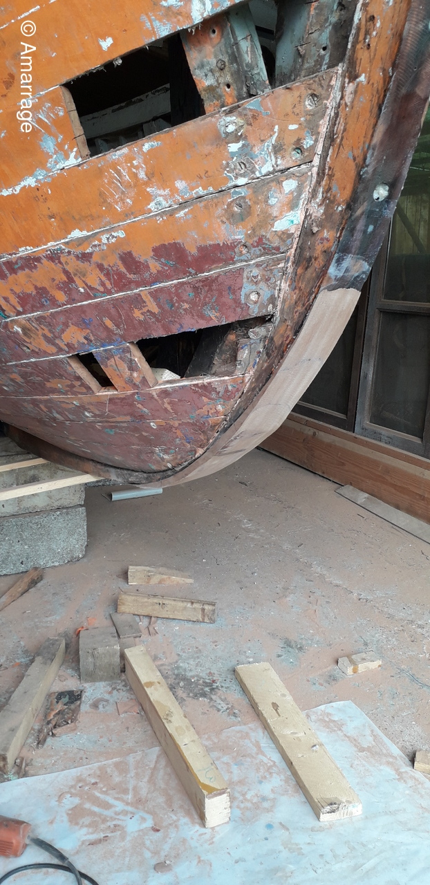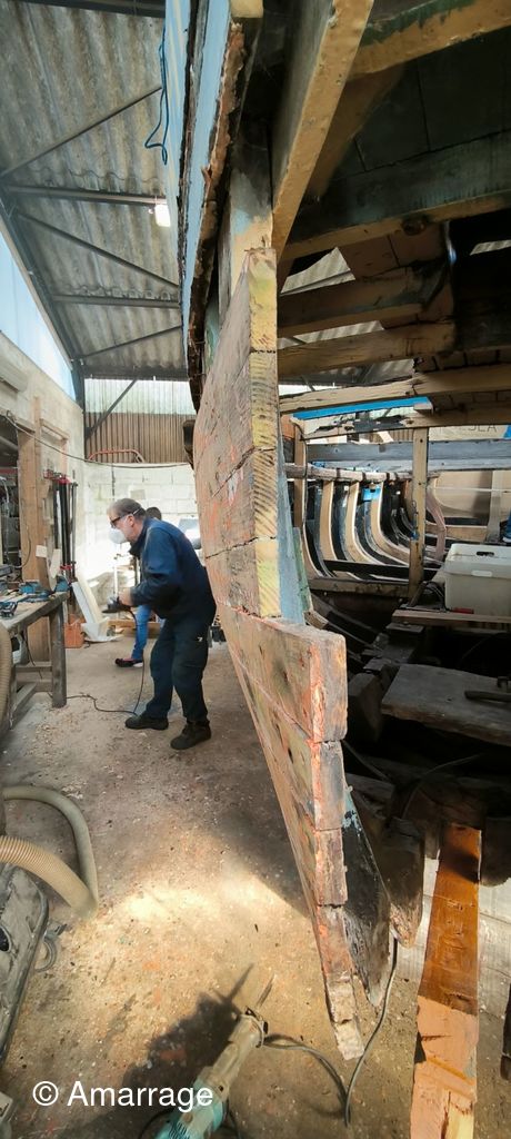 LA HAGUE: travail sur différentes membrures - présentation étrave et marsouin - dépose et mise en peinture.