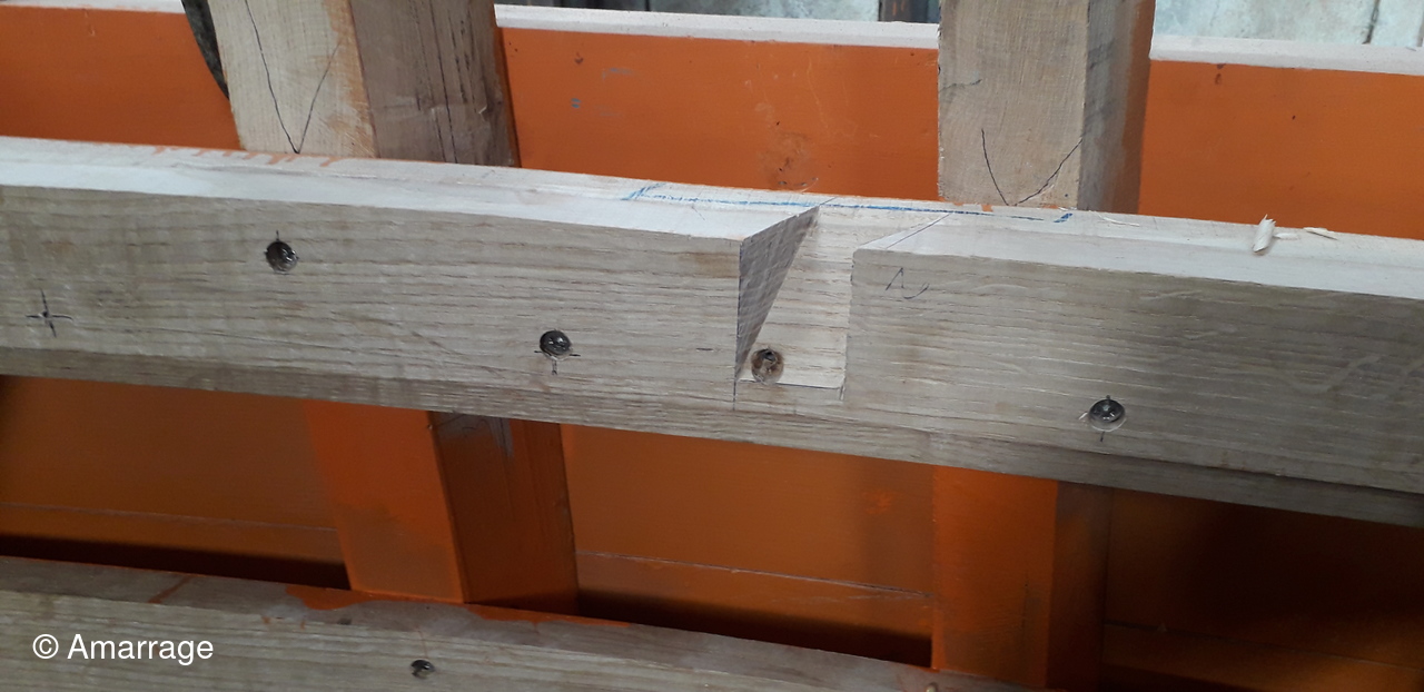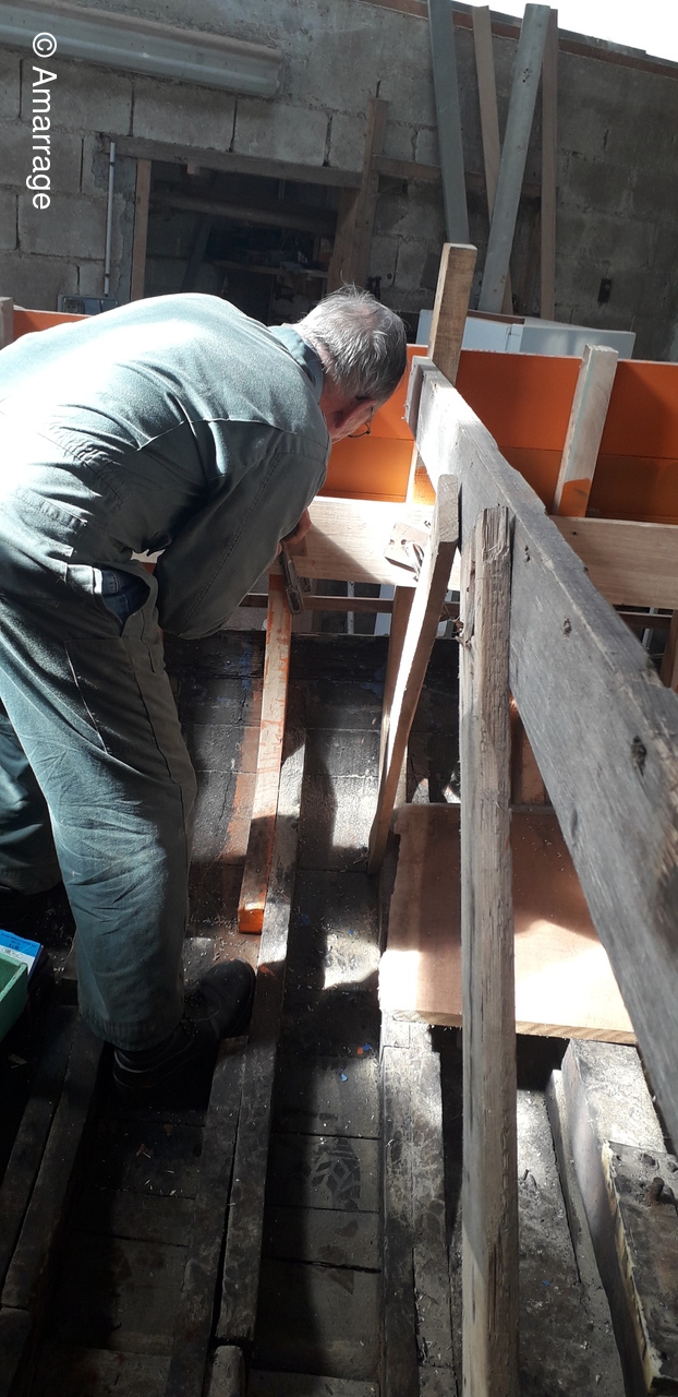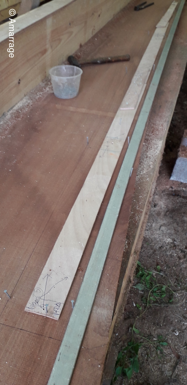 LA HAGUE: mise en place (provisoire) des listons Tb et Bd avant de fixer les serres - mise en place de la serre tribord. Les deux serres sont posées.