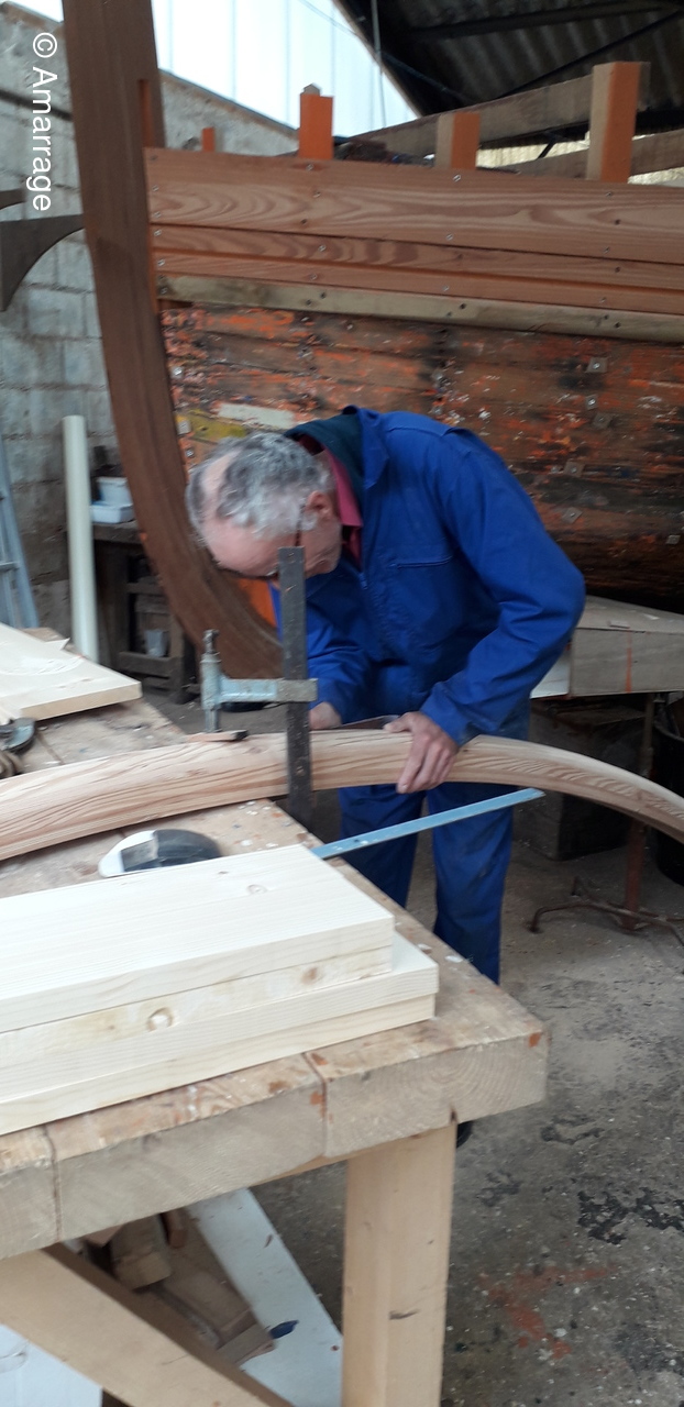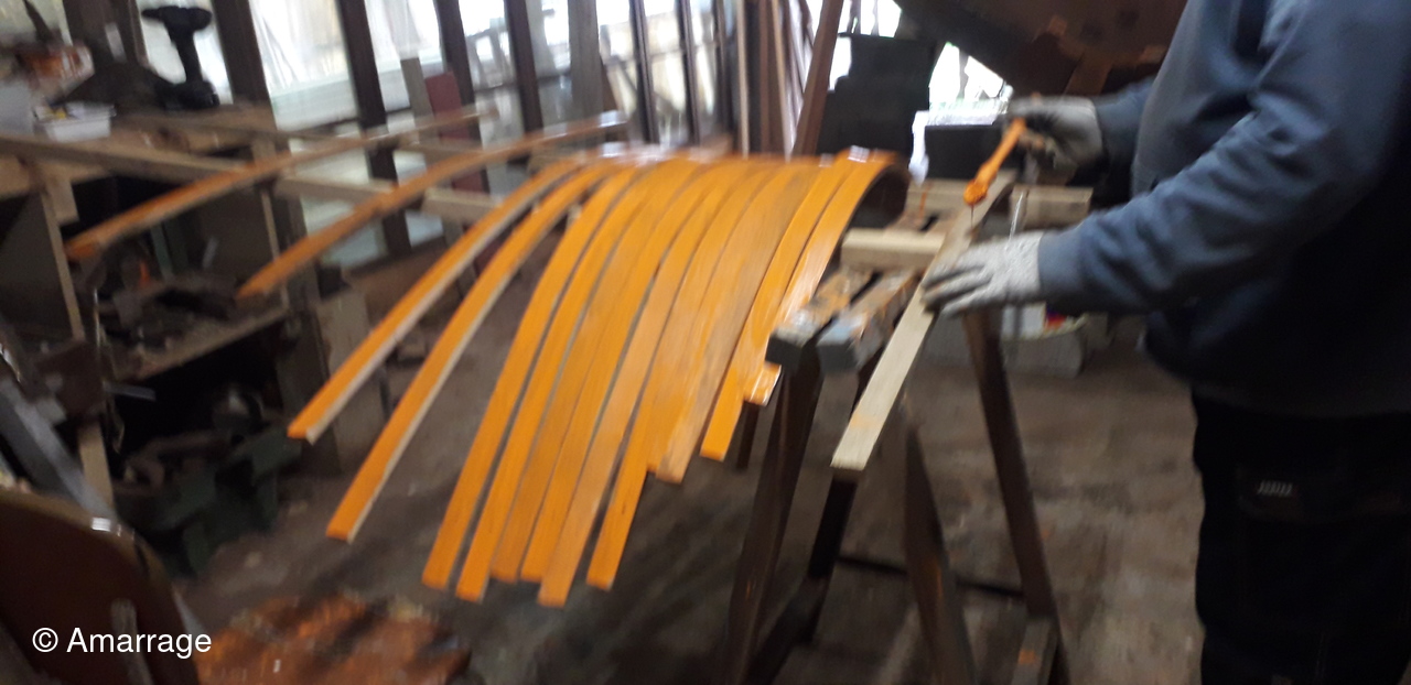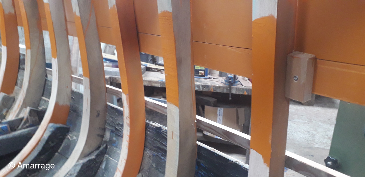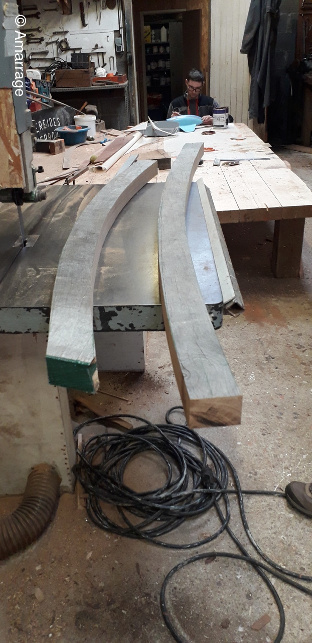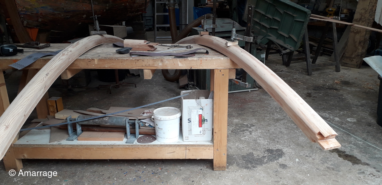 HAIZ DU RAZ: le bateau est fermé - fabrication de 37 membrures ployées - mise en chantier des barrots avant et arrière.