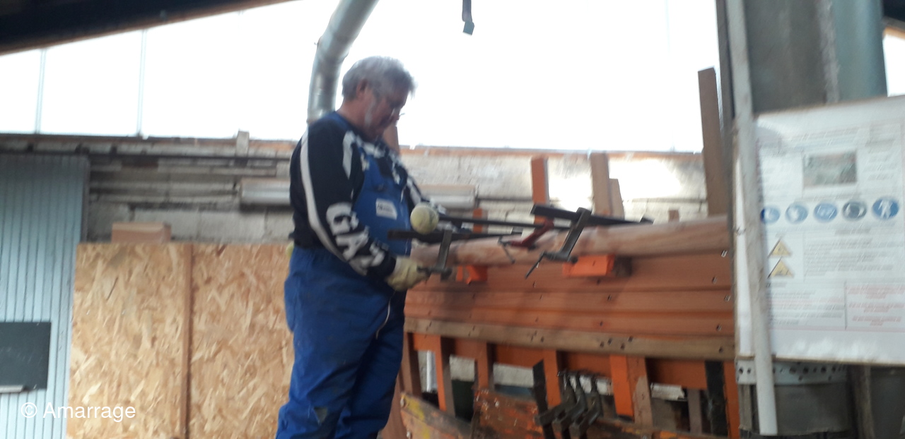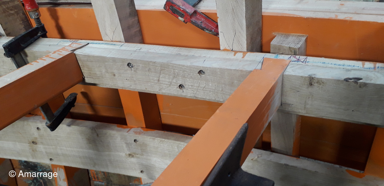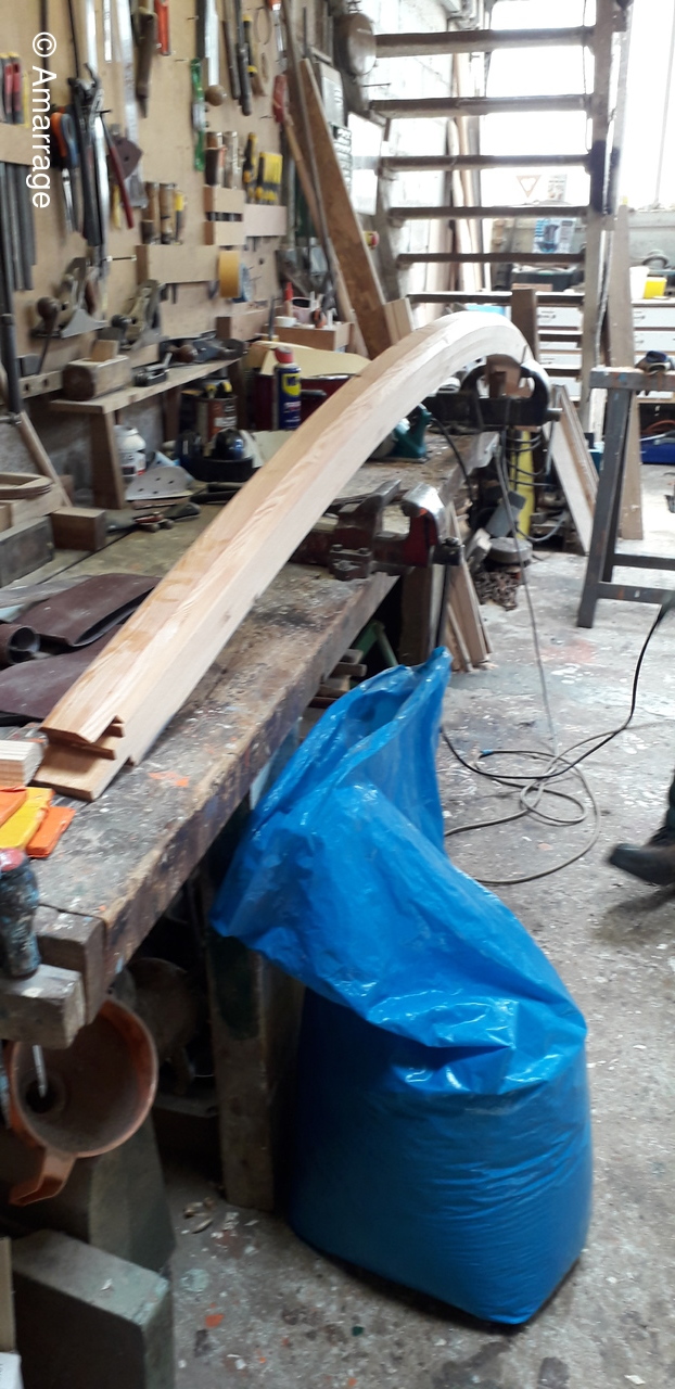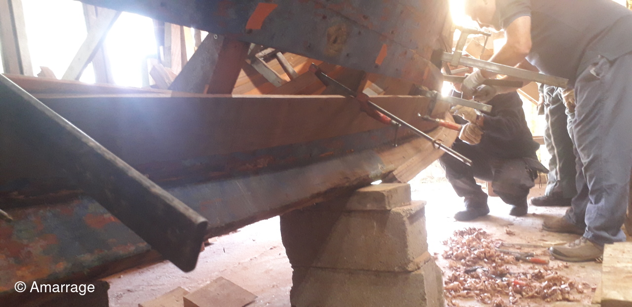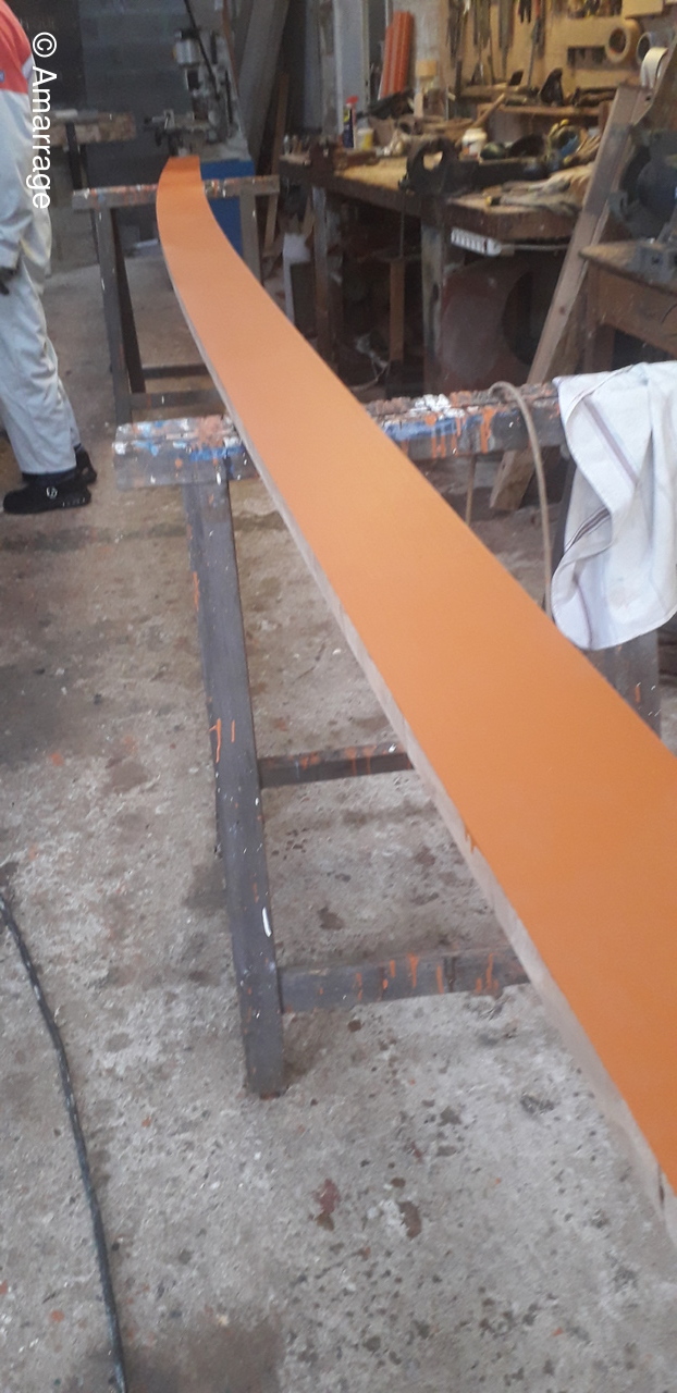 HAIZ DU RAZ: le bateau est fermé - fabrication de 37 membrures ployées - mise en chantier des barrots avant et arrière.
