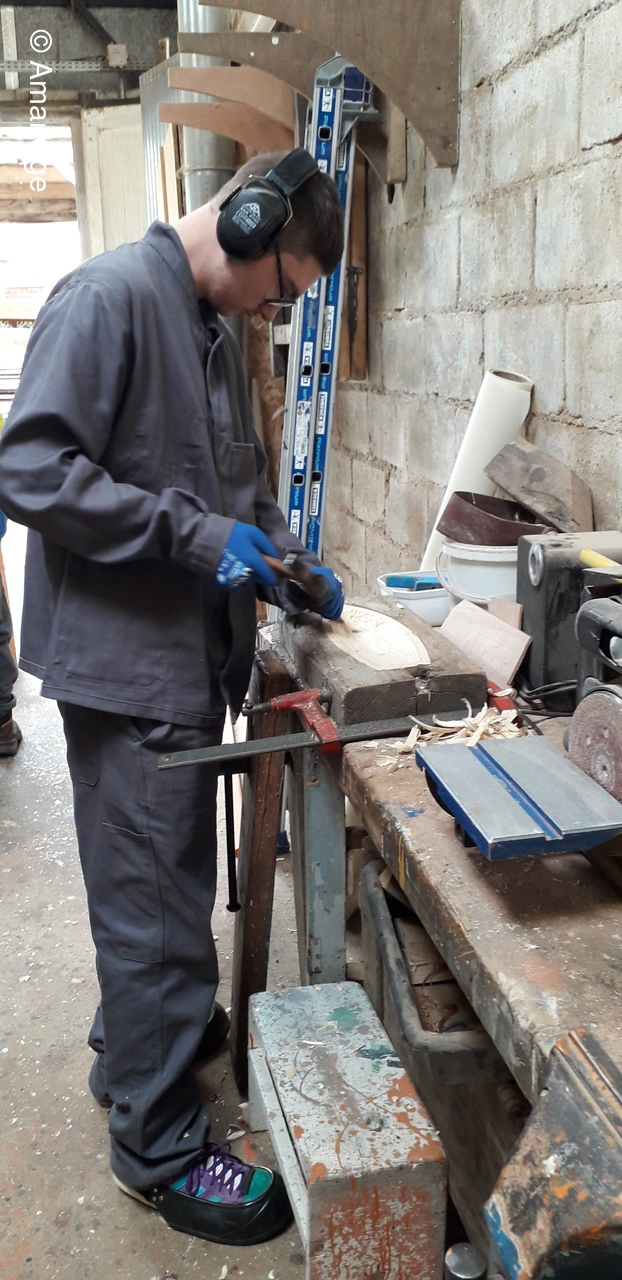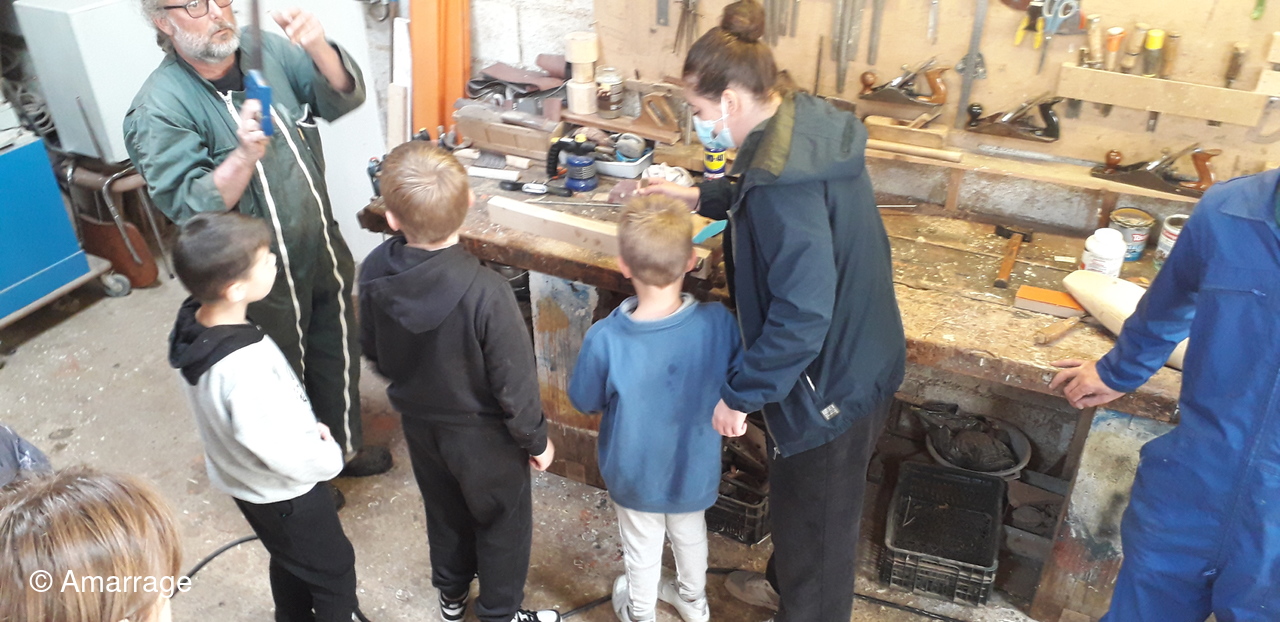 ATELIER: visite de l'atelier par des enfants de la Fondation Bon Sauveur de Picauvile et leurs accompagnatrices - bateaux jouets - divers travaux