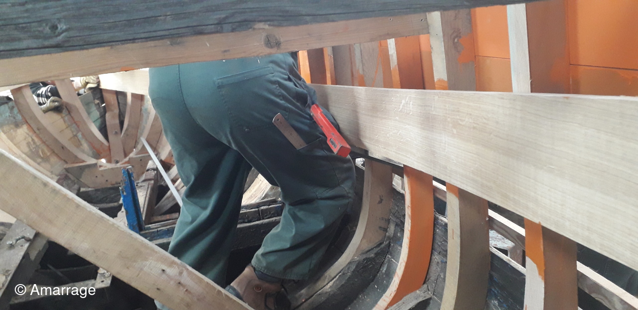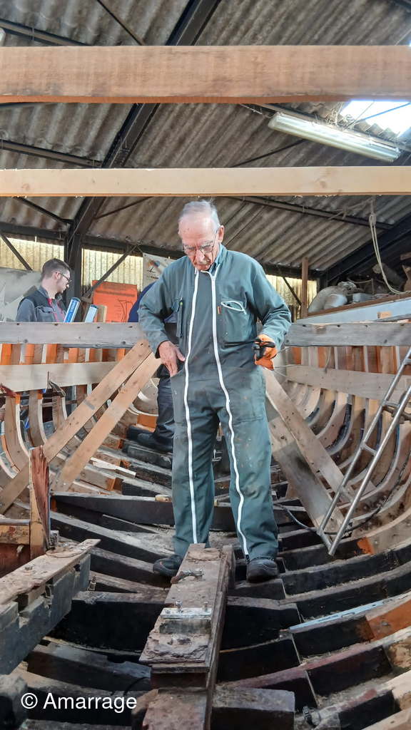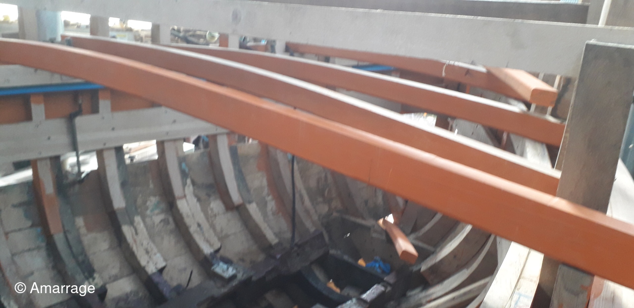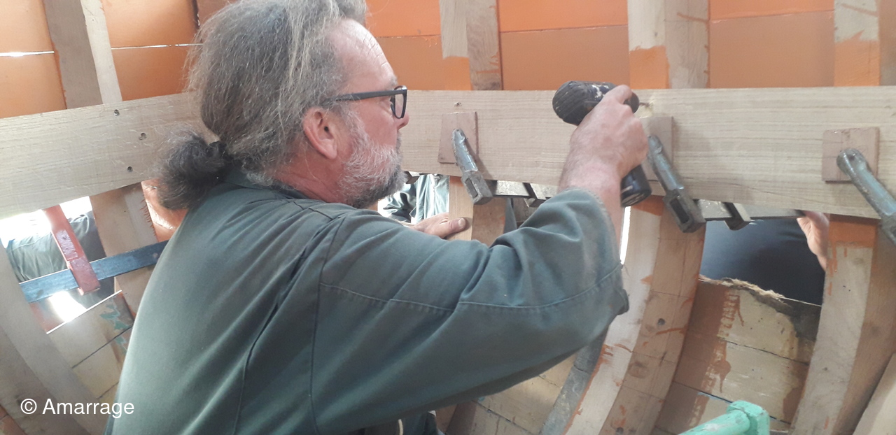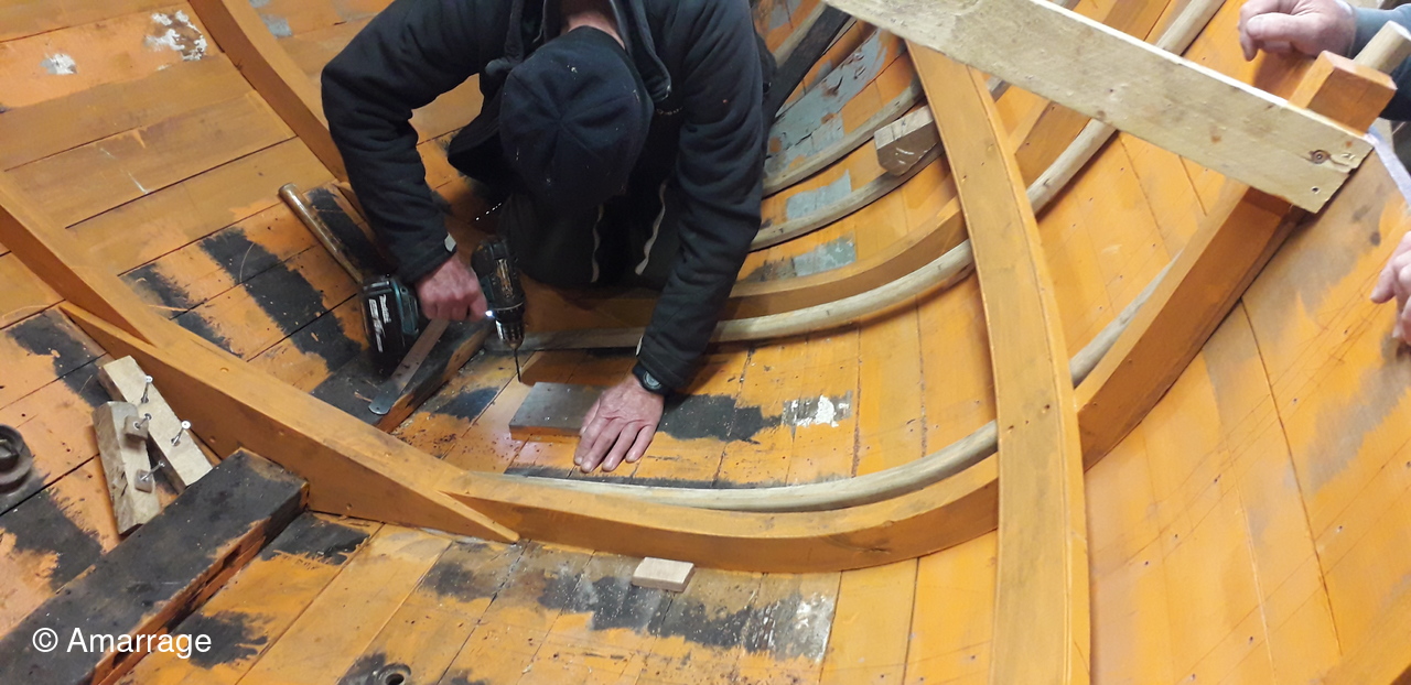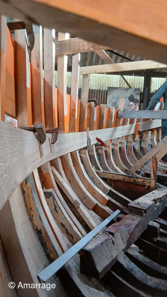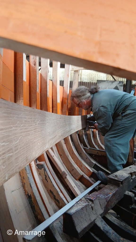 LA HAGUE: pose de la dernière membrure et pose de la serre de bâbord.
