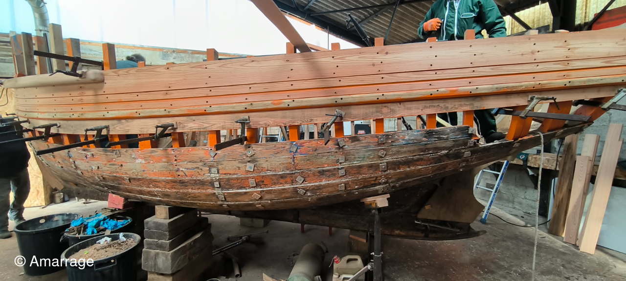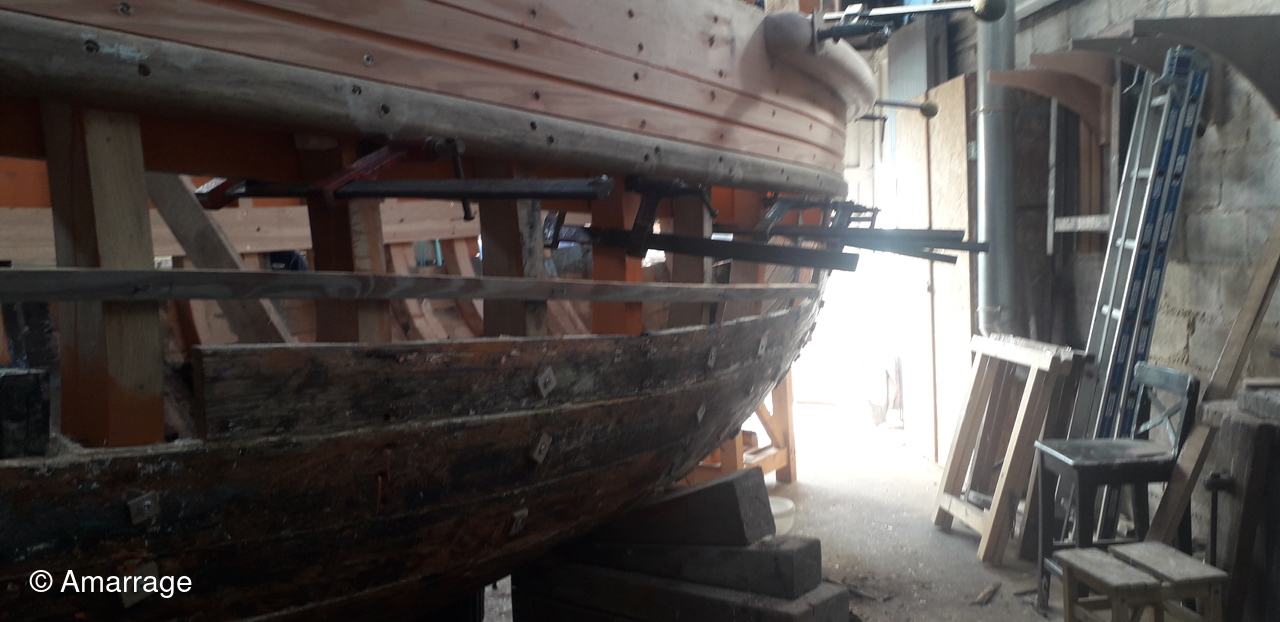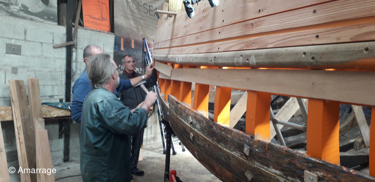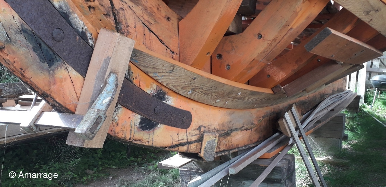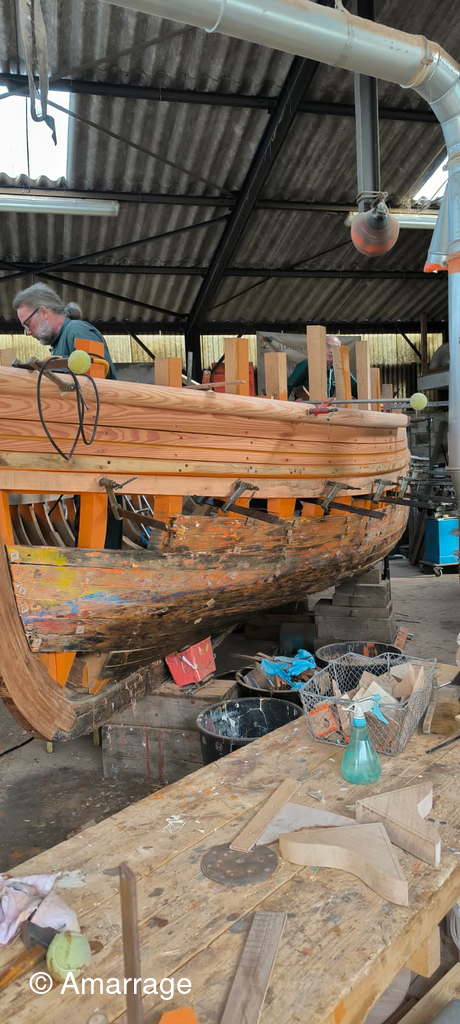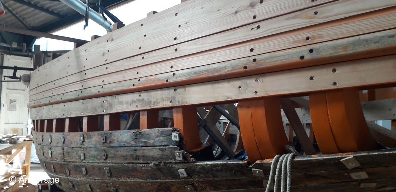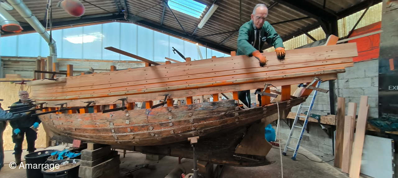 LA HAGUE: pose de la dernière membrure et pose de la serre de bâbord.
