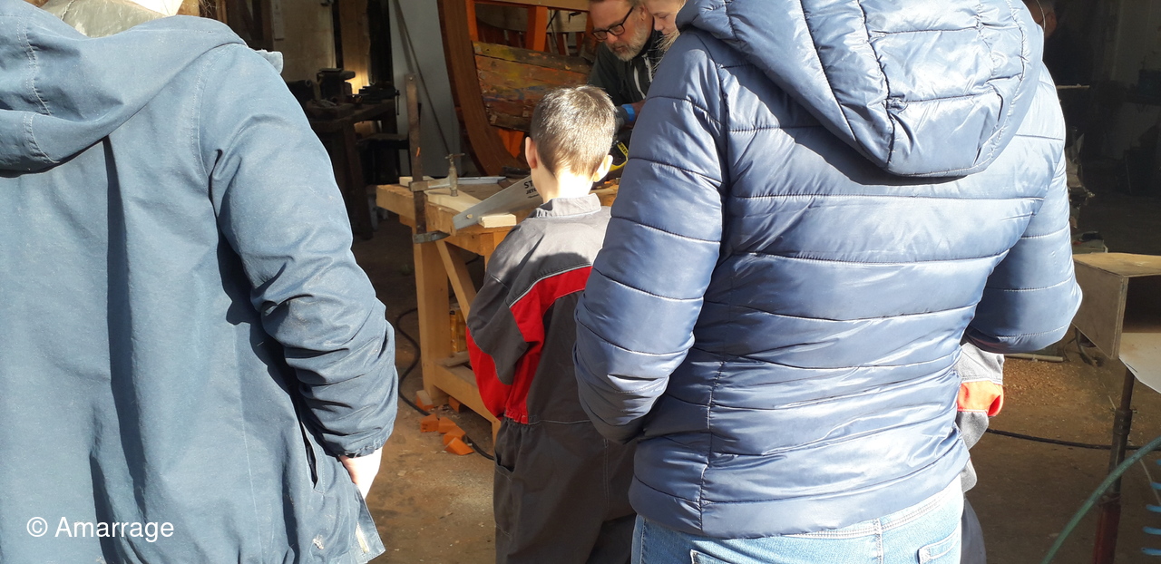ATELIER: visite à l'atelier d'un groupe de 4 enfants et leurs accompagnatrices ( l'hôpital de jour Fondation Bon Sauveur) - bateau jouet - divers petits travaux.