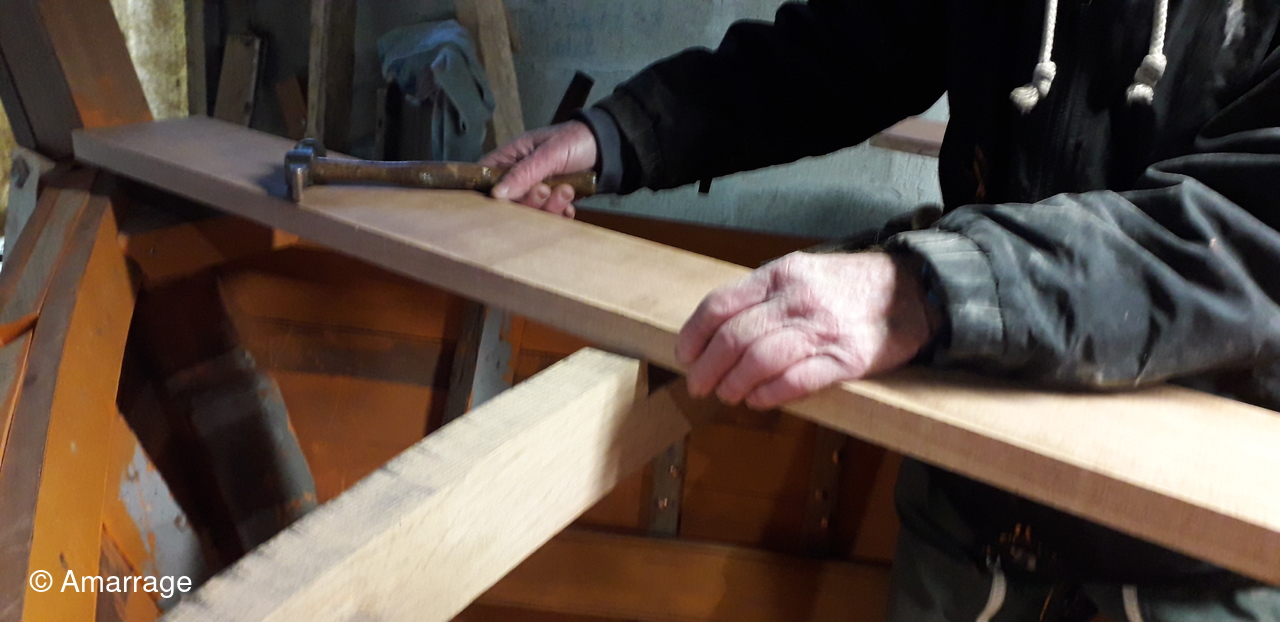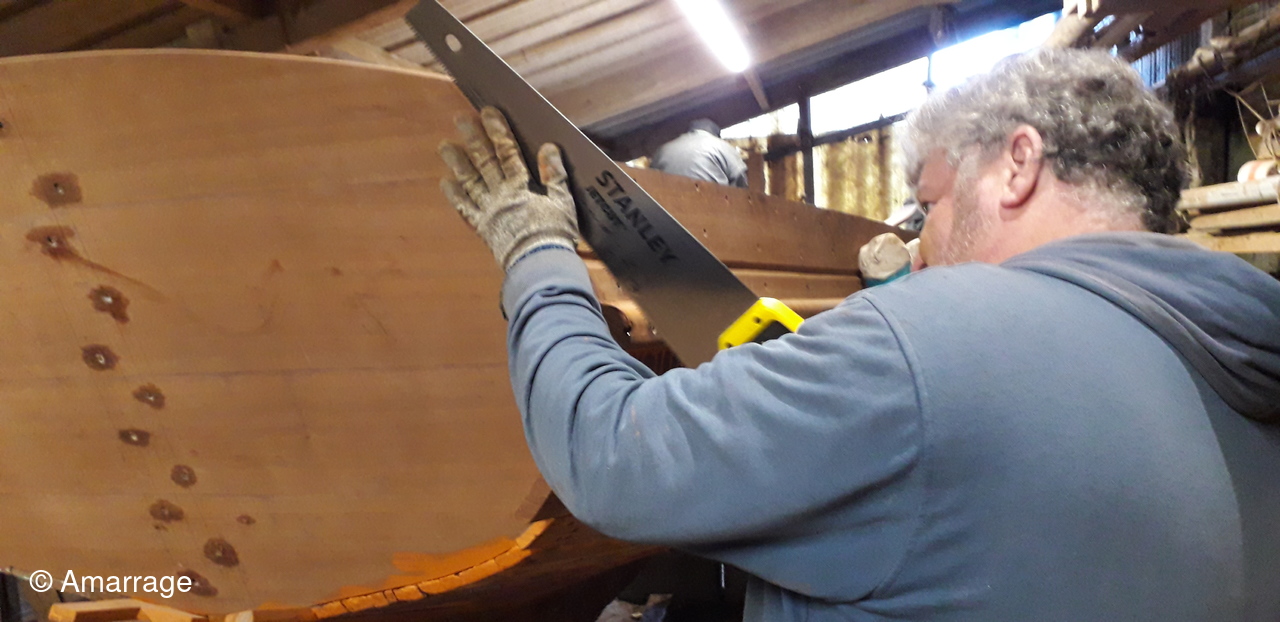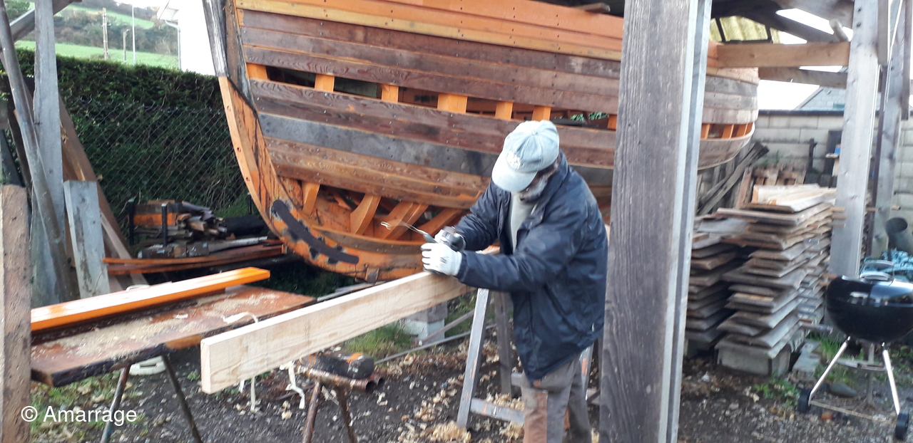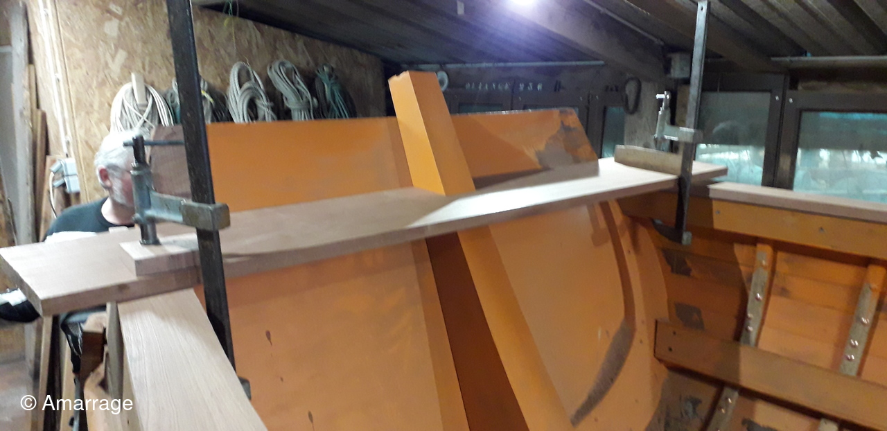HAIZ DU RAZ: fabrication : plat bord Bd et Tb - planche de couronnement - pièce de bois pour le pont avant - mise en forme tableau arrière - travail sur les bordés qui "débordent".