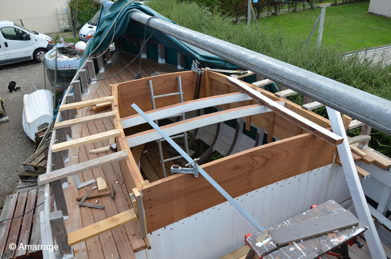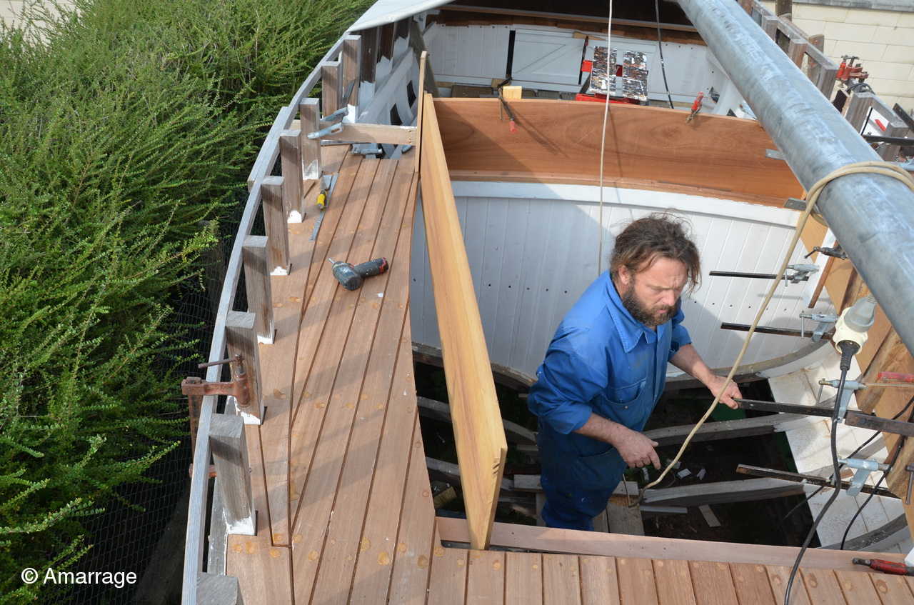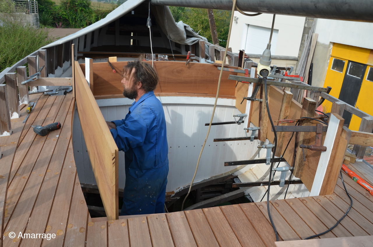 Ce mois ci, Olivier a posé les illoirs de roof et a commencé à mettre en place les barreaux. Michel et Dominique ont travaillé sur le banc arrière avec notamment la pose de portes sous le banc. Celles du roof sont également en chantier. Parallèlement, les jours de mauvais temps lorsque le travail n'est pas possible sur la Nereides, on s'active sur "Le gai marin", bateau d'un adhérent en réfection complète dans l'atelier. Les photos montrent les travaux de remplacement du tableau arrière ainsi que la greffe réalisée sur l'étrave. Le calfatage du pont de la Nereides est en route. Et puis, l'atelier ne serait pas l'atelier sans la popote et les bateaux jouets.....Merci Alex pour les croissants..... Au mois prochain......