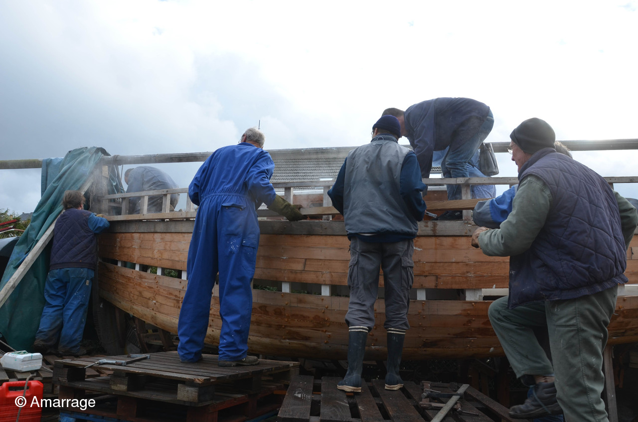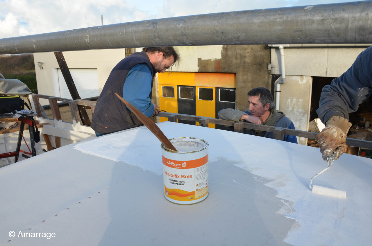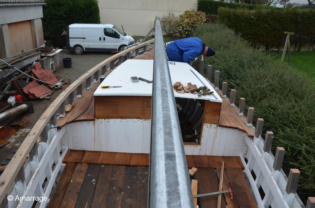 Reprise du chantier après un repos de fin d'année bien mérité.... Profitant du beau temps de vendredi, nous avons réalisé l'entoilage du roof. Une technique ancienne qui permet de d'étancher le bateau avec....De la peinture et de la toile de voile!!! Le bois est d'abord peint puis la toile posée et clouée sur le champ avec de la semence en cuivre. Il ne reste plus qu'à saturer de peinture la toile qui devient étanche. Le Gai marin avance aussi, la courbe d'étanbot est posée et les vieux bordés ont été déposés. Il commence à reçevoir ses premières membrures ployées. Jetez également un oeil sur la photo du capot du roof....Elle ne va pas être magnifique notre Nereides????? 17 01: Aujourd'hui, tout le monde est là pour une nouvelle étape, nous étuvons les bordés de plat bord. Les pièces de bois passent 6 heures à l'étuve et sont mises en forme le plus rapidement possible. Elles sont fixées provisoirement à l'aide de serre joints sur les membrures, juste en dessous de leur place définitive. Une fois refroidies, elles garderont leur forme et pourront être travaillées pour la fixation finale. Ce jour a aussi été consacré à la mise sous enveloppe des convocations en vue de l'AG. Deux stagiaires du LEP Doucet, travaillent sur le Gai marin, ils rivetent des membrures. Quant à Elsa....elle assure toujours autant à la fabrication de tapons.... 31 01: Un bon mois pour le chantier, les lisses de plat bord de la Néreides sont terminées, celle babord est posée. Le Gai marin avance bien grâce aux deux stagiaires du LP Doucet, ils s'activent sur le rivetage des membrures. Toutes les anciennes ont été déposées rendant le bateau très photogènique pour quelques jours encore.... L'étambot est percé. Rendez vous le mois prochain pour d'autre aventures......