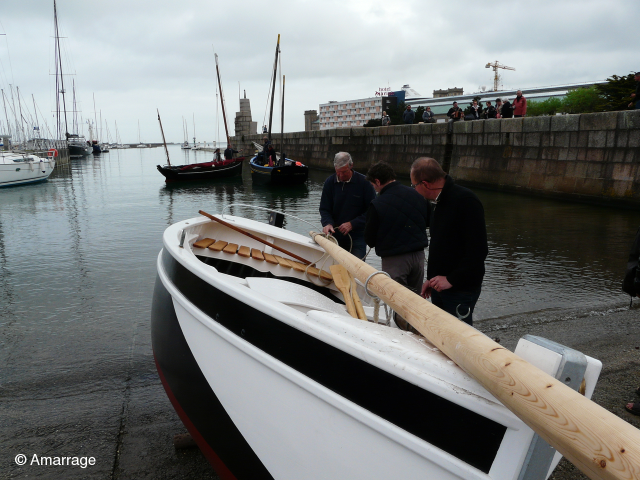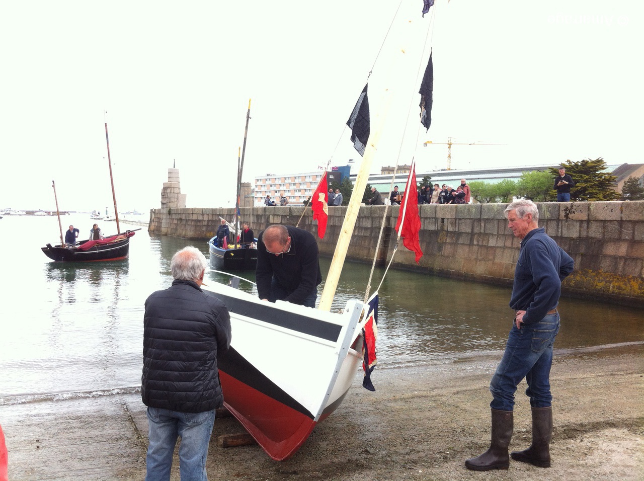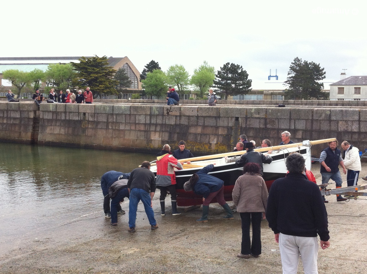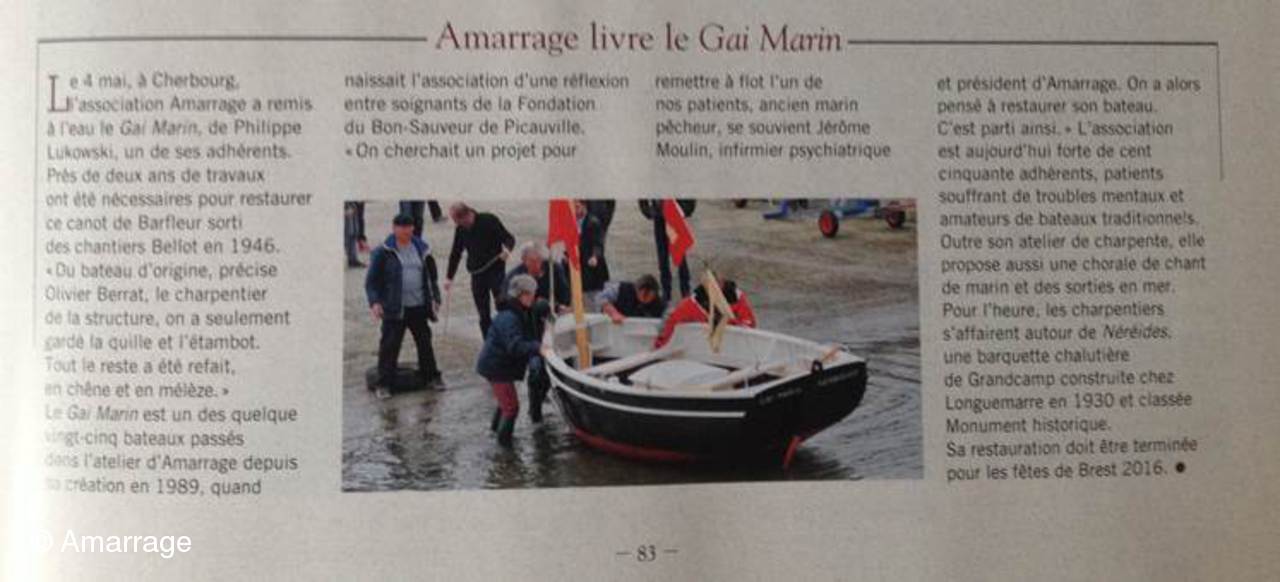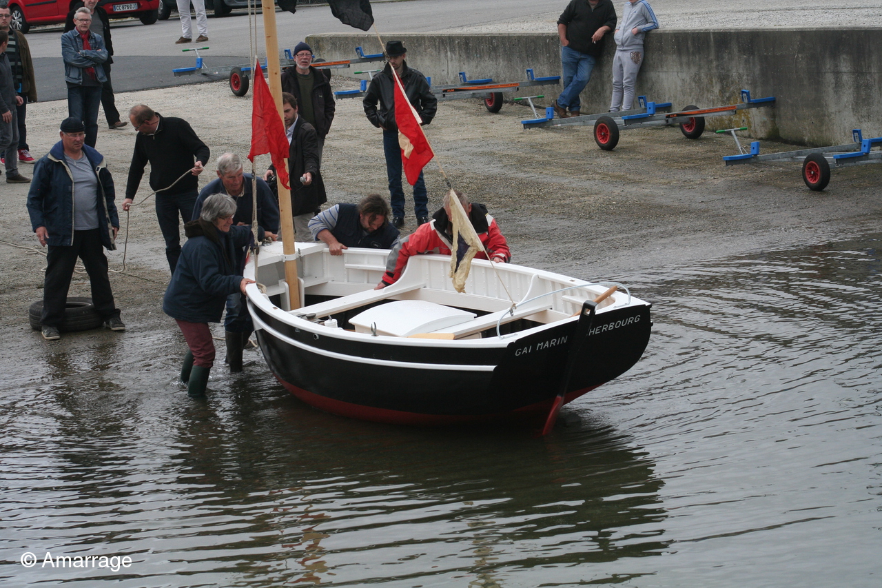 Lundi 04 mai, tout le monde se retrouve à la cale de l'école de voile pour un petit évènement: la remise à l'eau du Gai Marin, bateau appartenant à un adhérent. Cette renaissance vient conclure deux ans de travaux à l'atelier qui ont permis de sauver le bateau d'une mort certaine. C'est un navire flambant neuf qui a retrouvé l'élément liquide attendu par deux vaquelottes venues spécialement de Barfleur pour l'accueillir. Quelques membres de la chorale étaient présents pour saluer le bateau en chansons.