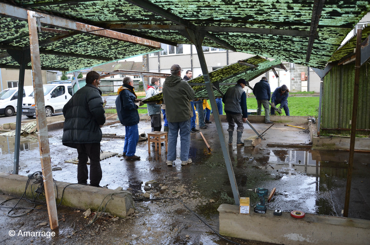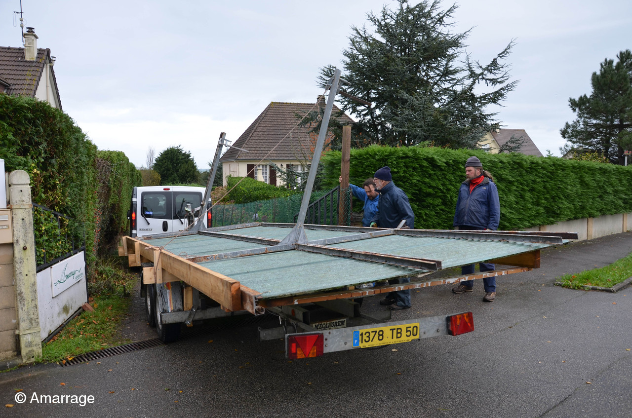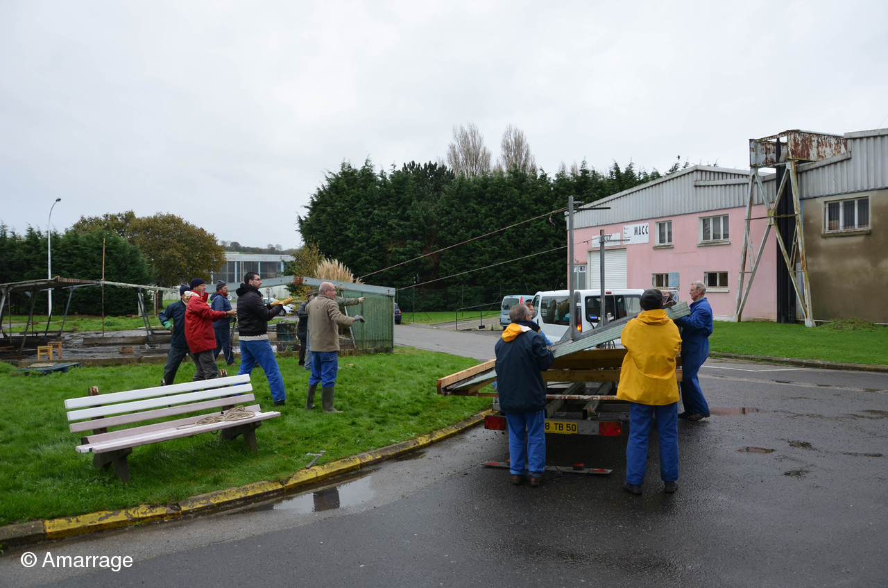 Mardi 24 novembre nous sommes allés démonter un hangar à vélos (vendu par le secours populaire) afin de fabriquer un toit provisoire pour pouvoir travailler cet hiver sur la Nereides. Bon nombre d'adhérents on répondu présent à l'appel d'Olivier....Tout l'esprit d'Amarrage: Vous demandez un petit coup de main...et il vous arrive 15 bonhommes!!!