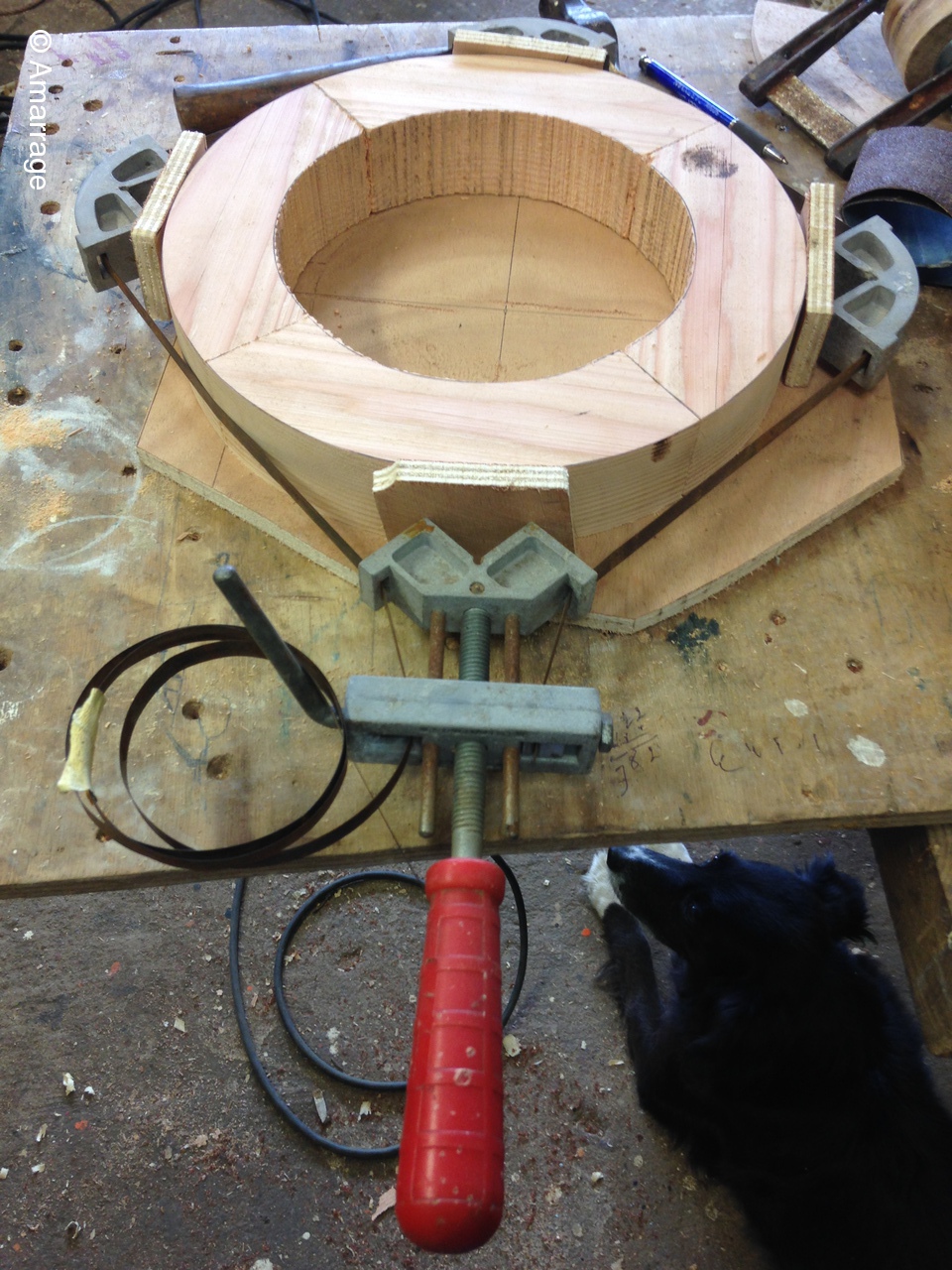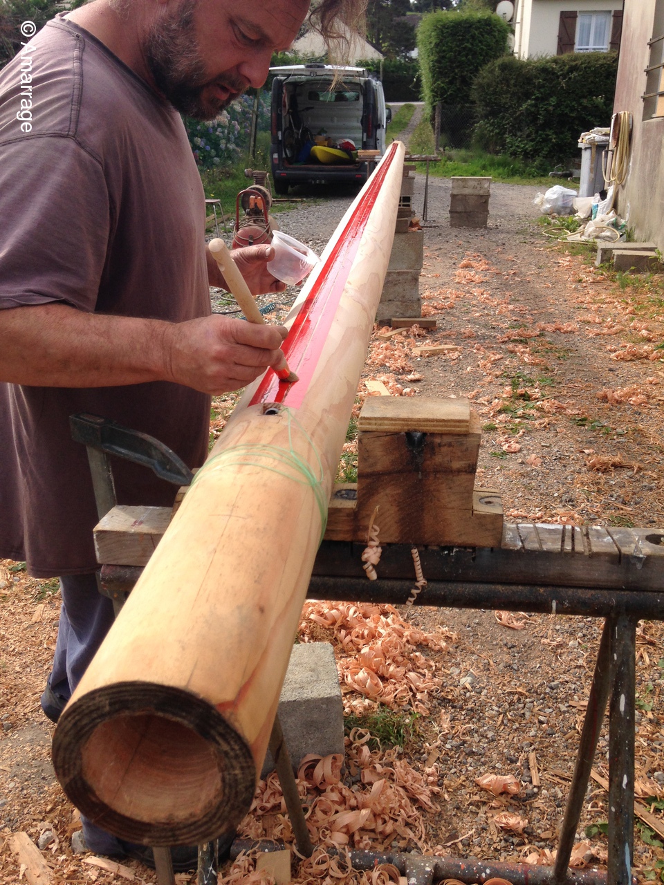 30 août: Quelques photos du mât...Voilà ce que c'est quand ça travaille trop vite...Le photographe arrive à la fumée des cierges. Il reste tout de même des traces du système ingénieux qui a servi au poncage. Il a été monté sur un axe façon tourne broche et pendant que les costauds tournaient...D'autres ponçaient sur toute la surface...Il va s'agir maintenant de faire une rainure à la défonceuse pour passer les cables des feux de mât. Les bastaings sur le côté serviront de guide.