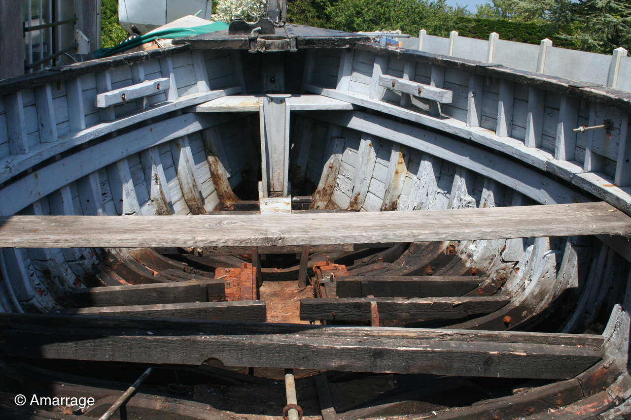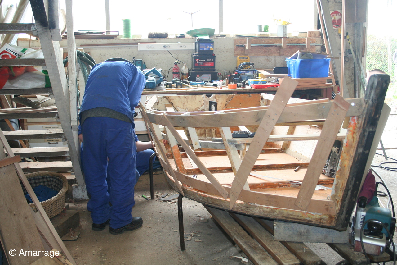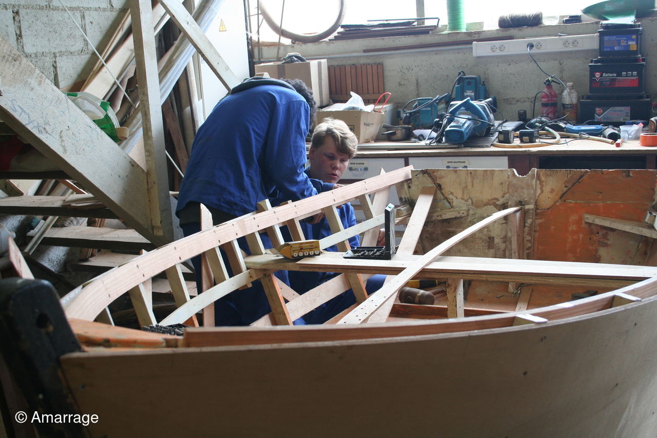 - On s'active sur le "Christiane". Le perçage de l'étambot pour l'arbre d'hélice est terminé. Travail sur les bordés.