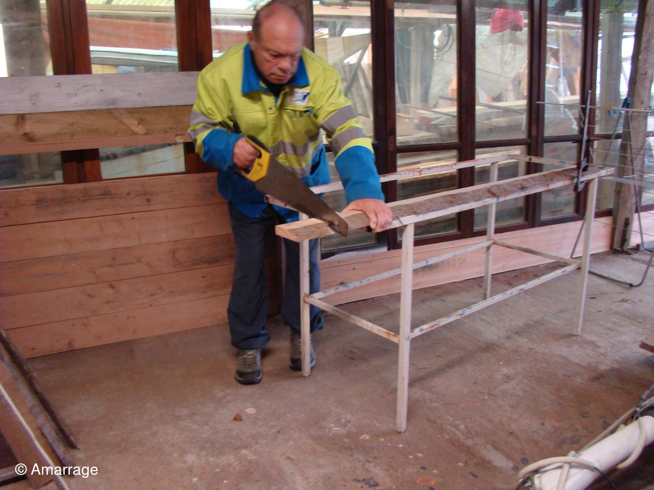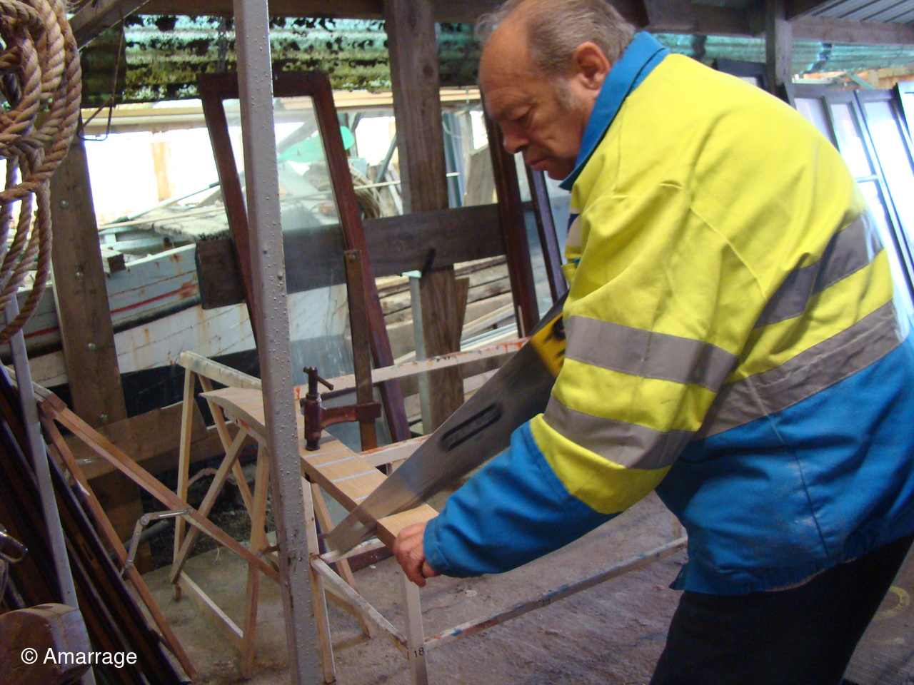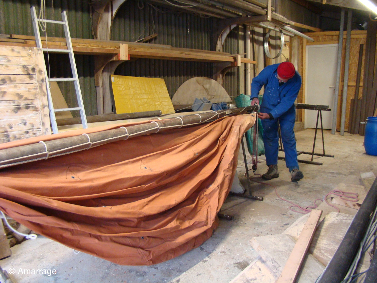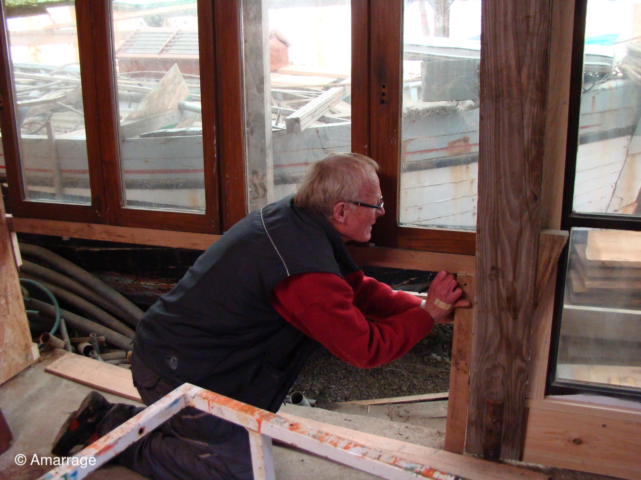 - Dans les arrières de l'atelier, pose d'une séparation séparant 2 appentis. Celà fera une isolation (courants d'air) entre la partie stockage du bois et restauration bateaux. On devine l'ANGELUS" bateau emblématique d'Amarrage.