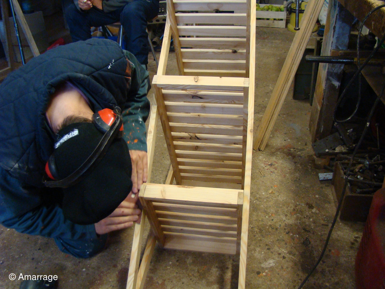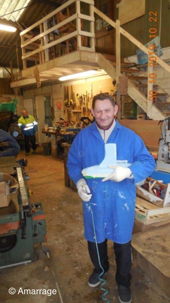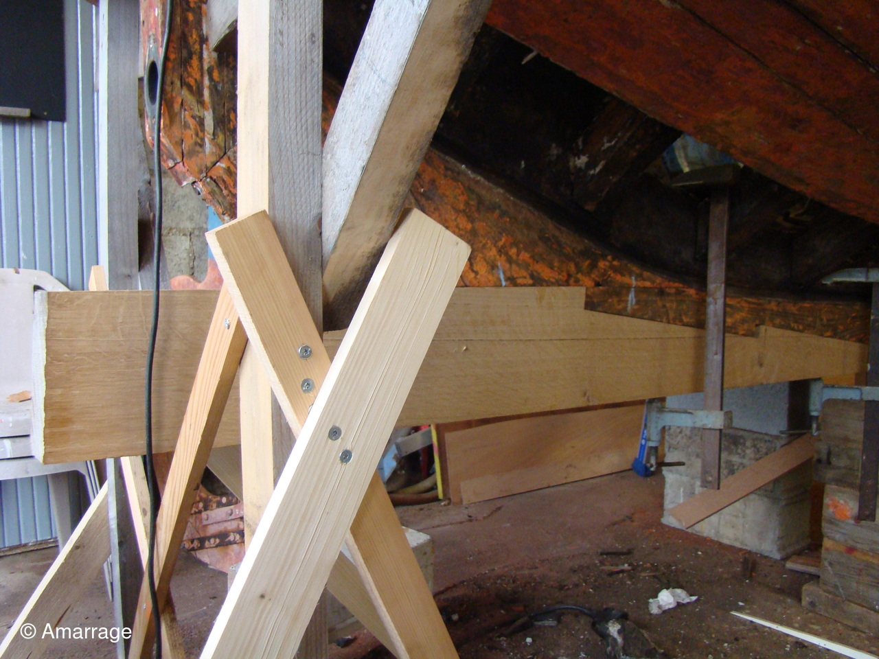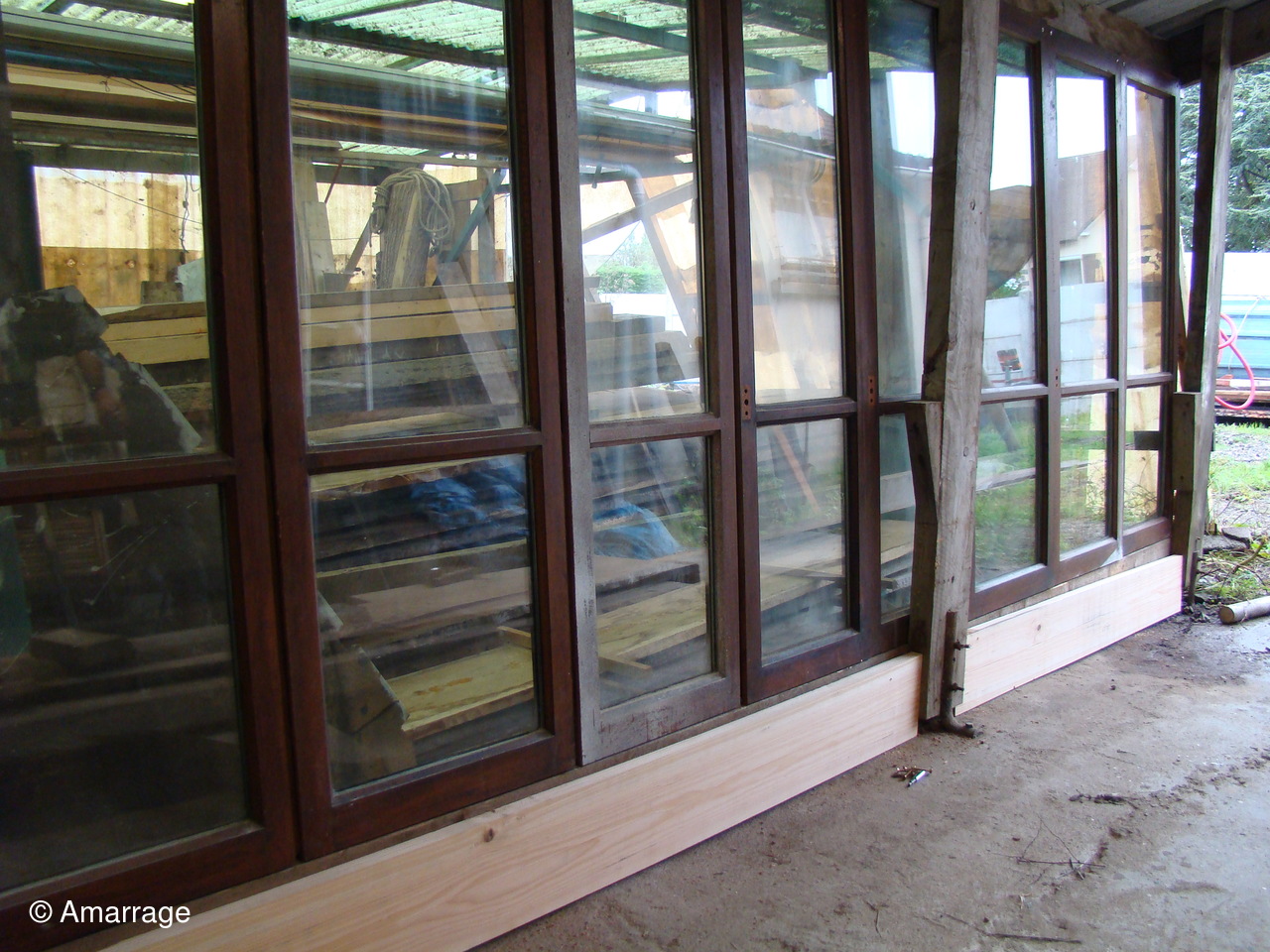 - Dans les arrières de l'atelier, pose d'une séparation séparant 2 appentis. Celà fera une isolation (courants d'air) entre la partie stockage du bois et restauration bateaux. On devine l'ANGELUS" bateau emblématique d'Amarrage.