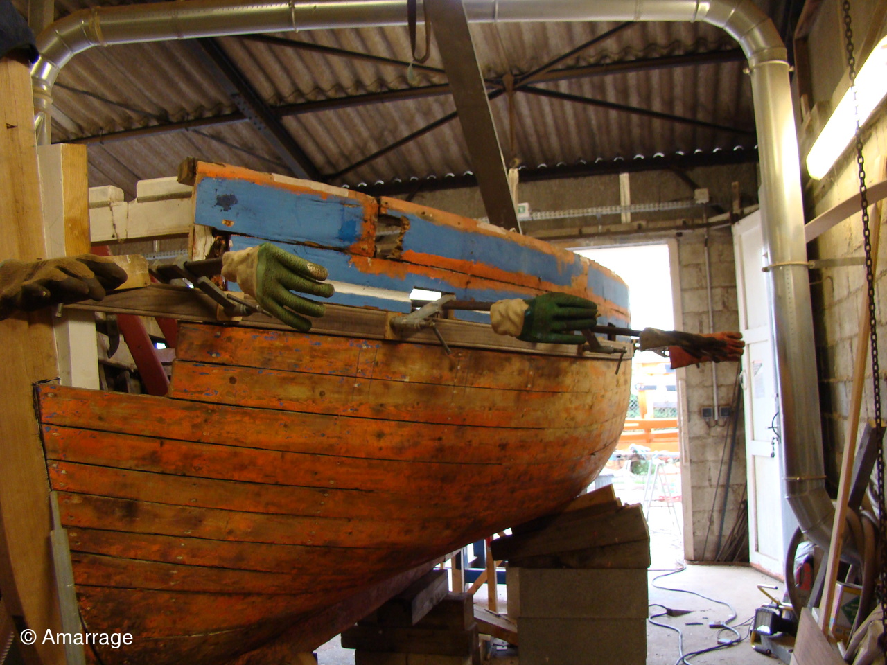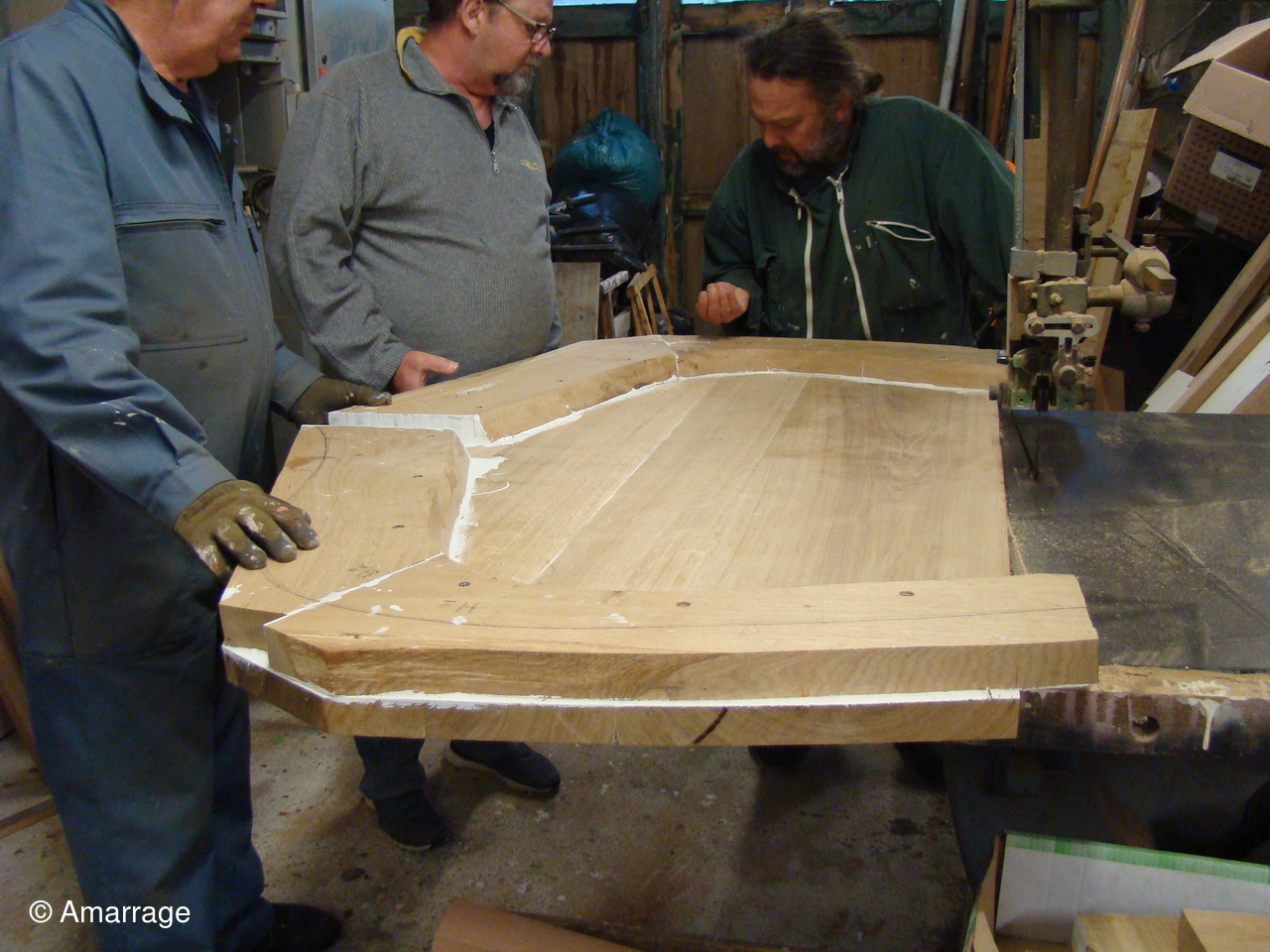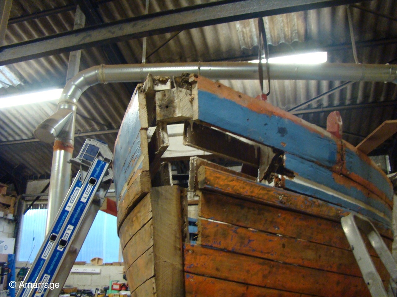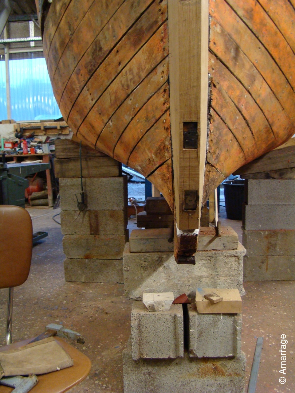 "MARIE-JOSEPH": travail sur une pièce de la quille; le fond de cale bien nettoyé, il a perdu quelques éléments. Assemblage du tableau arrière. La prise de forme se poursuit.