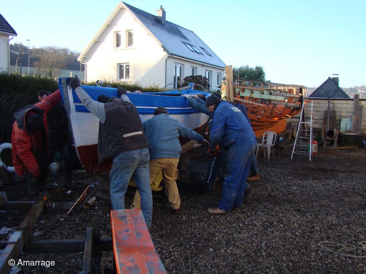 "MAGIE LES SANSONS" : mise sur remorque,( par un temps froid) car il quitte l'Atelier d'Amarrage pour être récupéré par son propriétaire.