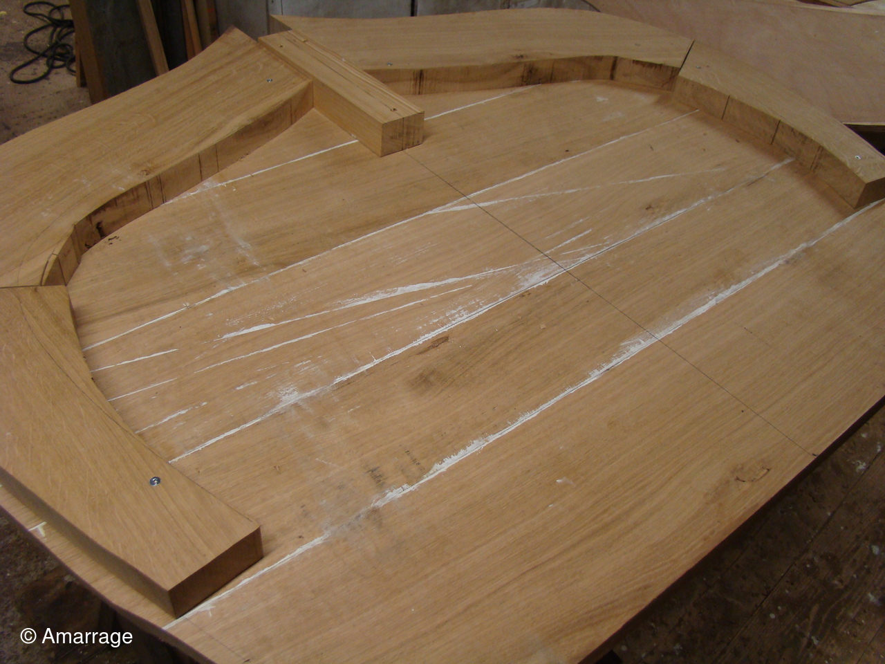 "AWASSA": collage pièce sur l'étambot; assemblage des pièces qui forment le tableau arrière. Réalisation et façonnage des estains. Mise en place d'un estain. Façonnage d'un 1/2 tableau.