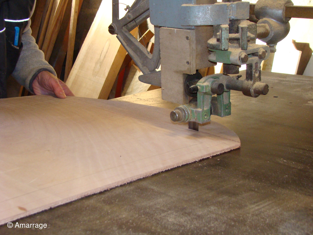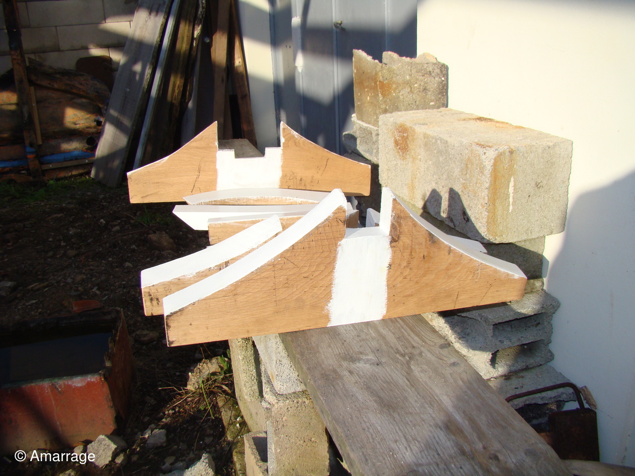 "MARIE- JOSEPH": mise en place de 3 varangues après mise en peinture- travail sur les membrures - il en reste 4 à réaliser.