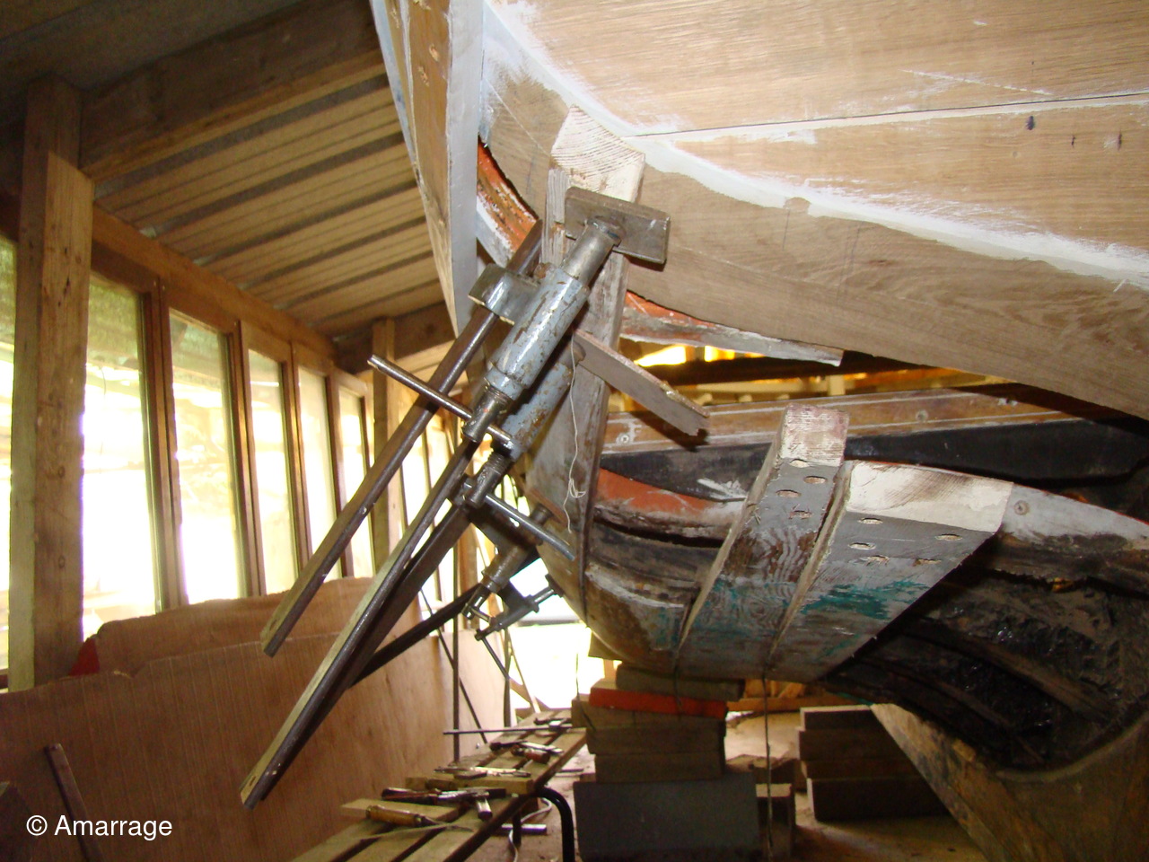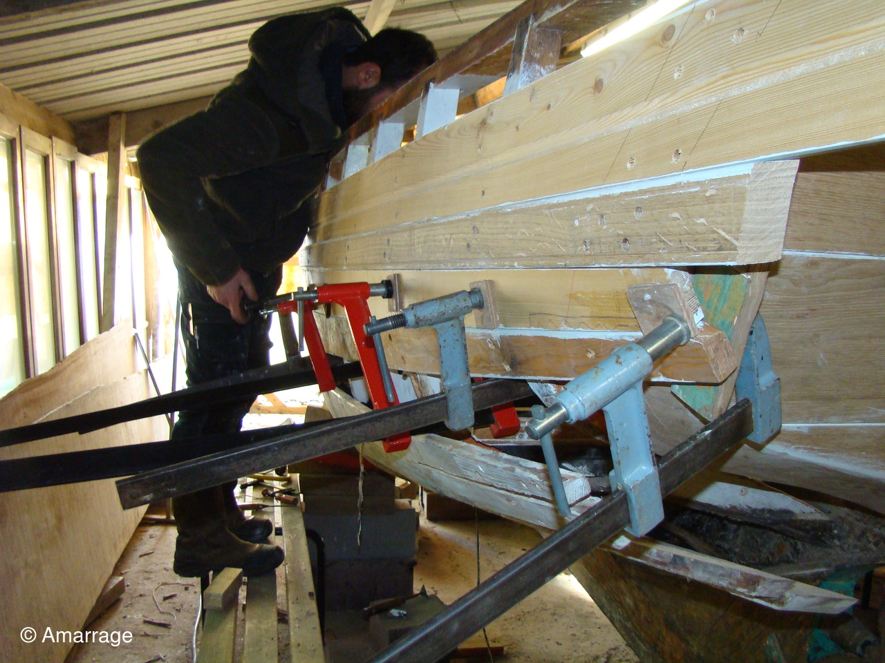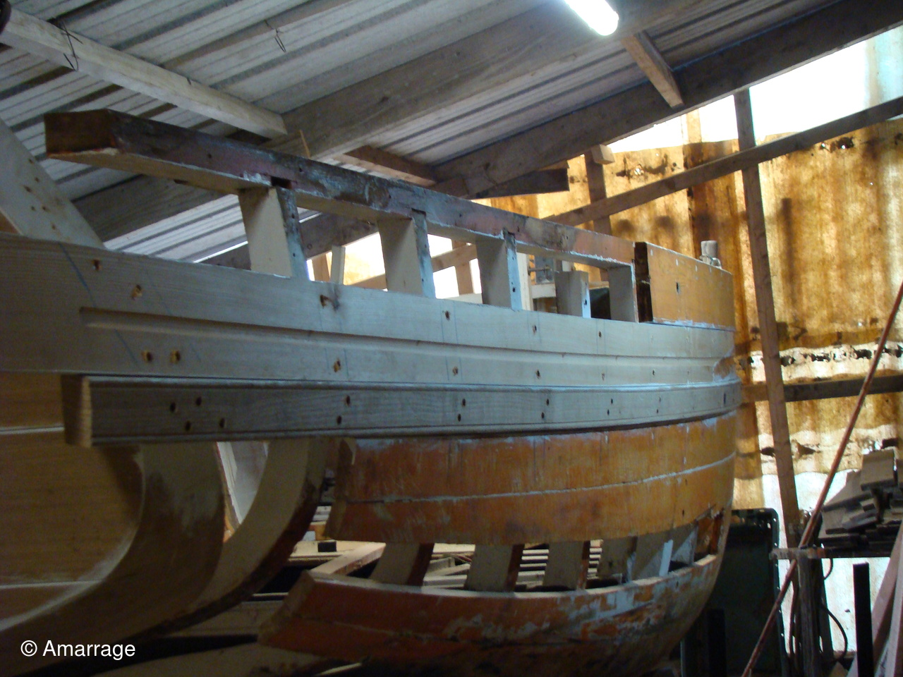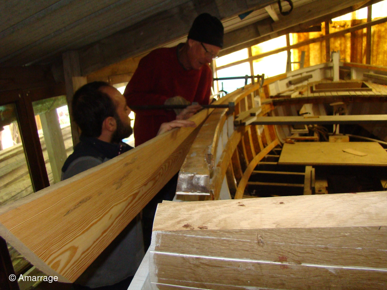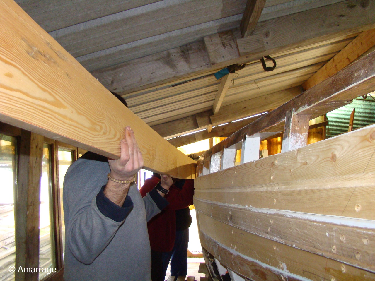 "AWASSA": son capot sur l'avant n'attend plus que d'être mis en peinture. Pose d'un bordé tribord. Le bordé babord se prépare. Renforcement des membrures à babord.