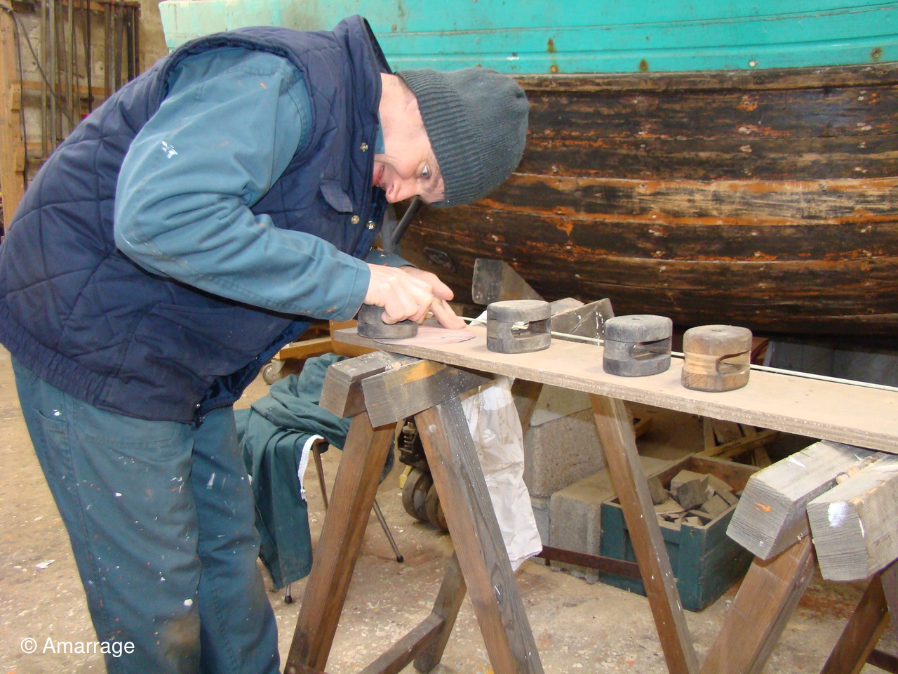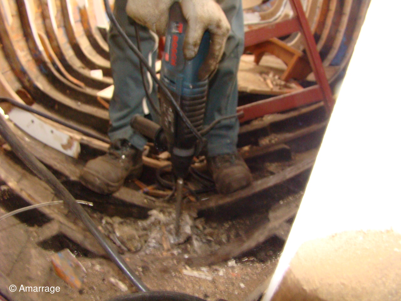 "MARIE JOSEPH": travail sur les bordés (fixation) ; enlèvement du chassis moteur qu'il faudra remplacer; enlèvement du lest (béton) sur l'avant.
