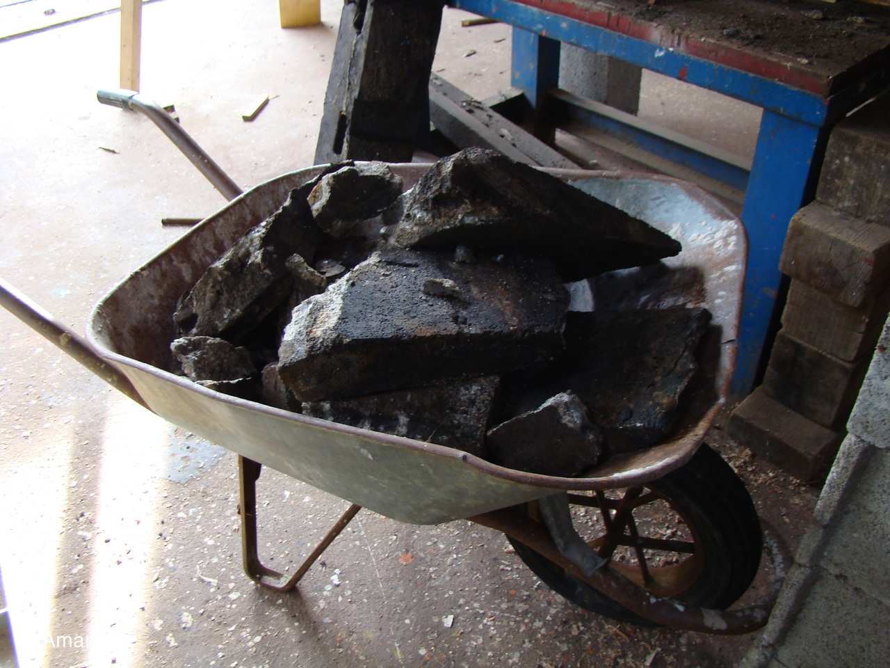 Dans l'atelier, divers travaux, grattage, nettoyage, rangement.