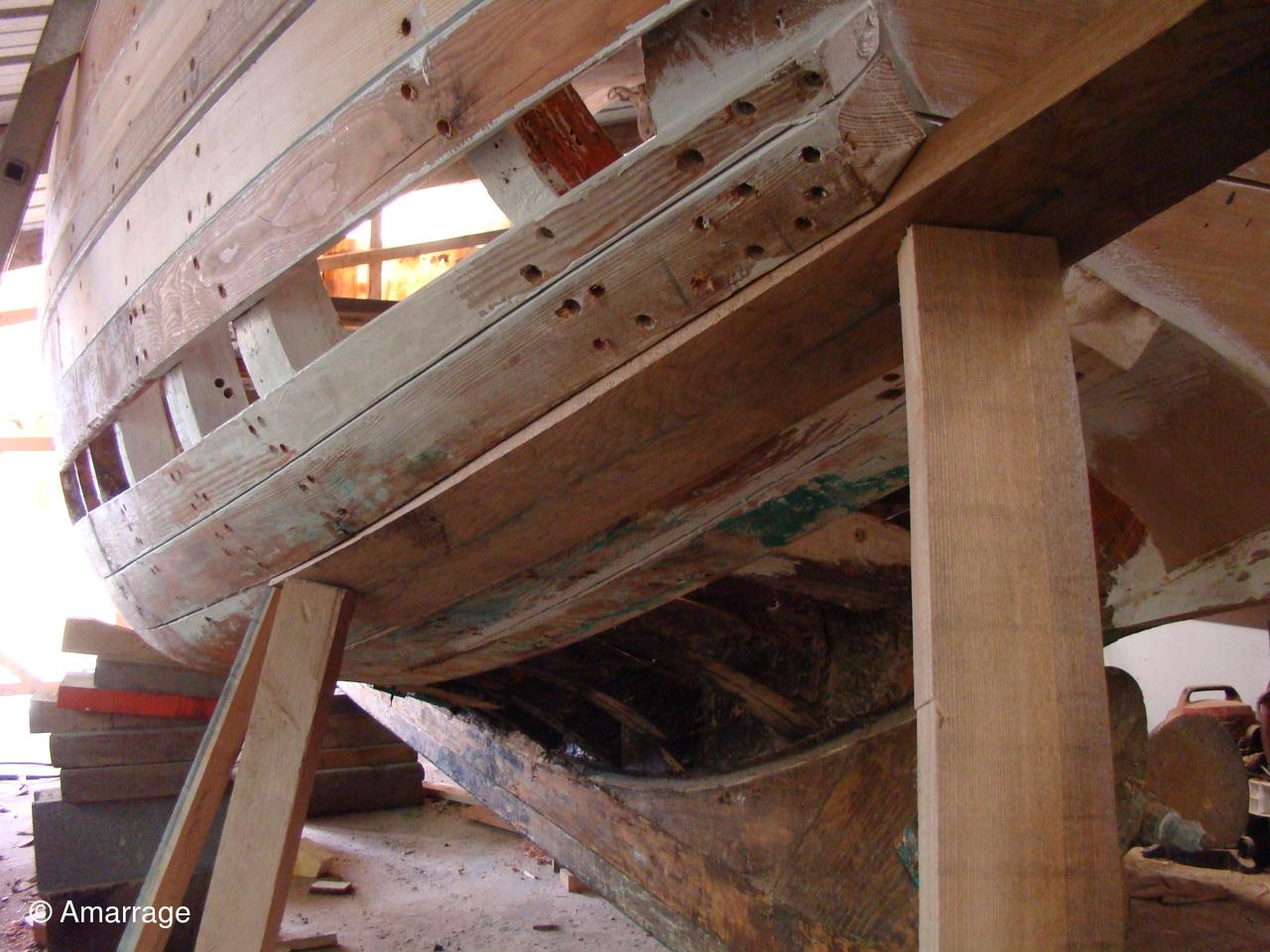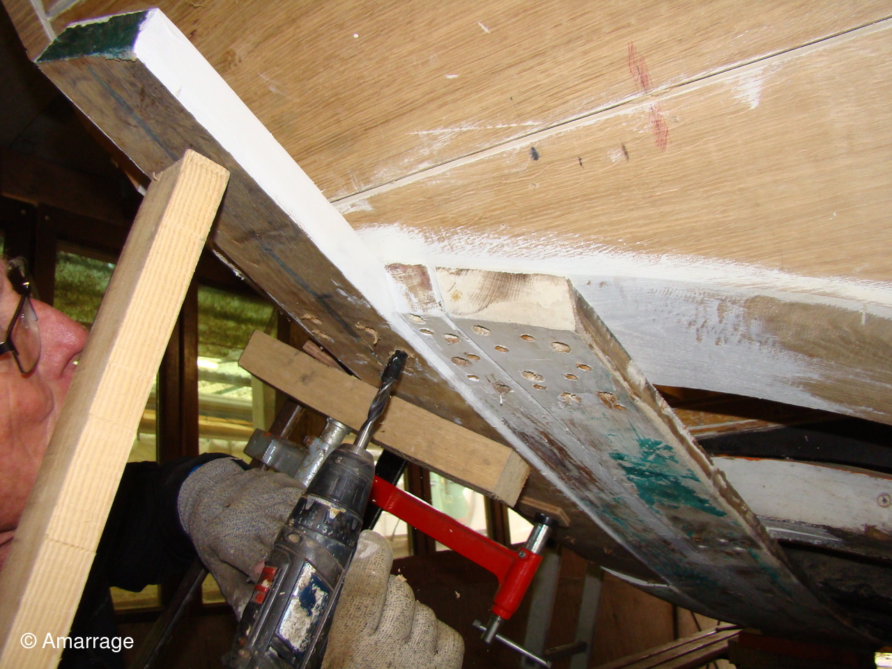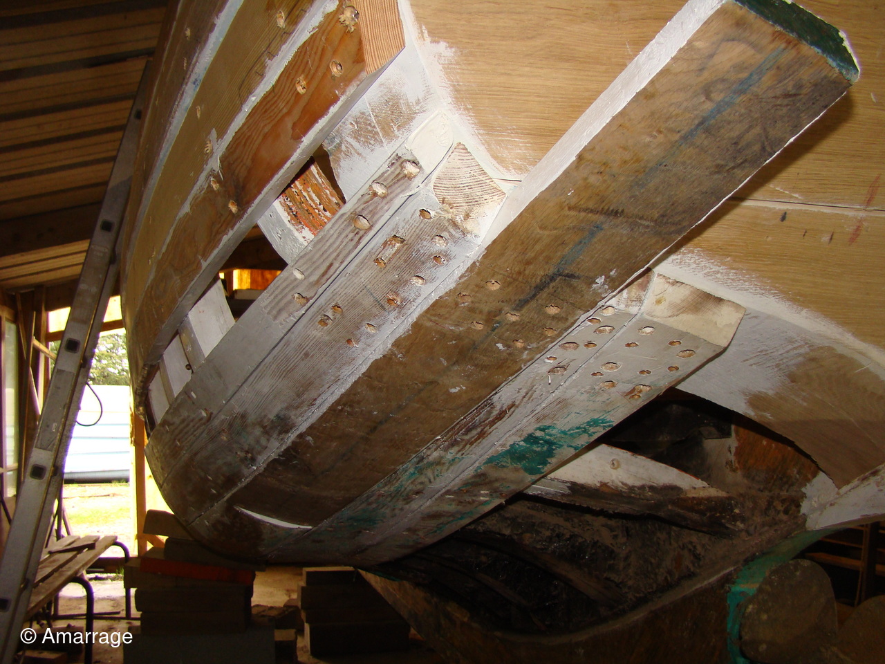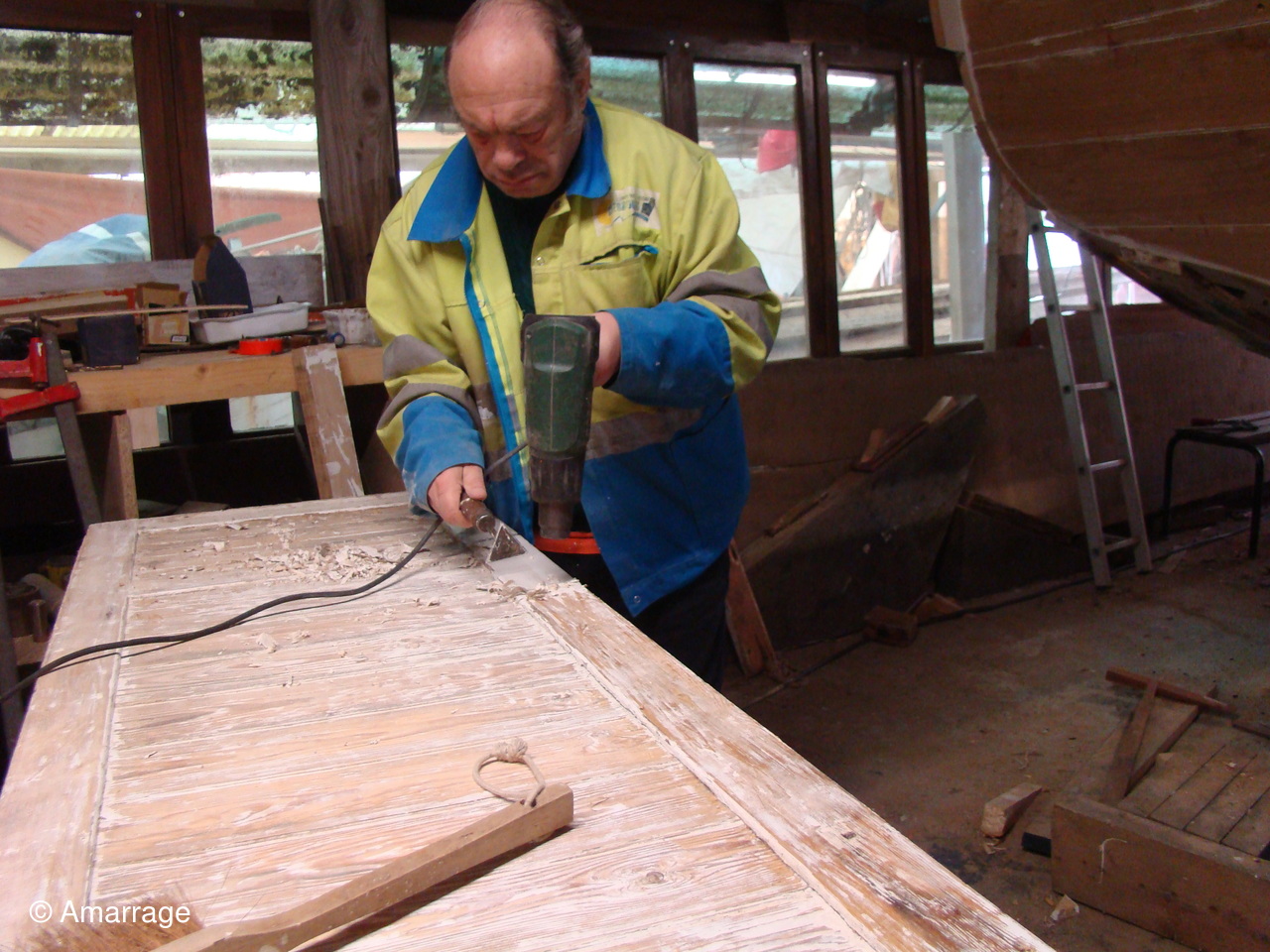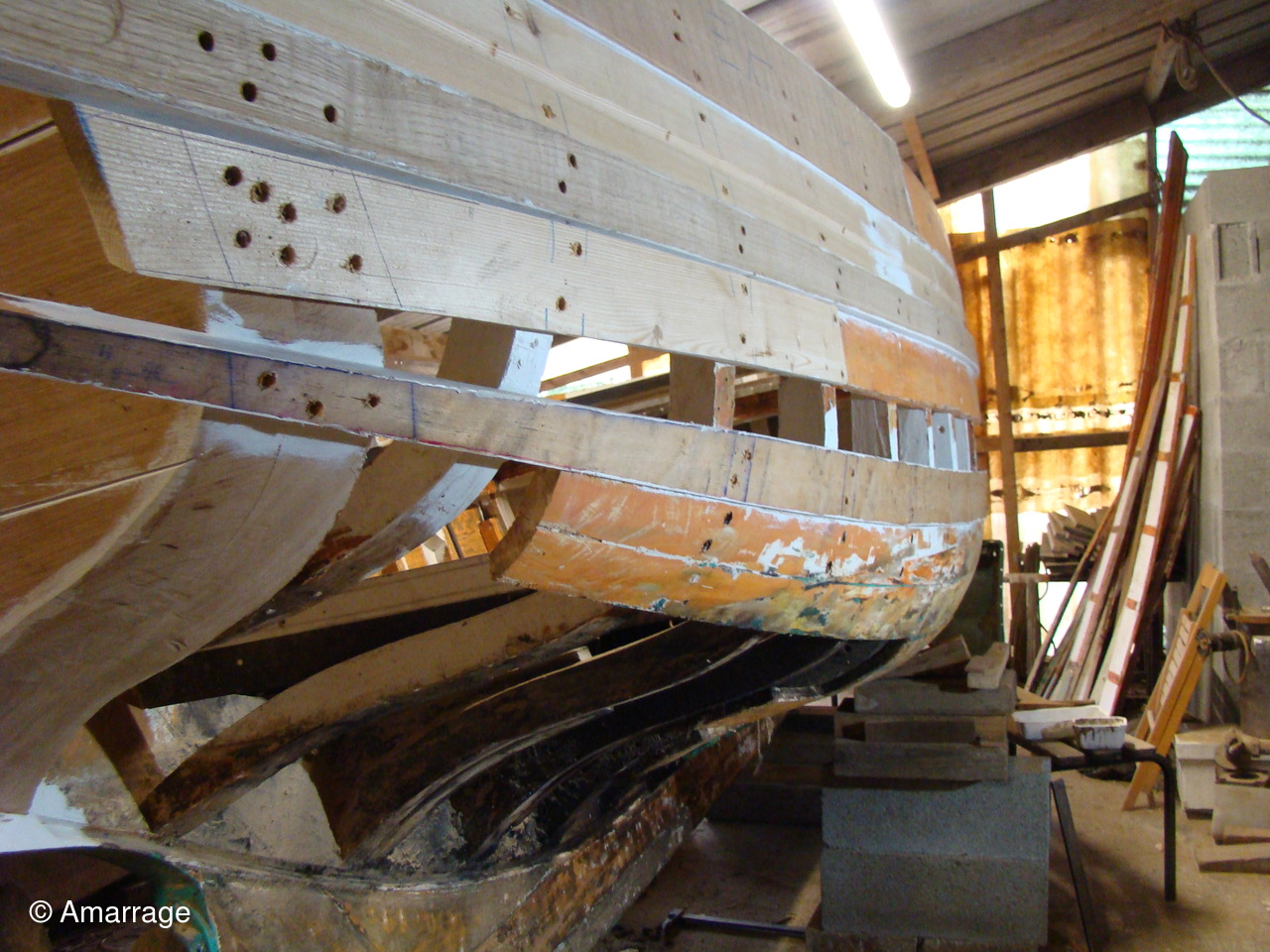 "AWASSA": Mise en place de 2 bordés (Tb et Bd); travail sur le tableau arrière; mise en chantier d'un bordé à Td; peinture du capot avant.