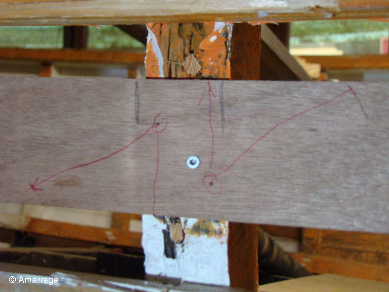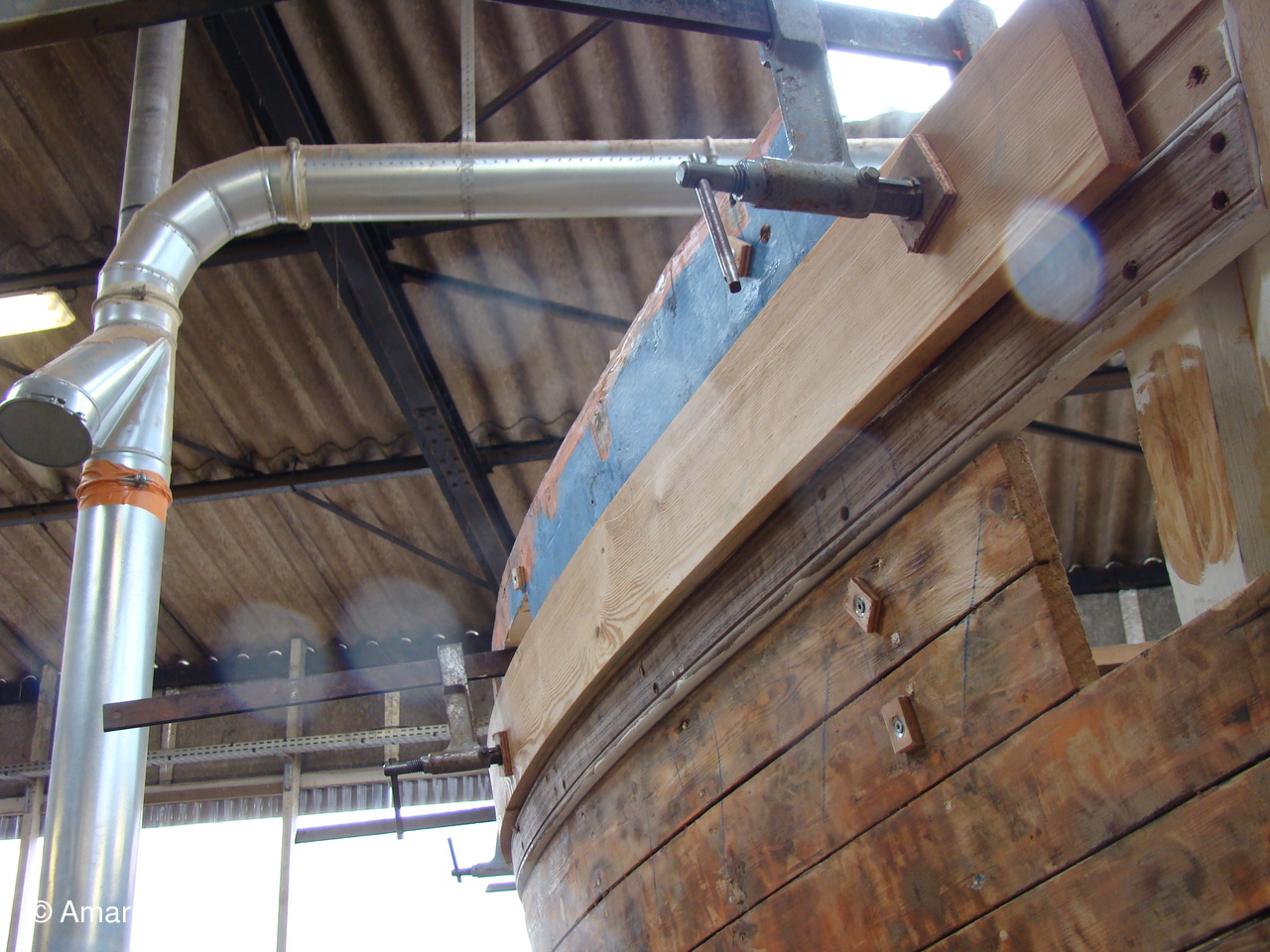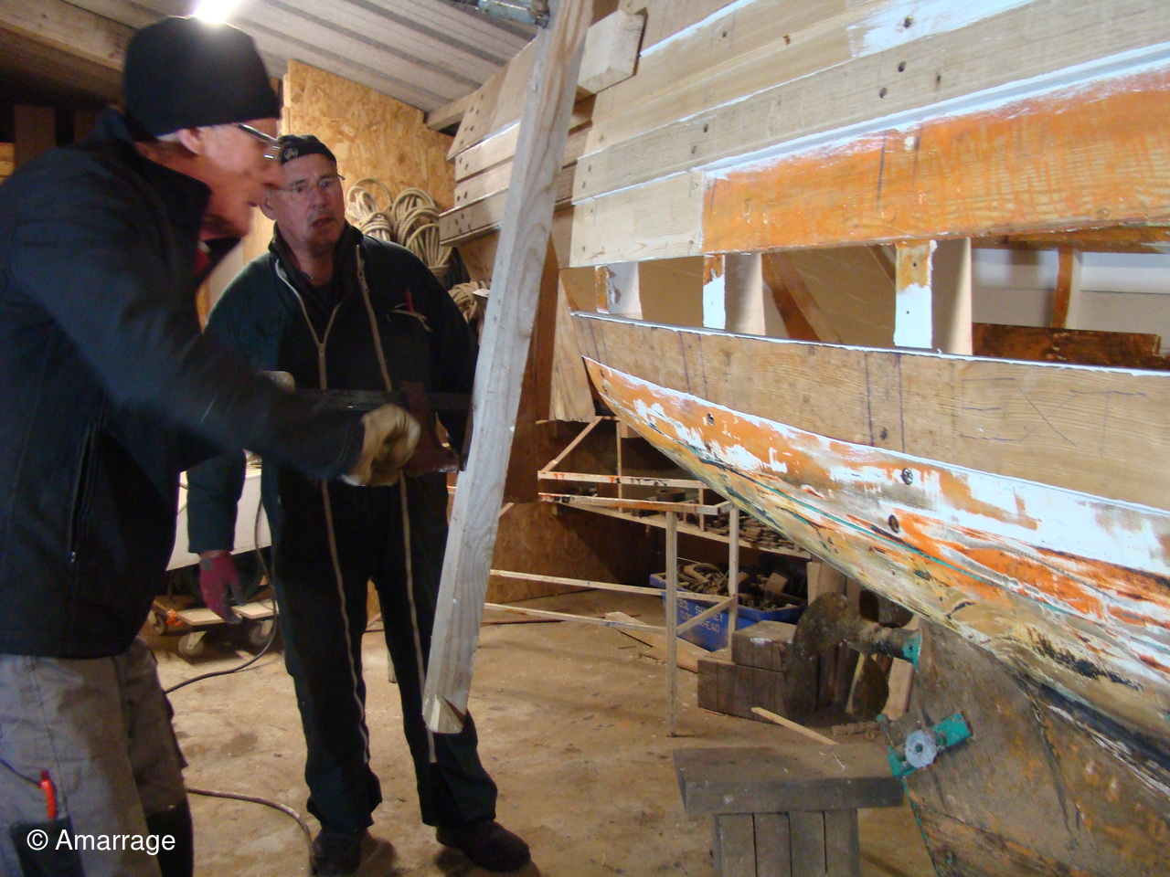 "AWASSA": préparation de la cloison avant; mise en place d'un bordé sur tribord; pinochage des membrures sur tribord; préparation d'un autre bodé sur tribord (prise de cotes- gabarit- traçage pièce découpe, ajustement) en attendant son étuvage et sa pose.