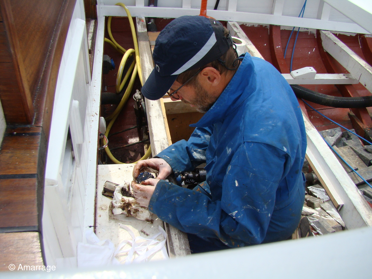 "NEREÏDES": mise en place du plancher. Peinture antifouling faite. Installation d'un "coupe orin" sur l'arbre d'hélice (empêcher un filin de se mettre autour de l'hélice)