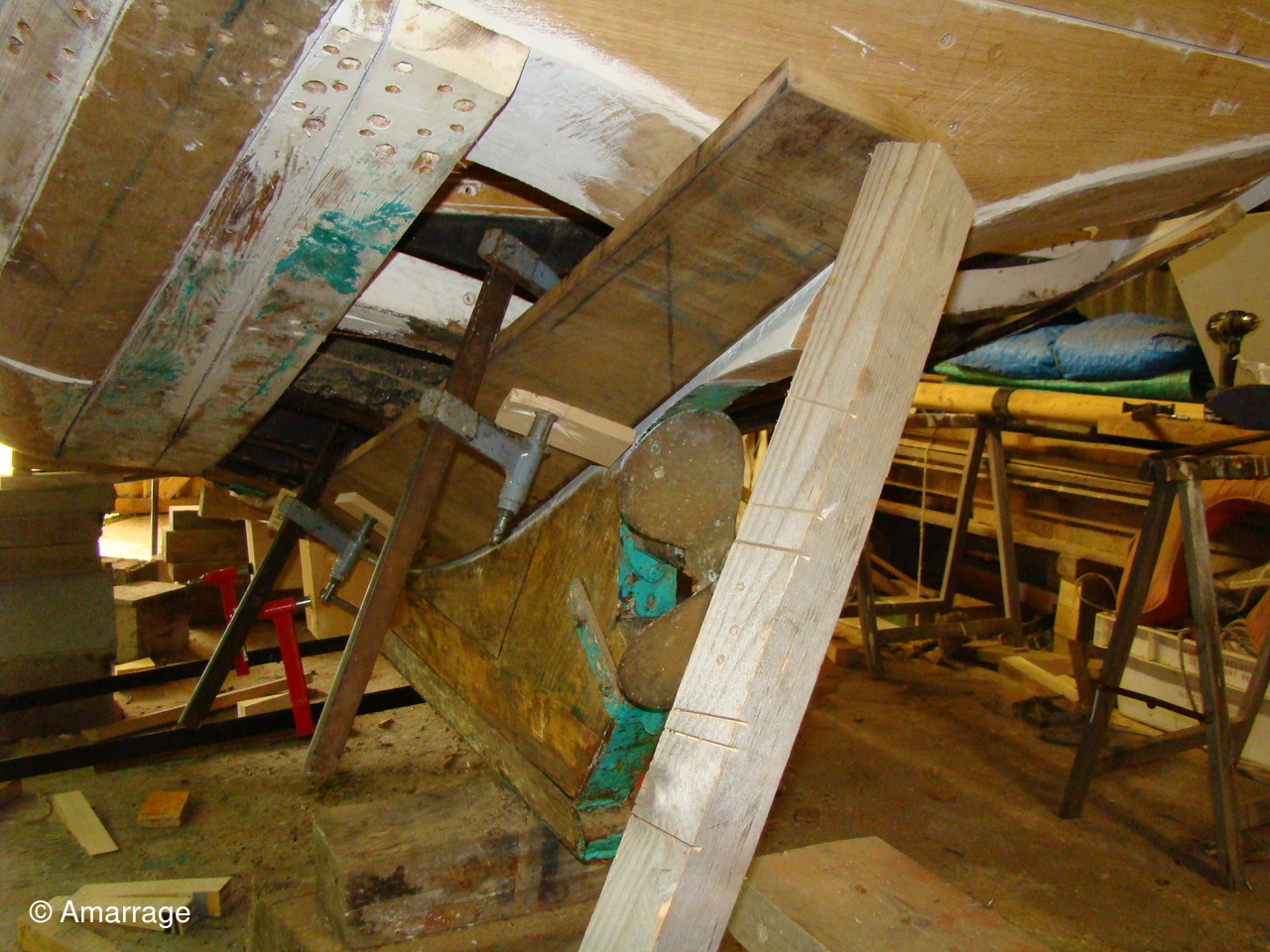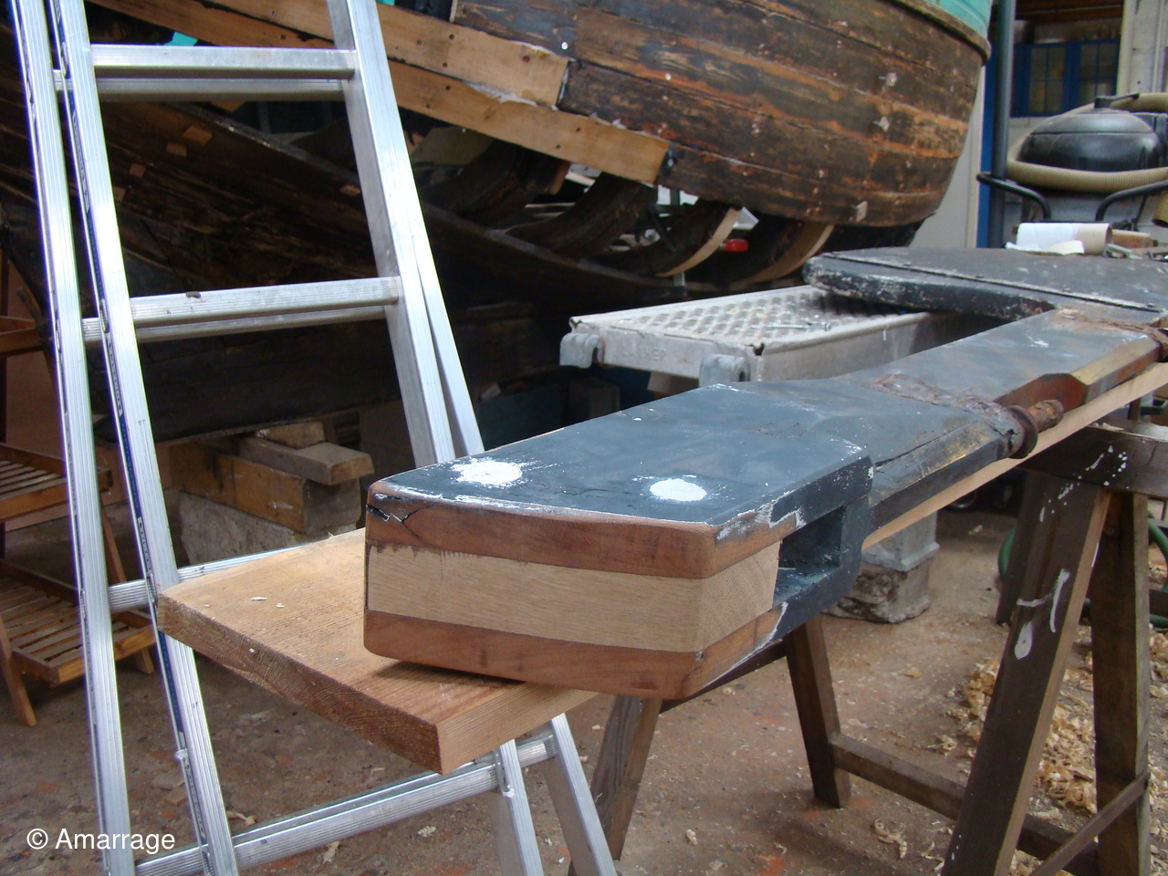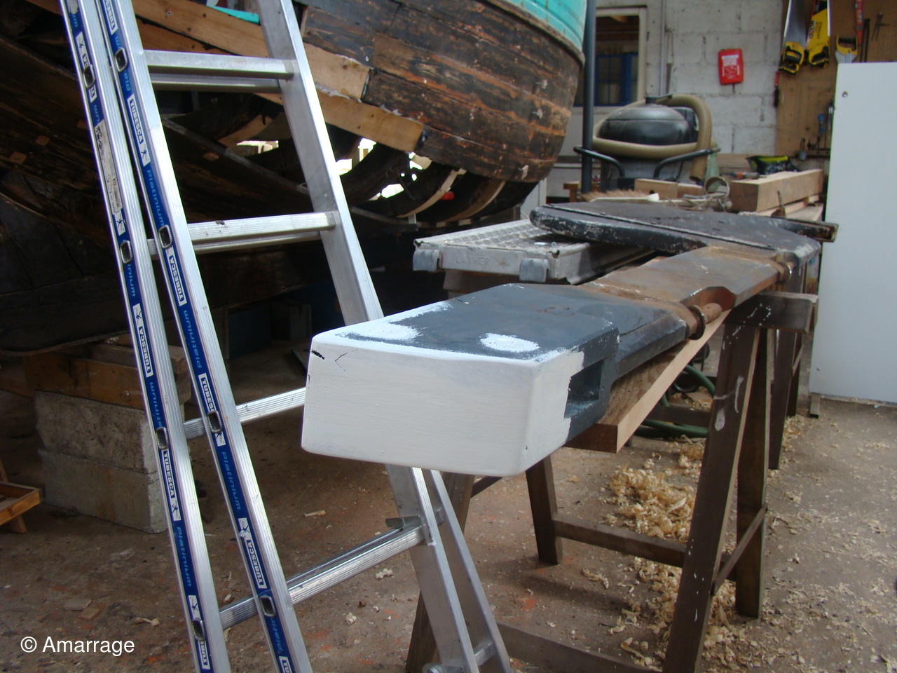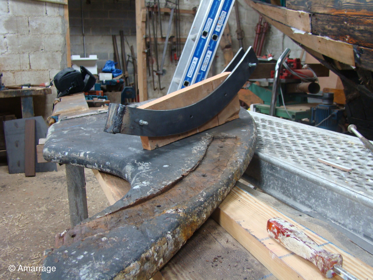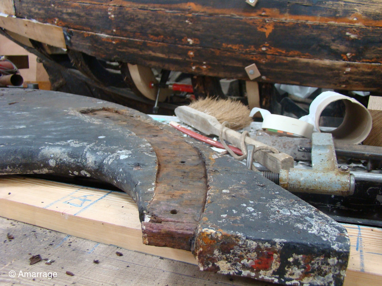 "AWASSA" : travail sur le safran, pièces métalliques à remplacer, partie abimée à restaurer. Découpe parties Tb et Bd cloison d'après gabarits.