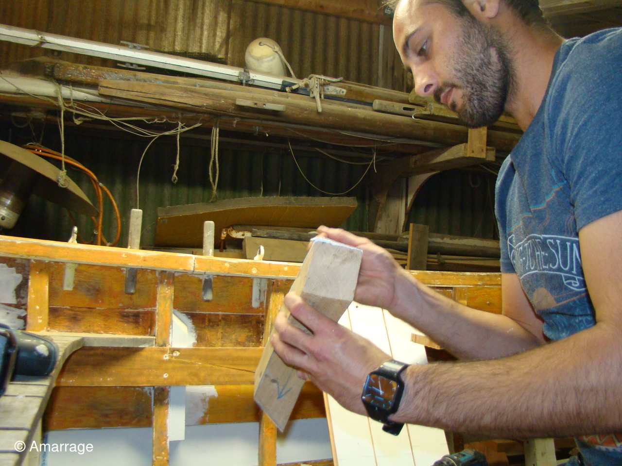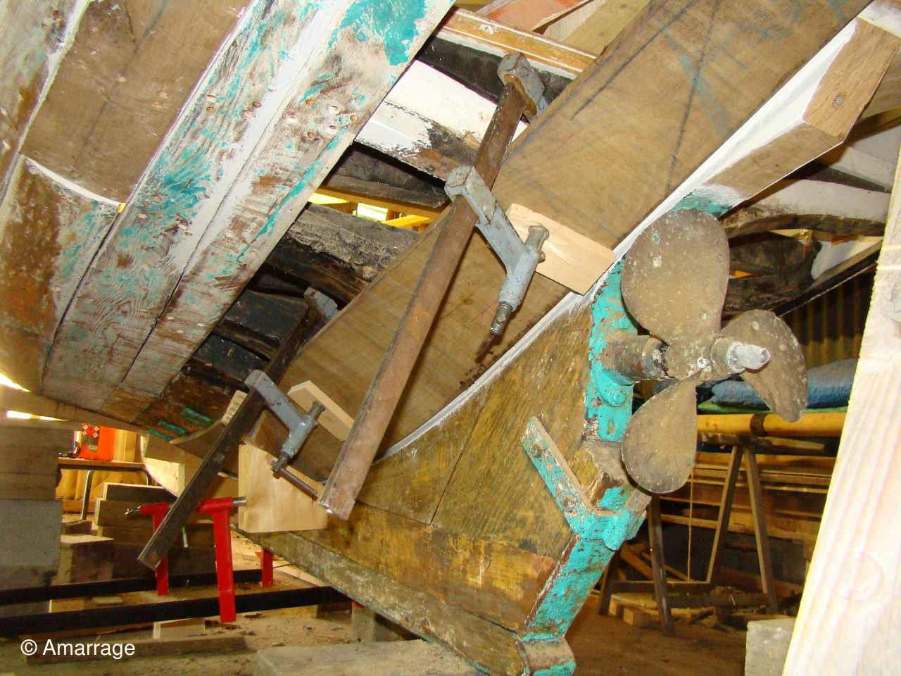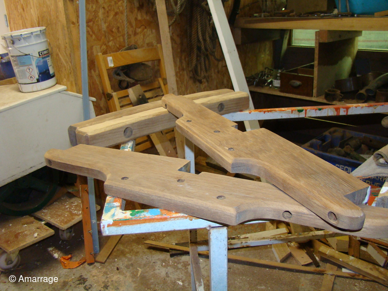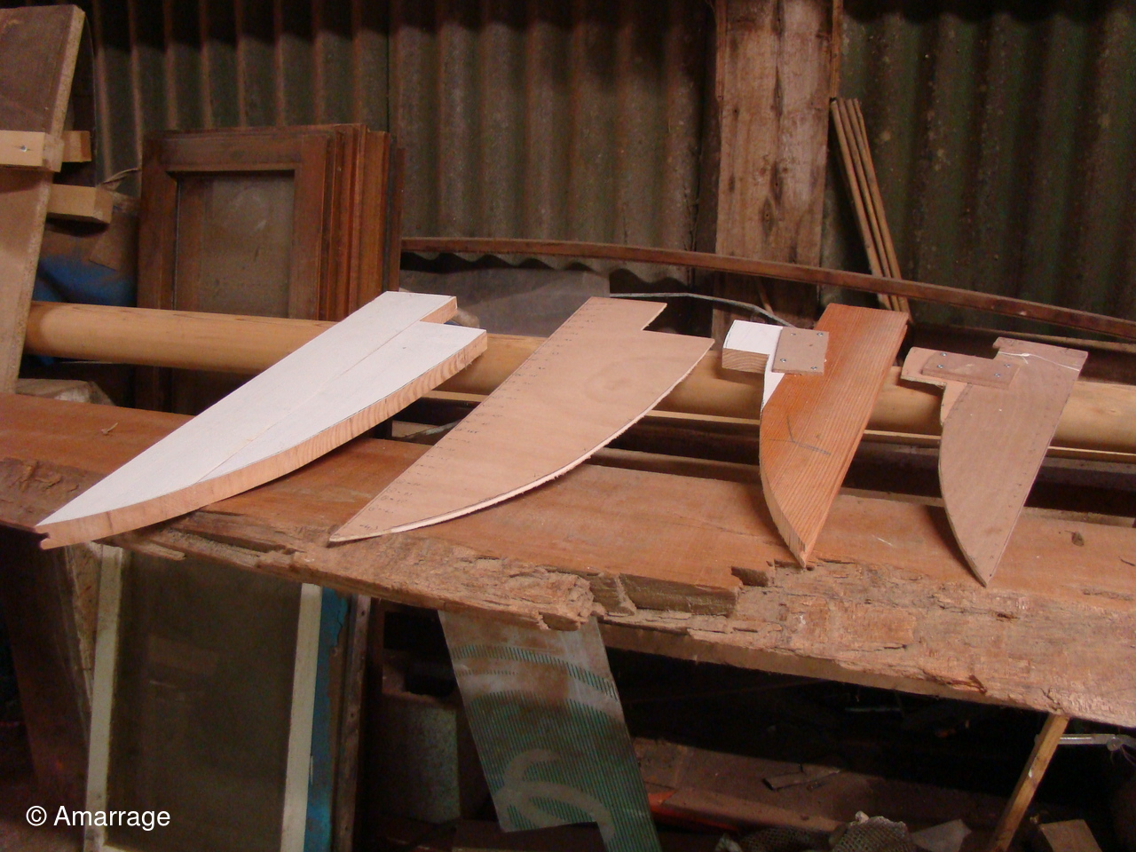"AWASSA" : travail sur le safran, pièces métalliques à remplacer, partie abimée à restaurer. Découpe parties Tb et Bd cloison d'après gabarits.
