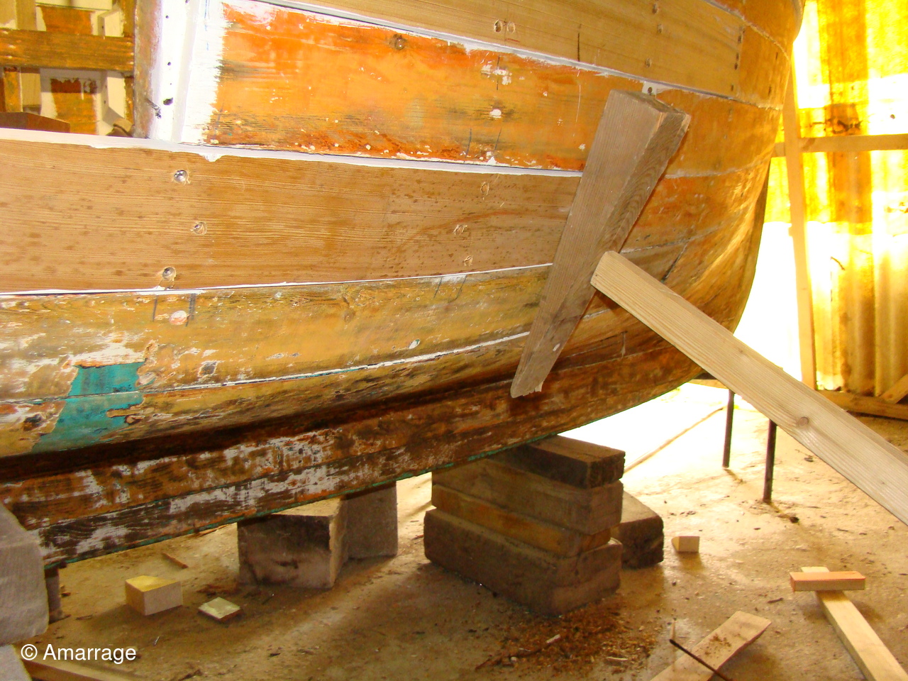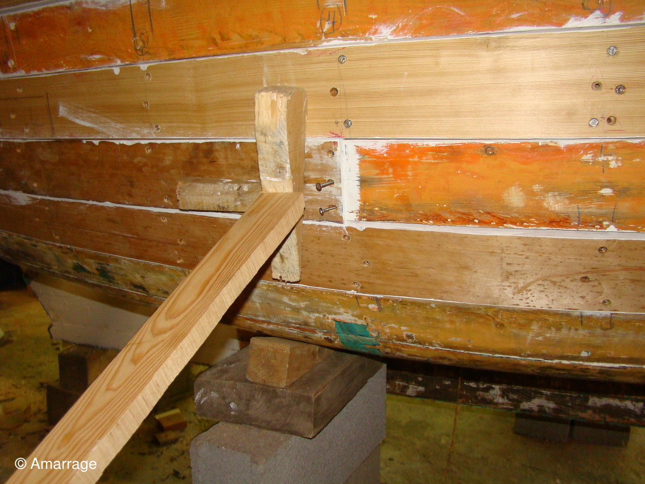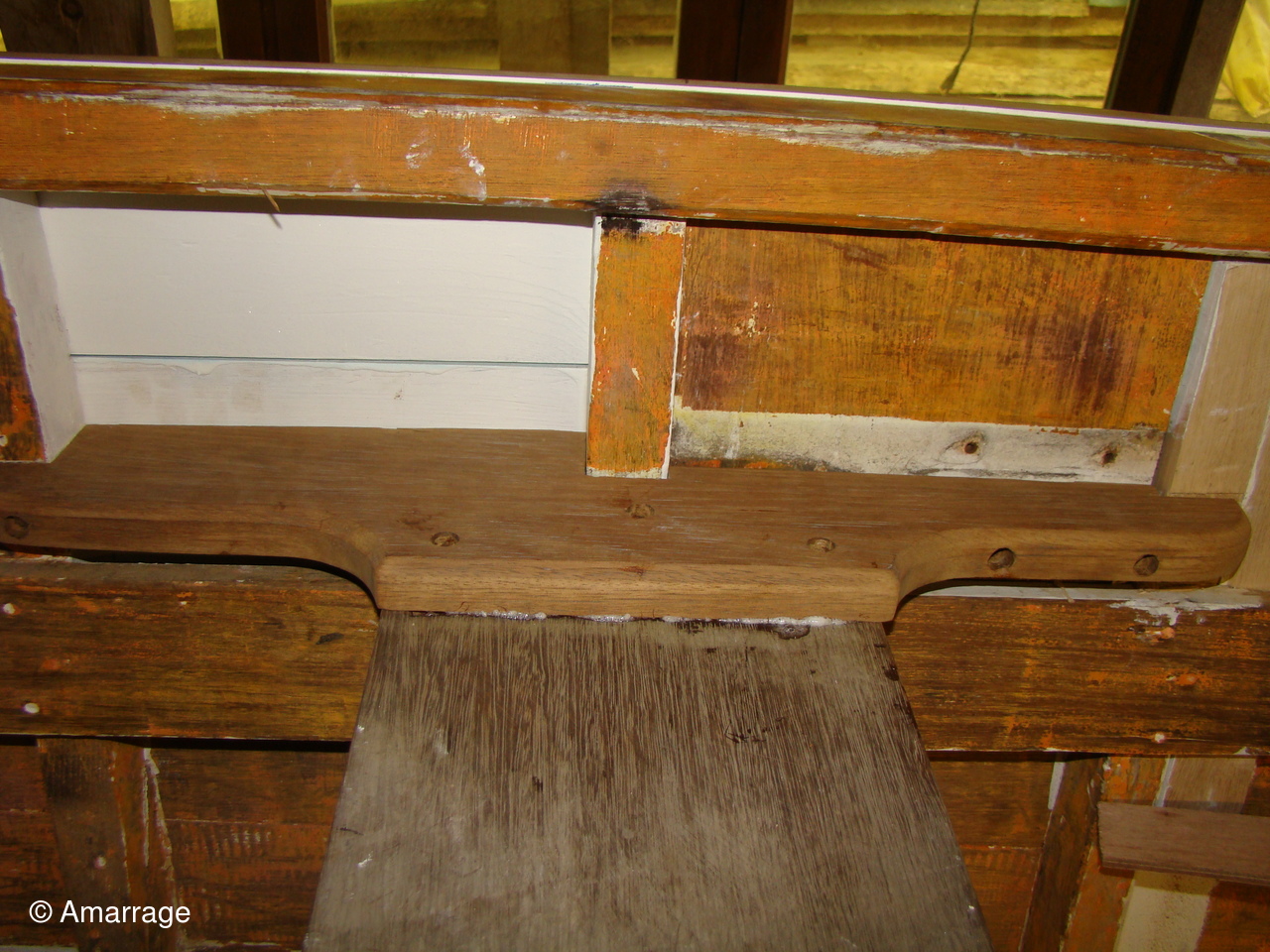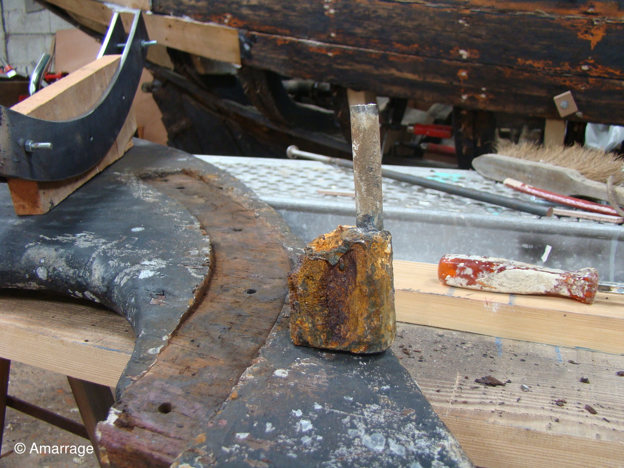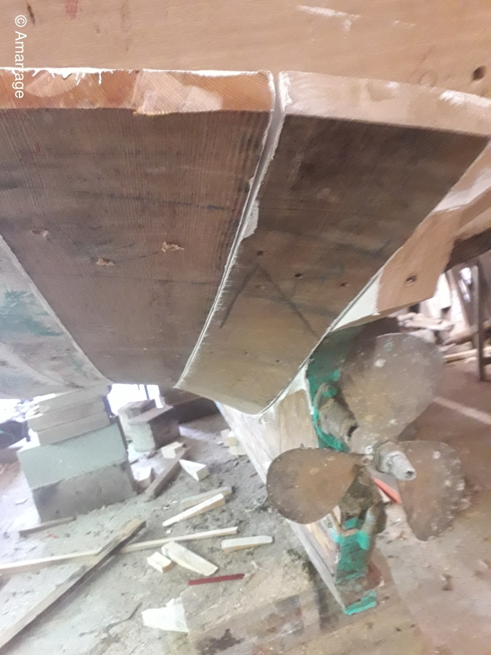 "AWASSA" : travail sur le safran, pièces métalliques à remplacer, partie abimée à restaurer. Découpe parties Tb et Bd cloison d'après gabarits.