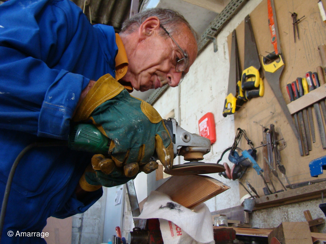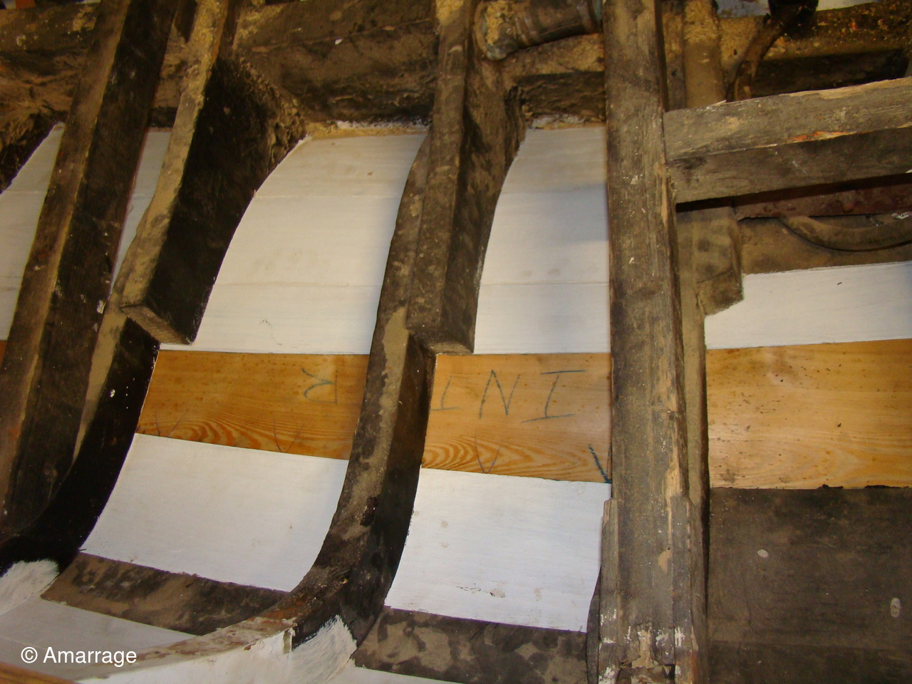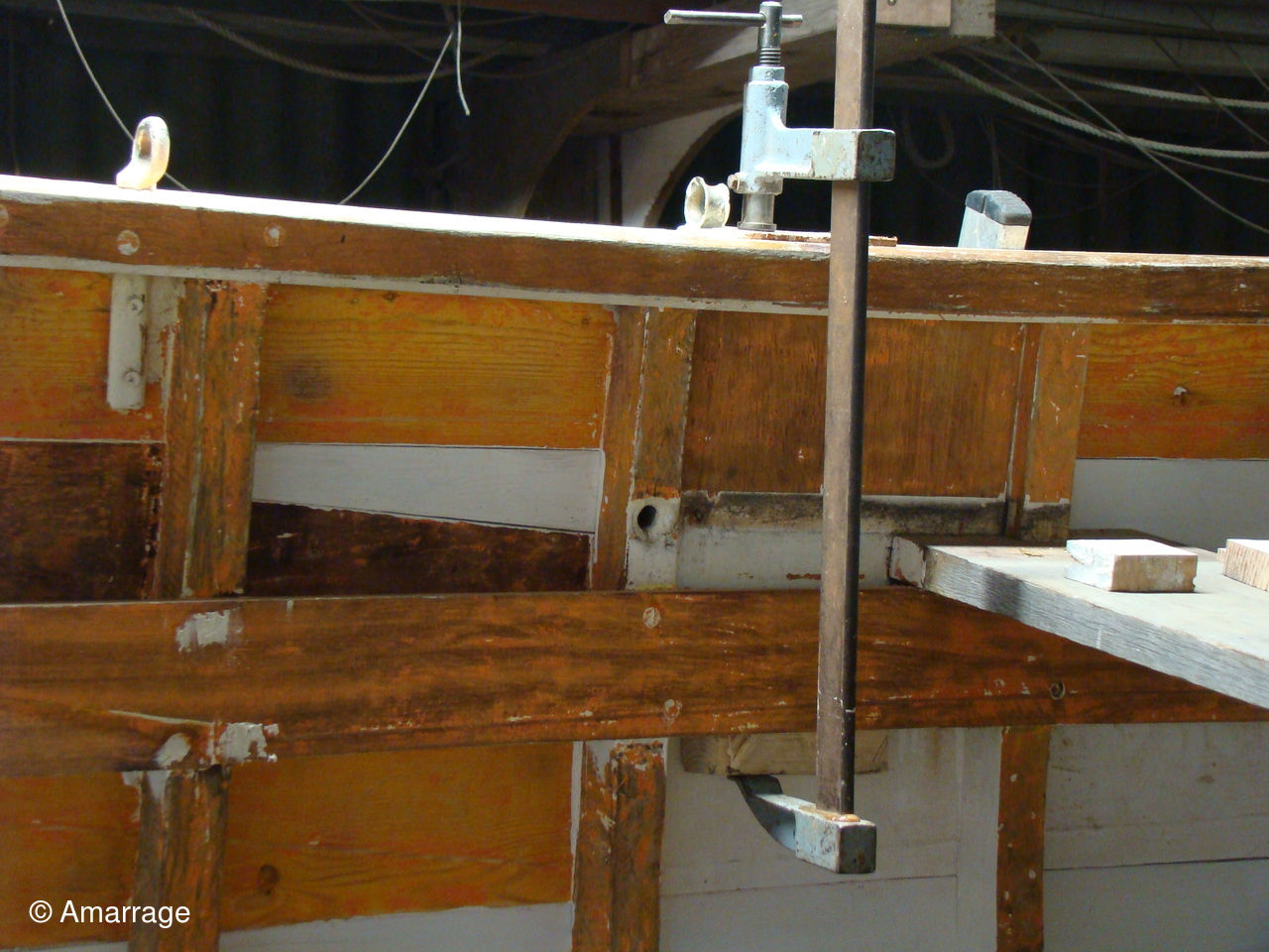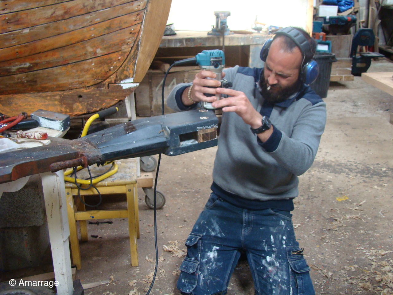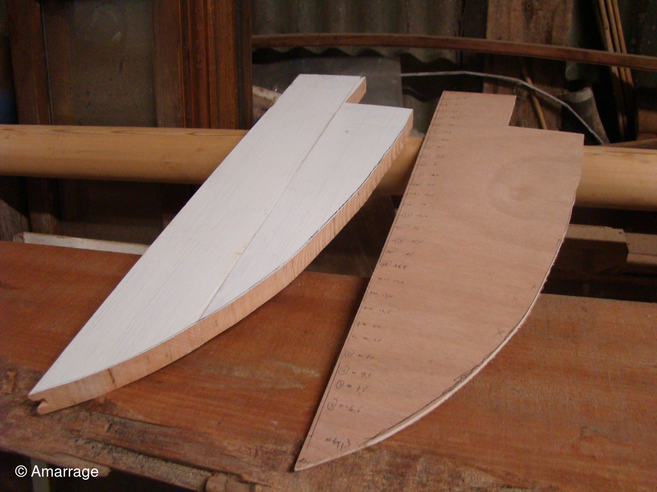 "AWASSA" : travail sur le safran, pièces métalliques à remplacer, partie abimée à restaurer. Découpe parties Tb et Bd cloison d'après gabarits.