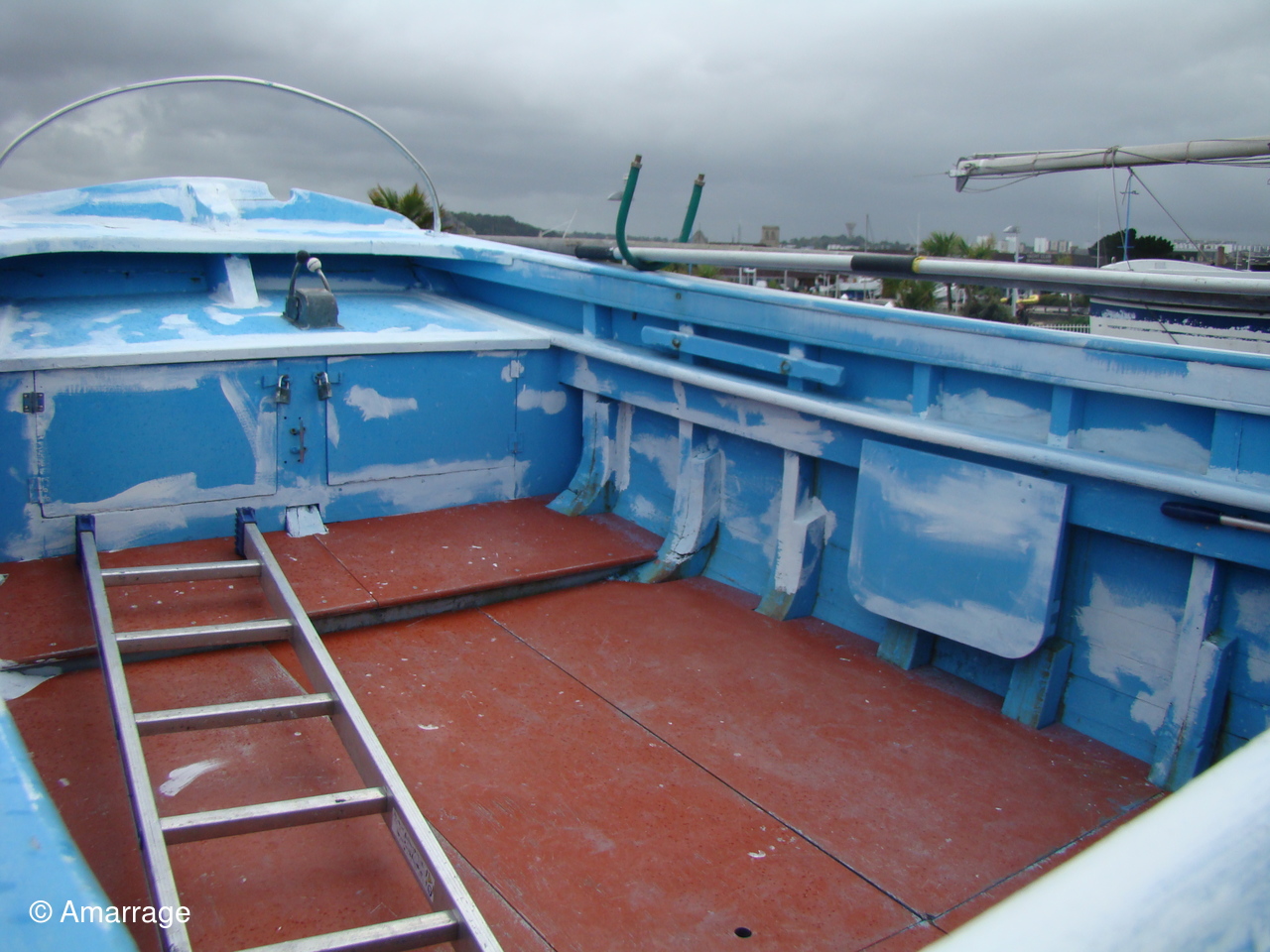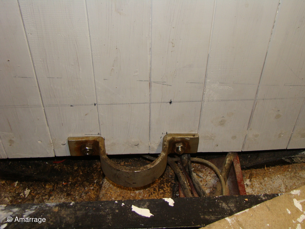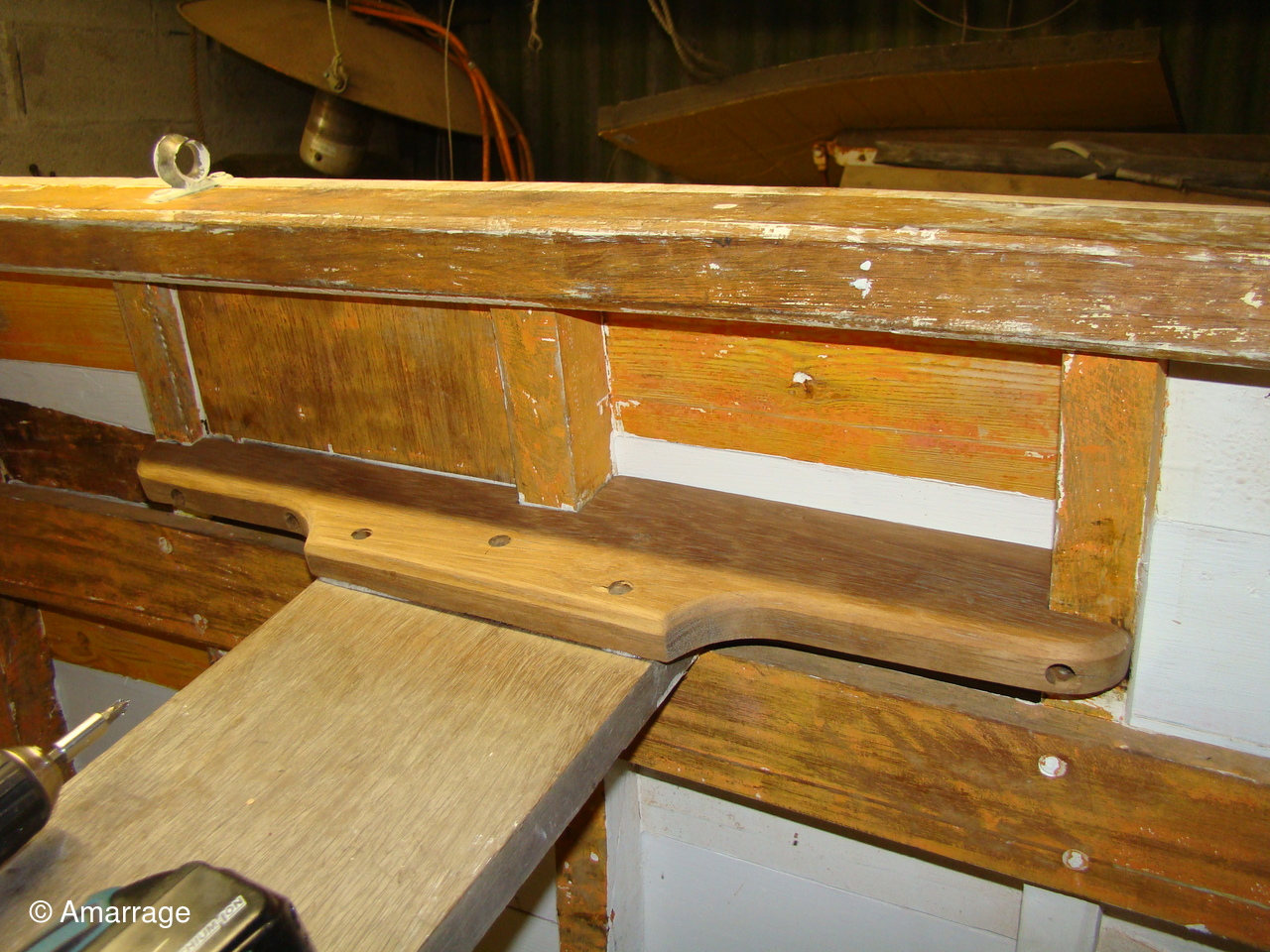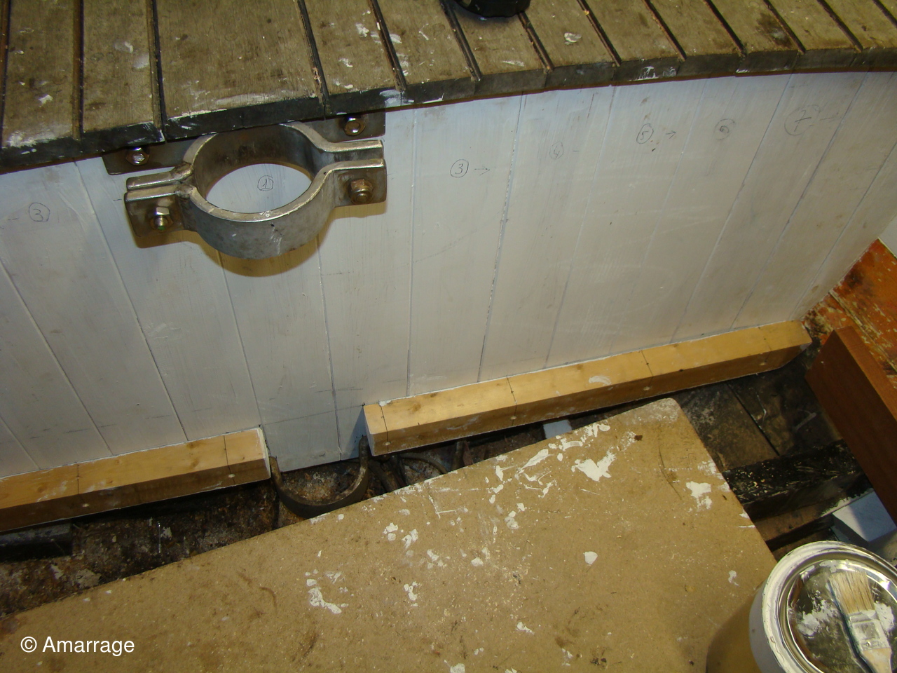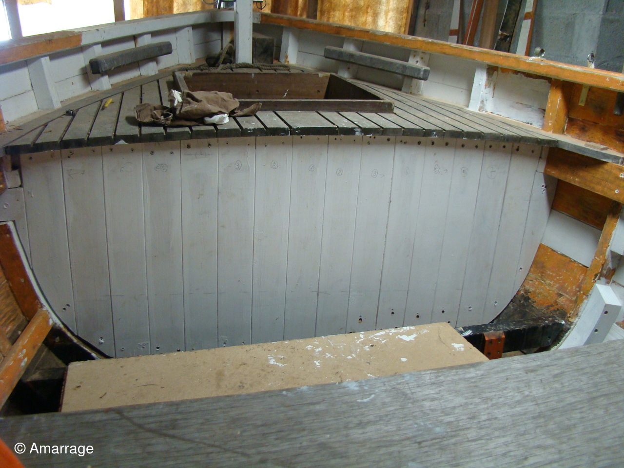 "AWASSA": Fabrication supports banc arrière; Finition extremités cloison avant; Travail sur 1 bordé à Tb; Mise en place support mât; Travail sur pot d'échappement; pièces pour support pont fixées sur la cloison; Pont arrière décapé; Ajustage des plats - bord;