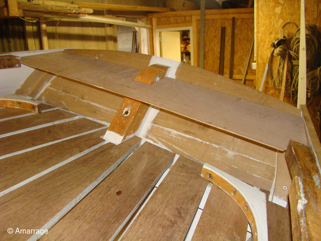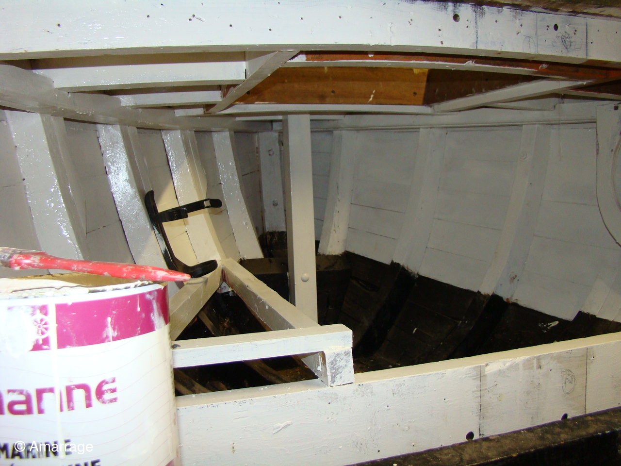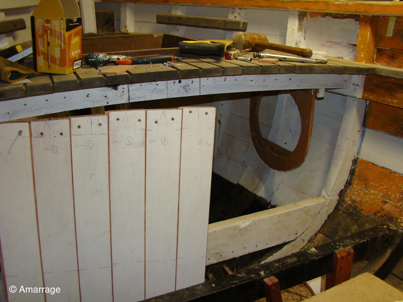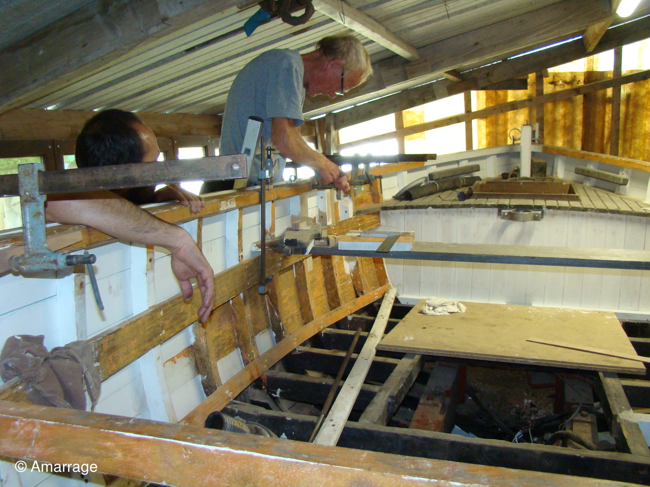 "AWASSA": Pont arrière posé; Ponçage des violons et des taquets d'amarrage, pose des violons; Fixation des renforts de béquilles; Mise en chantier de la planche de couronnement; Bordé Tb (dernier bordé) étuvage, mise en peinture avant sa pose, et l'étape "bordage" sera terminée. La coque sera fermée.