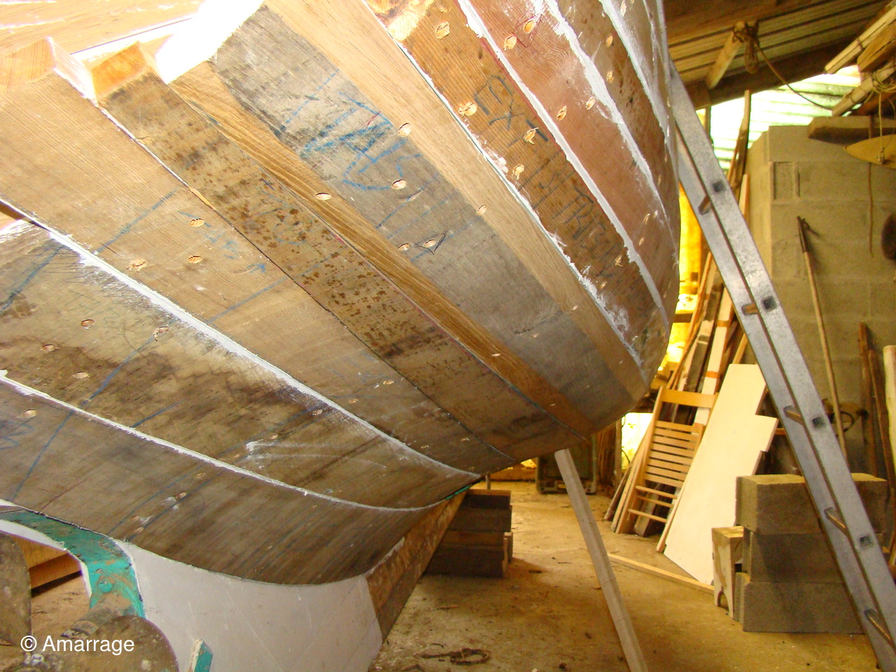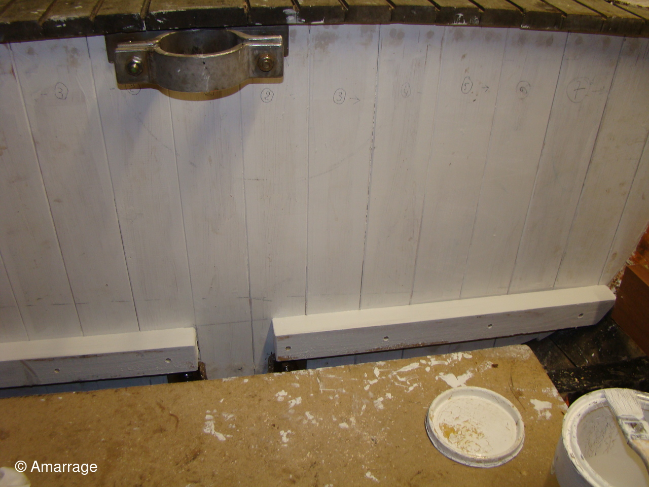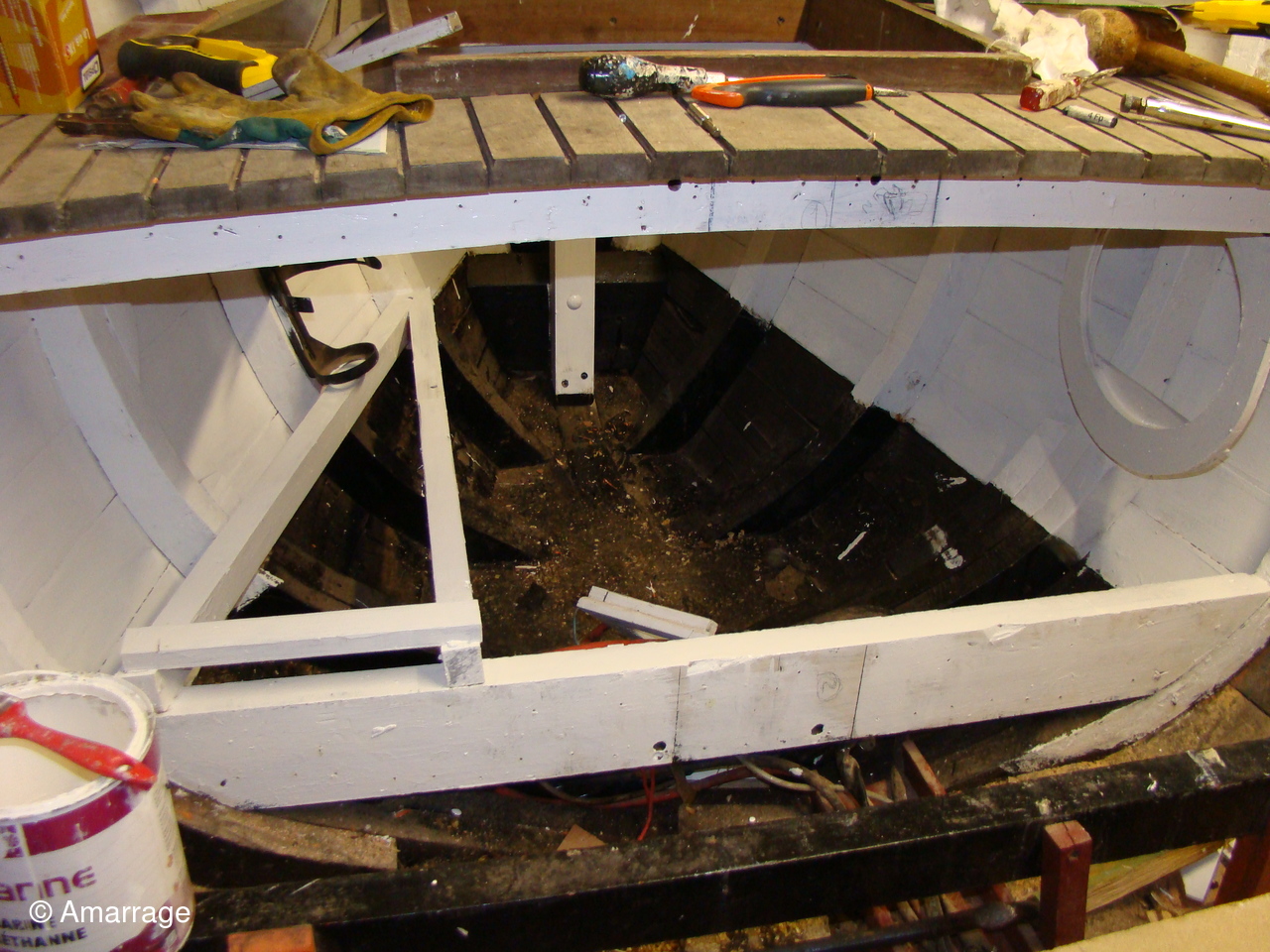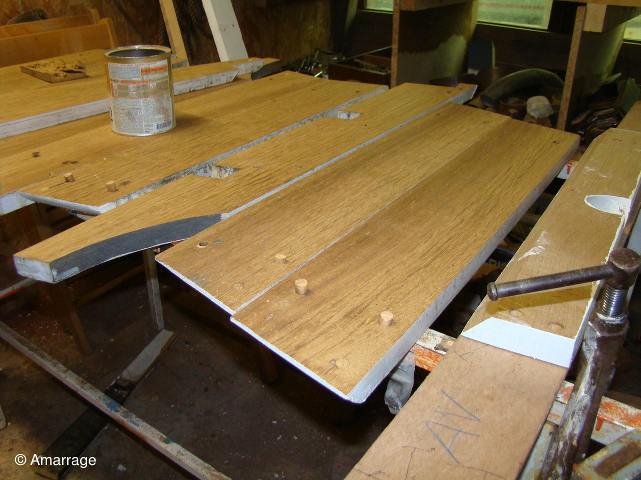 "AWASSA": Pont arrière posé; Ponçage des violons et des taquets d'amarrage, pose des violons; Fixation des renforts de béquilles; Mise en chantier de la planche de couronnement; Bordé Tb (dernier bordé) étuvage, mise en peinture avant sa pose, et l'étape "bordage" sera terminée. La coque sera fermée.