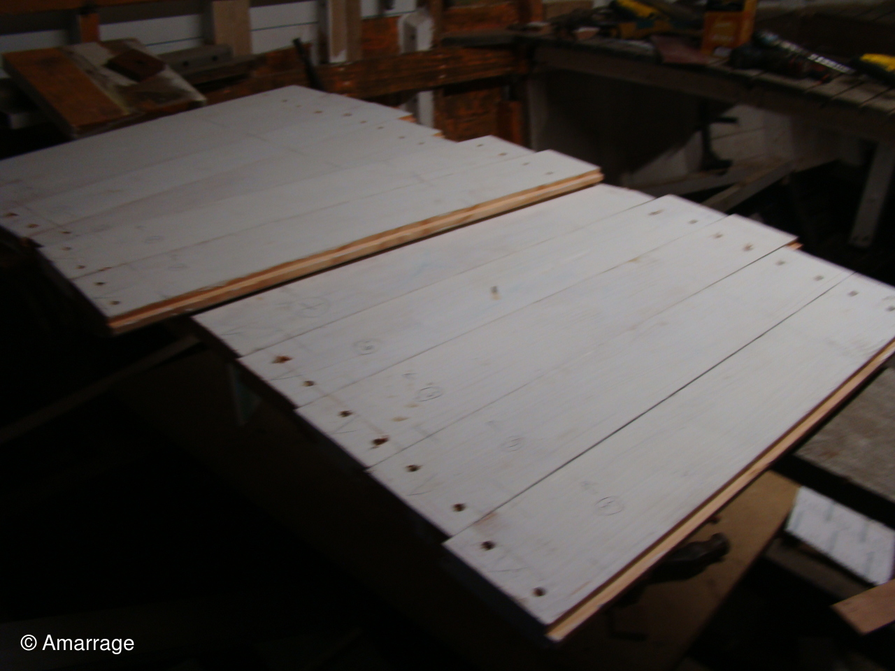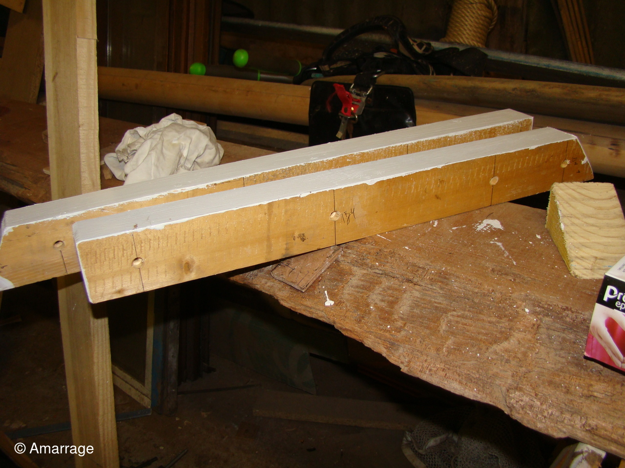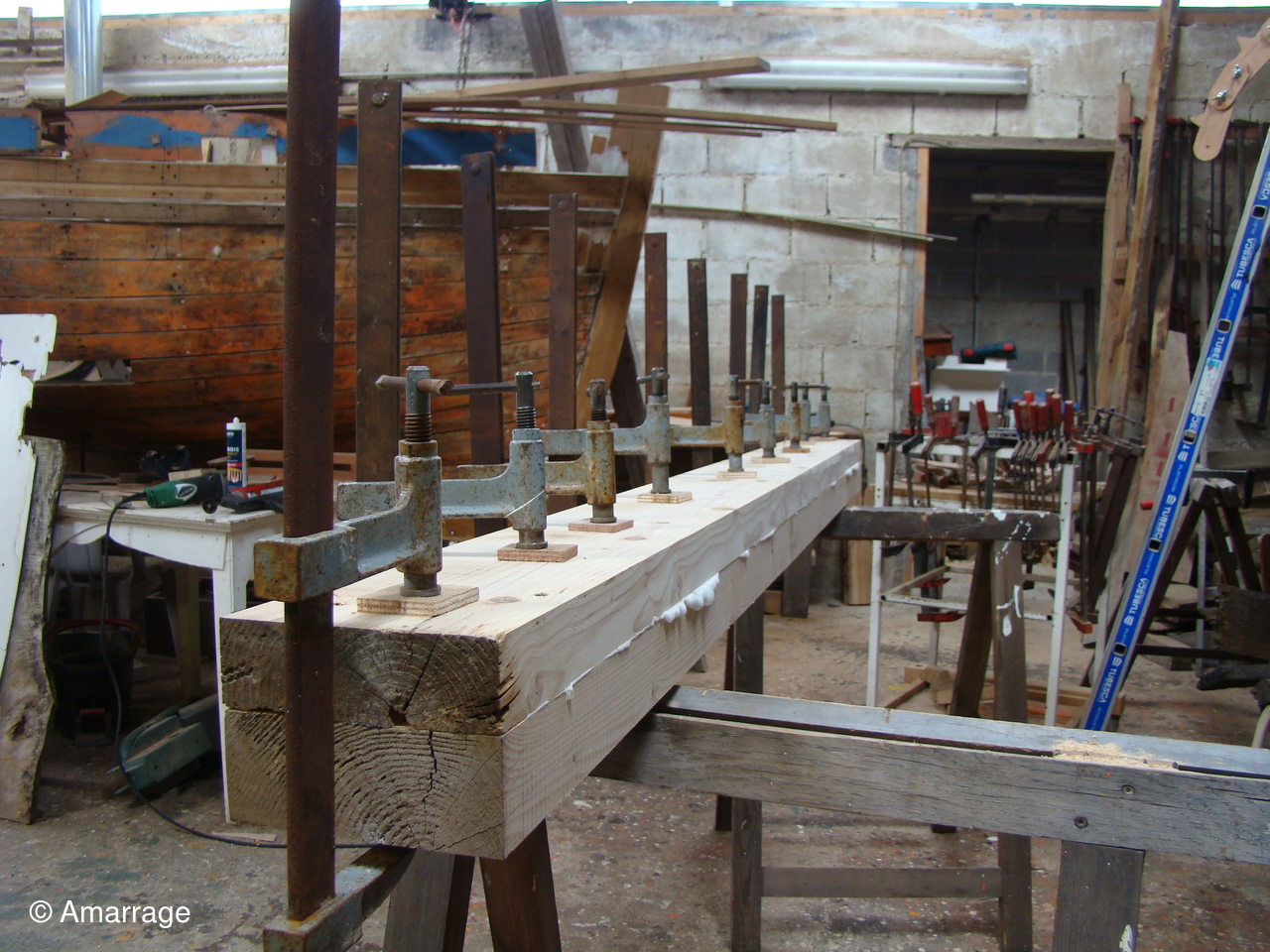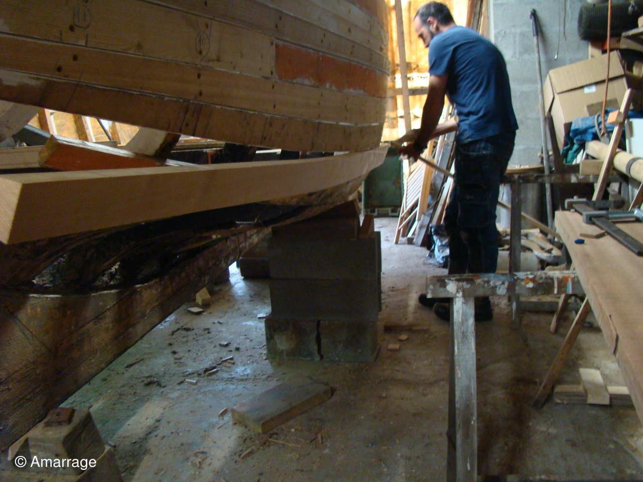 "AWASSA": Pont arrière posé; Ponçage des violons et des taquets d'amarrage, pose des violons; Fixation des renforts de béquilles; Mise en chantier de la planche de couronnement; Bordé Tb (dernier bordé) étuvage, mise en peinture avant sa pose, et l'étape "bordage" sera terminée. La coque sera fermée.
