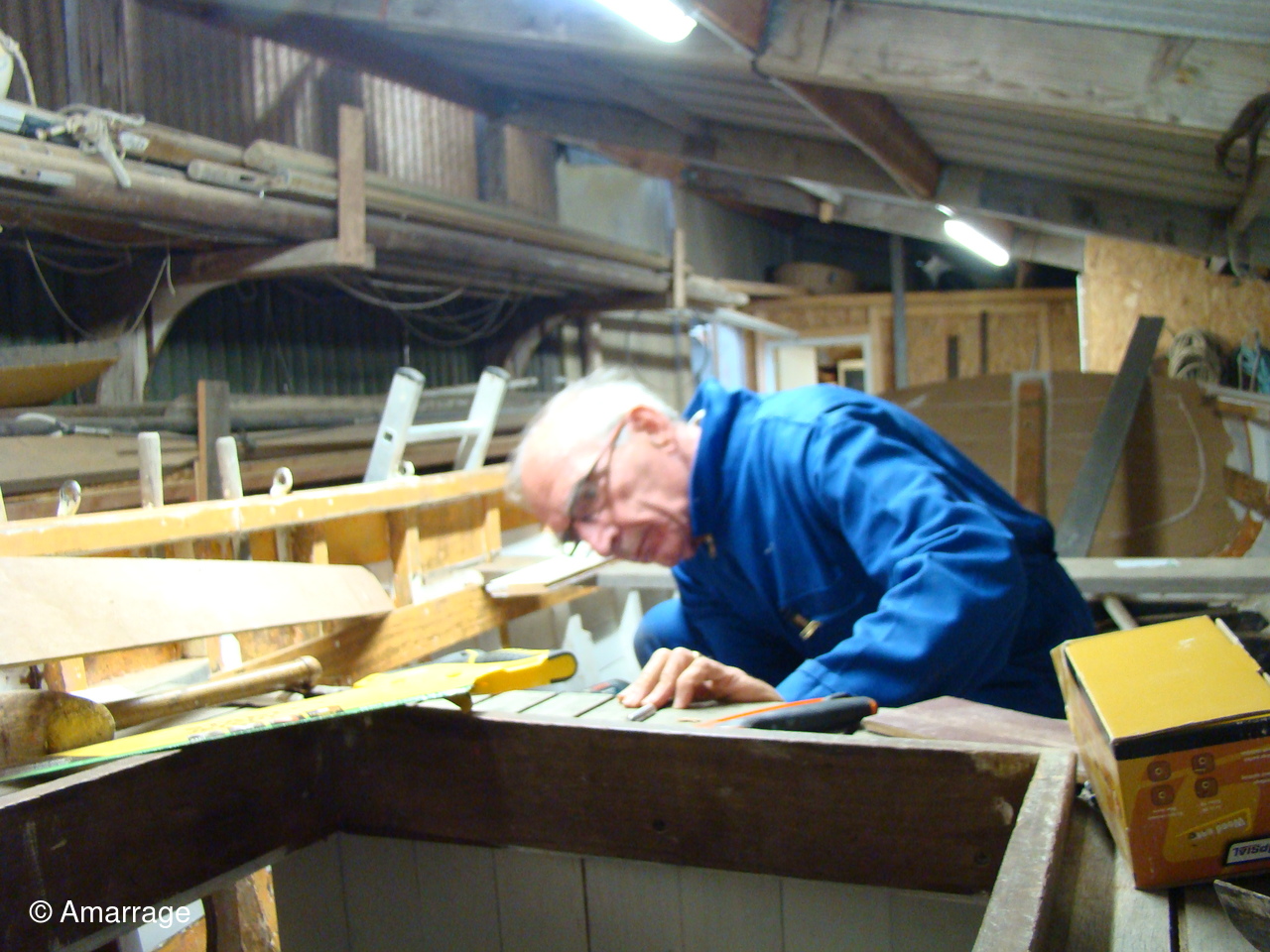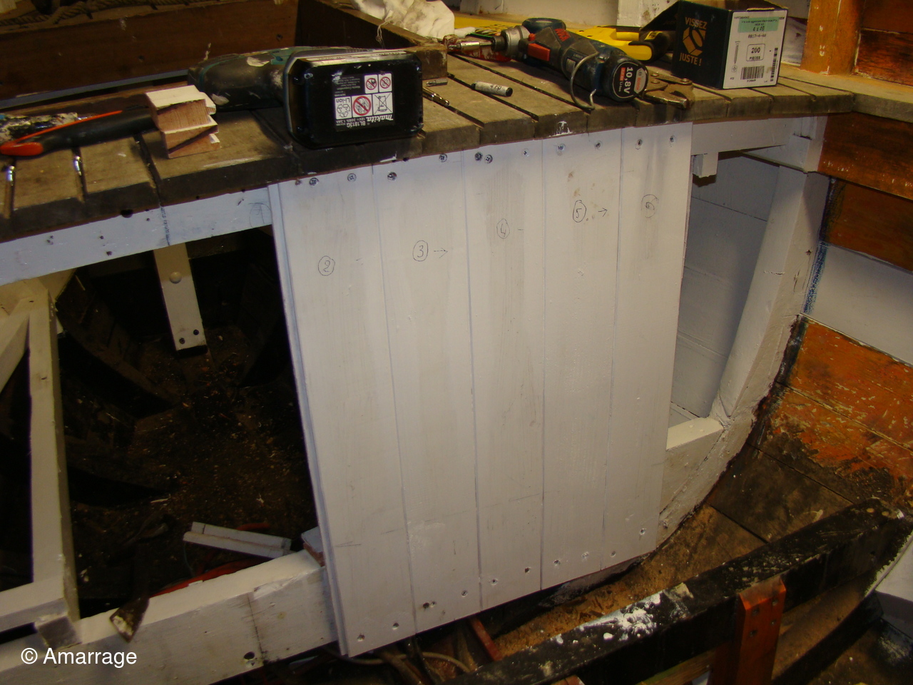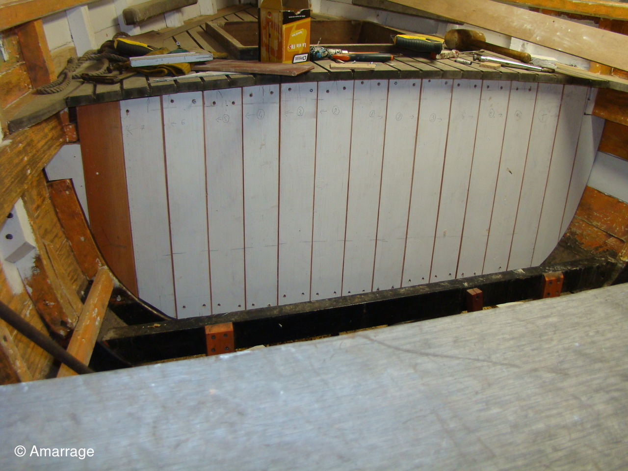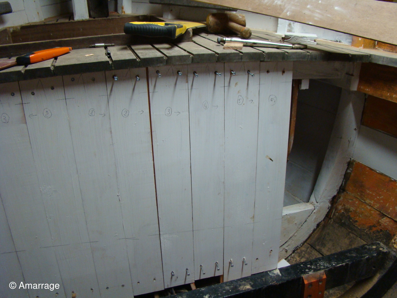 "AWASSA": travail sur la cloison, finition des extrémités, démontage pour chanfreinage et remontage. Reste peinture et fixation définitive. Présentation d'un bordé sur tribord.