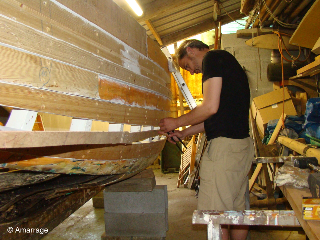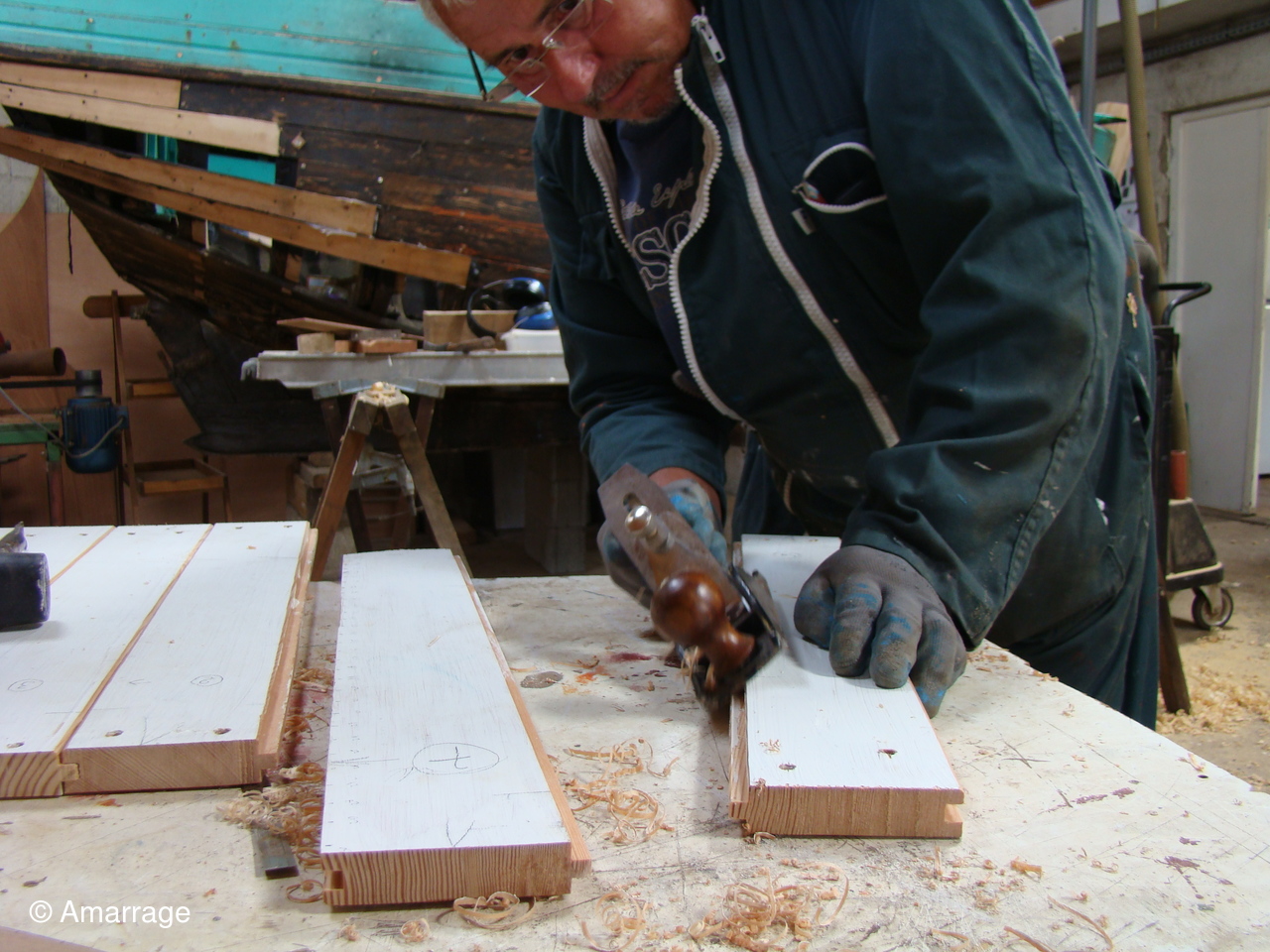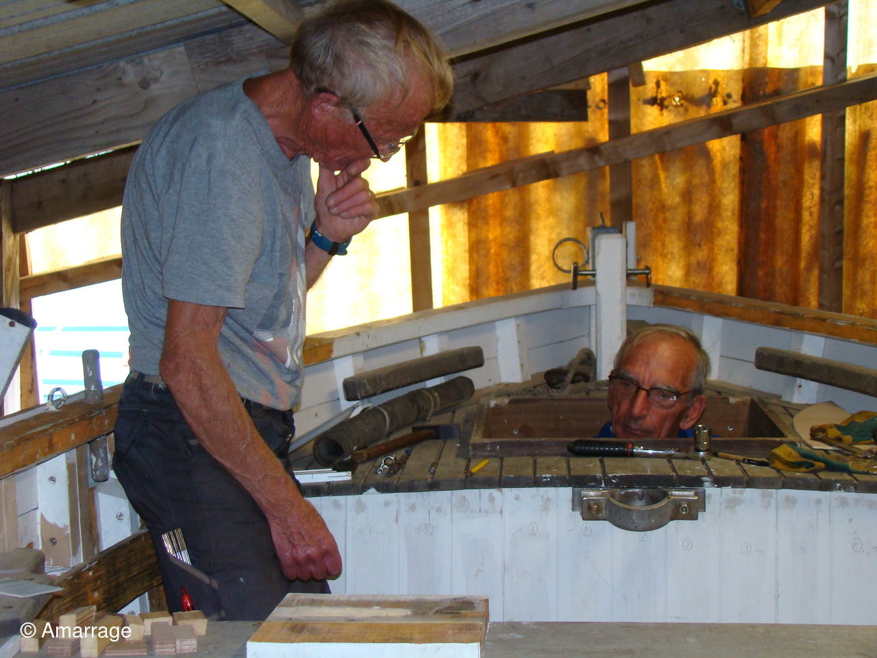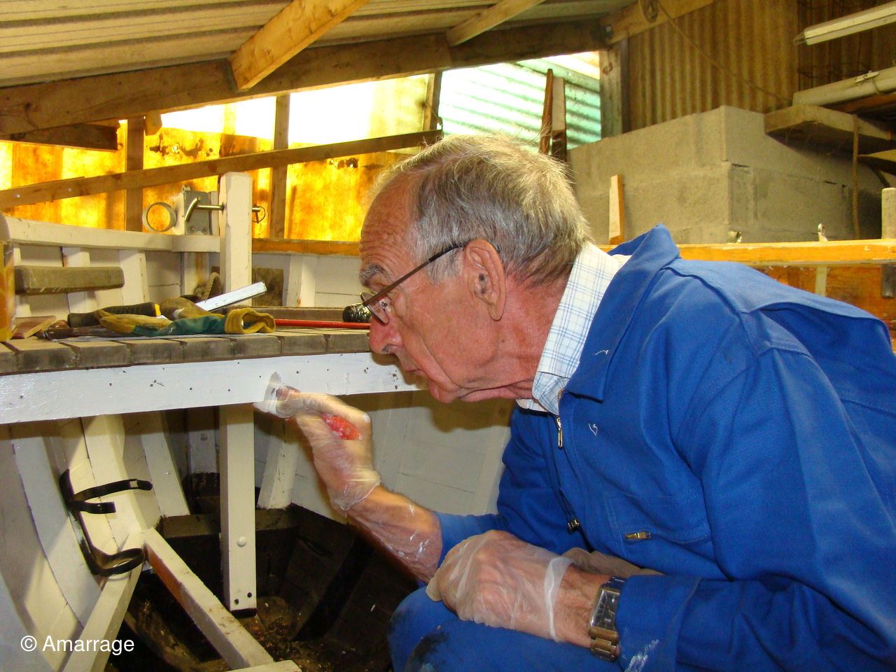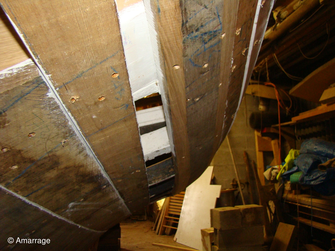 "AWASSA": travail sur la cloison, finition des extrémités, démontage pour chanfreinage et remontage. Reste peinture et fixation définitive. Présentation d'un bordé sur tribord.