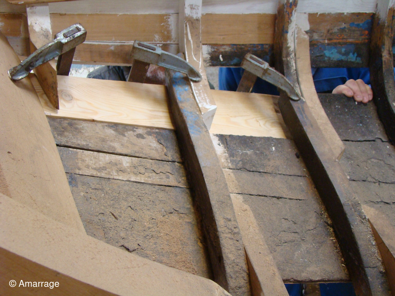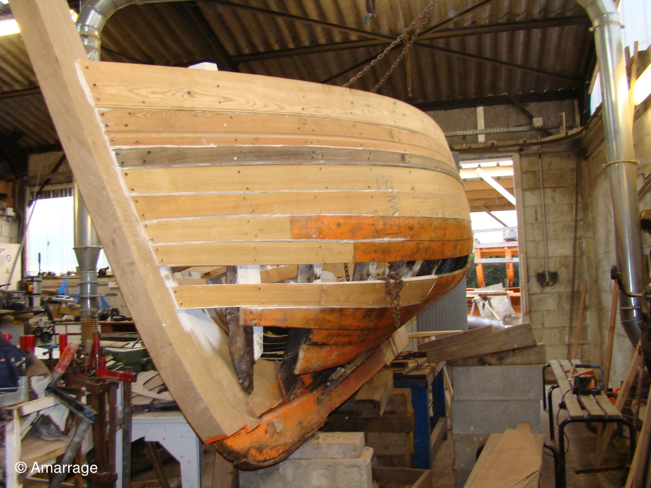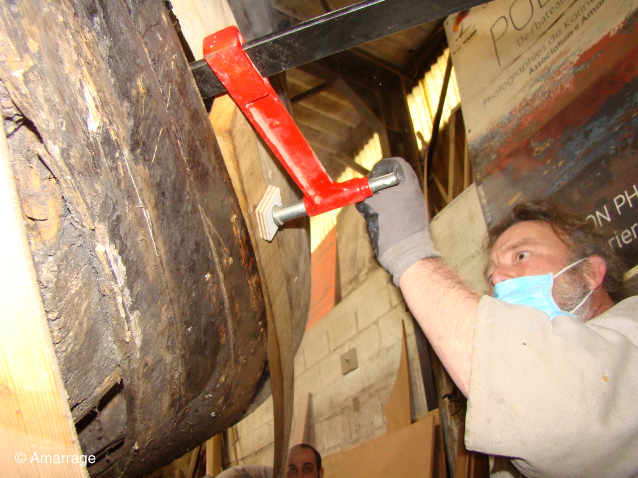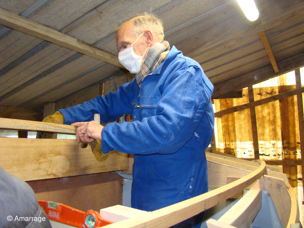 "CATHERINE- PHILIPPE": étuvage, mise en forme d'un bordé Bb. Dépot et mise en peinture.