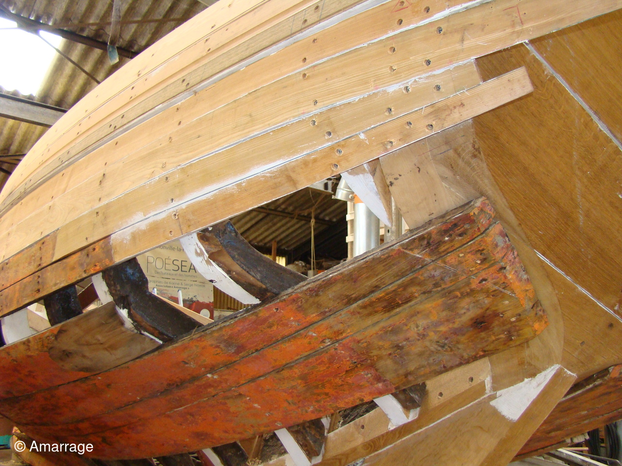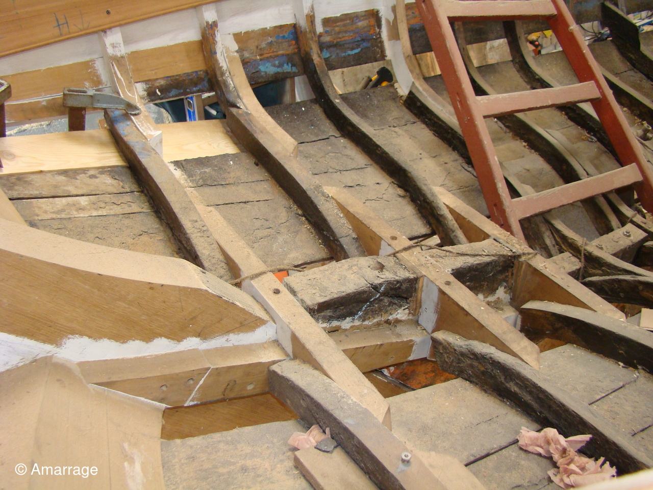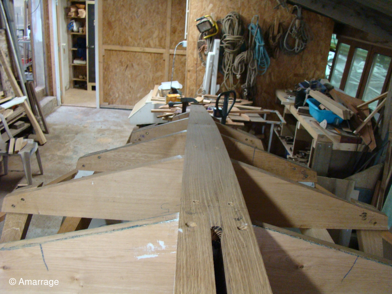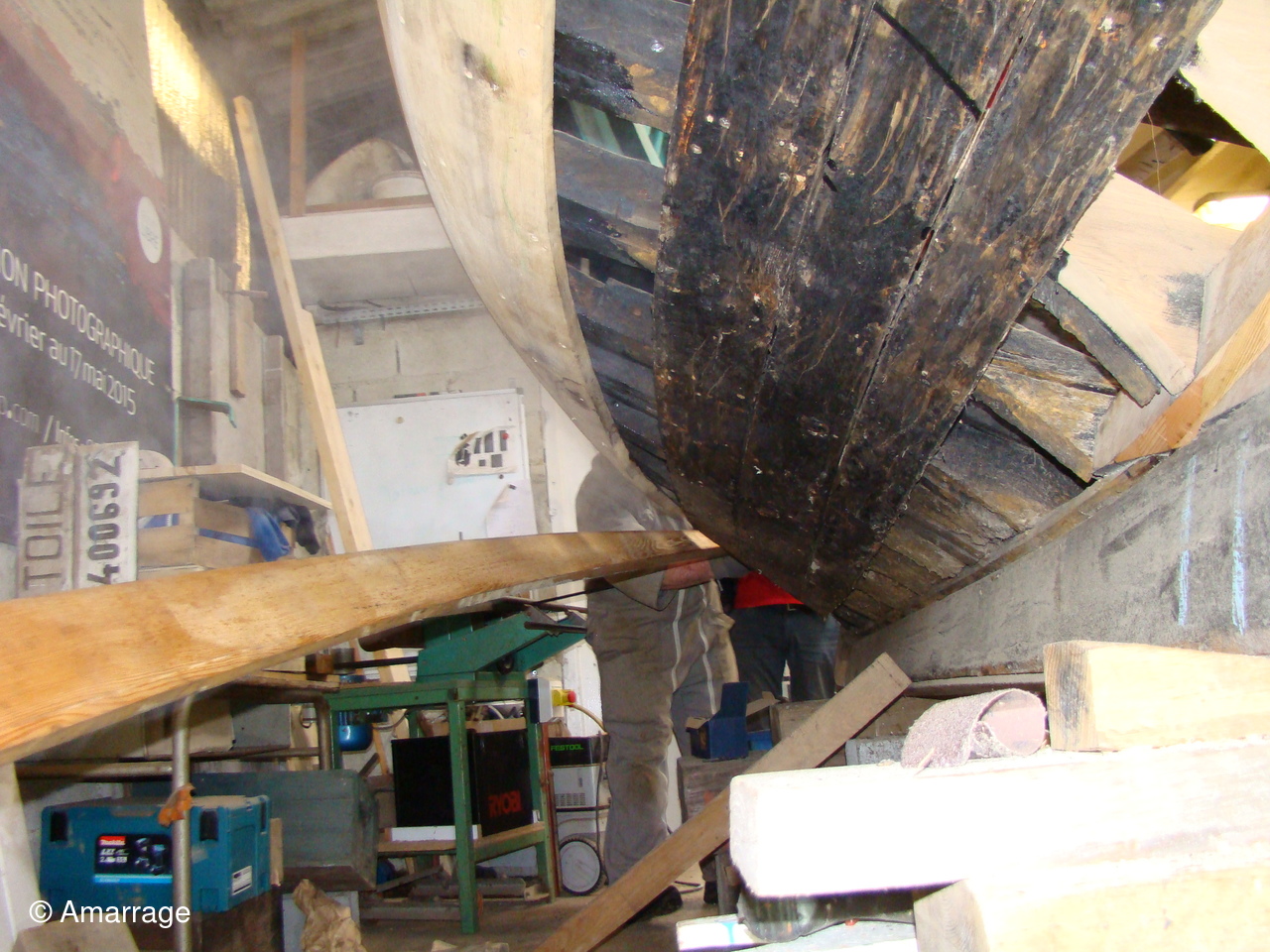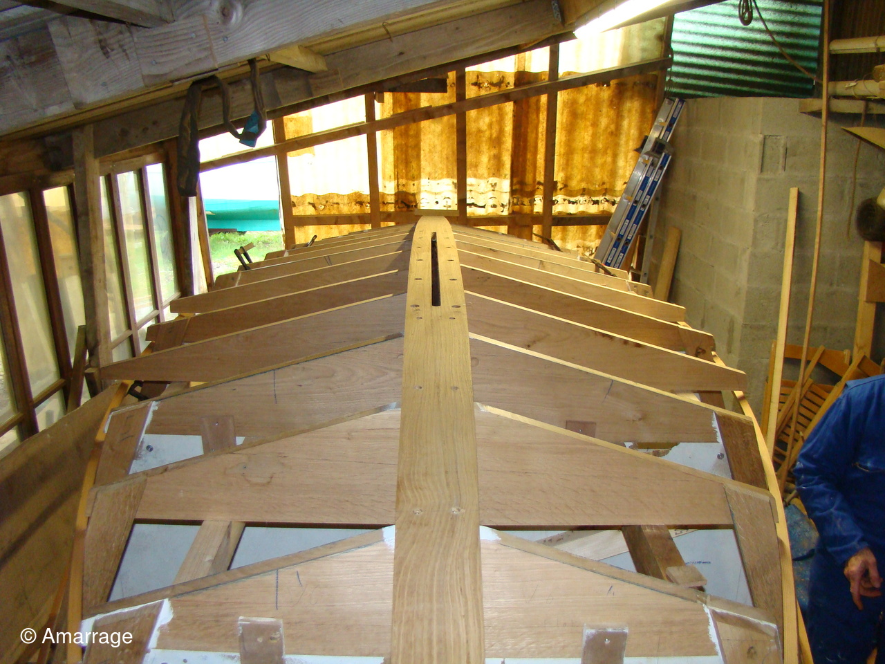 Quille, puits de dérive, varangues, membrures assemblées, fixées.