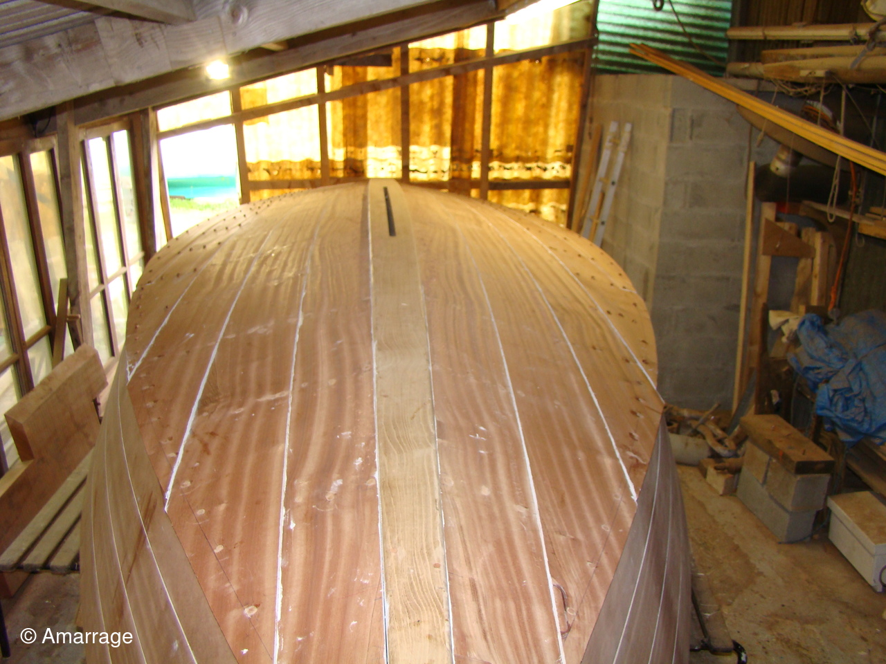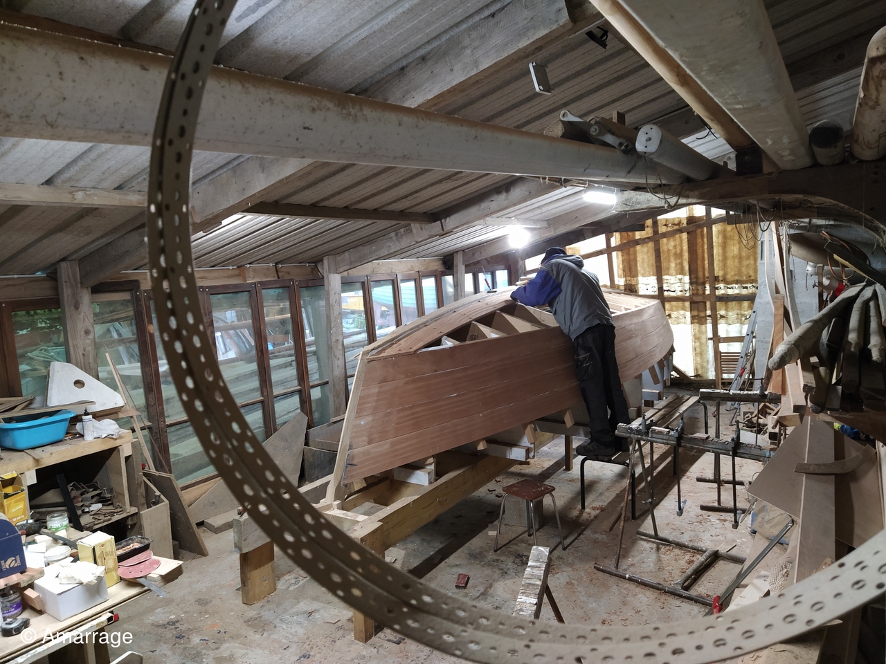 "CATHERINE-PHILIPPE": sur coté bâbord la coque est fermée. Sur tribord reste le galbord et ribord à mettre en place.