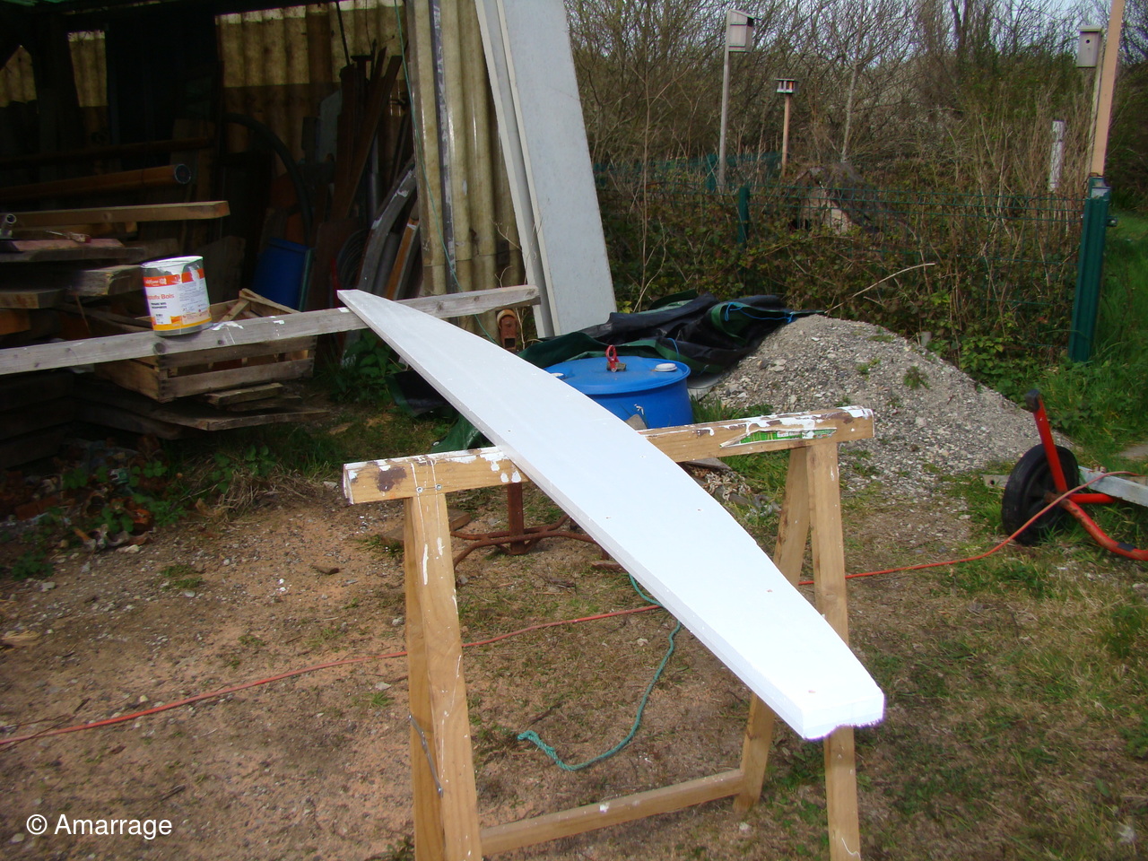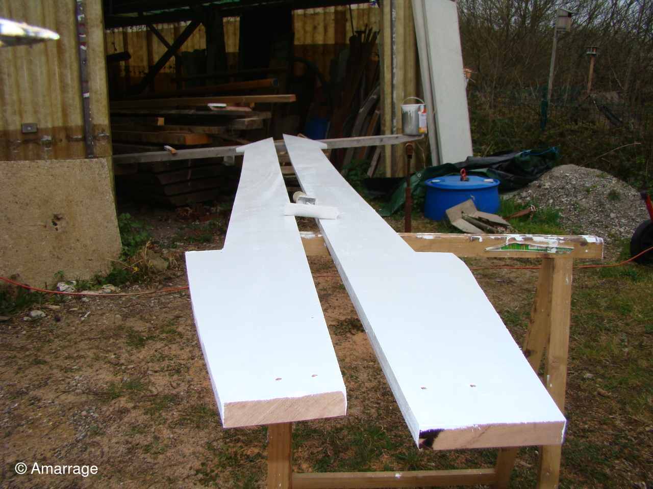 "GUEPARD": travail sur le bordage de fond de bateau: le 2ème bordé sur Td a été fixé - présentation du 3ème bordé sur Td - mise en peinture des bordés Td Et Bd - mise en place bordé Bd - découpe d'un plateau pour 3ème bordé Td.