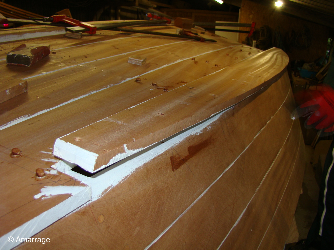 "GUEPARD": travail sur les 4 derniers bordés du fond de bateau: présentation - mise en peinture - pose et fixation - mise en place des tapons.