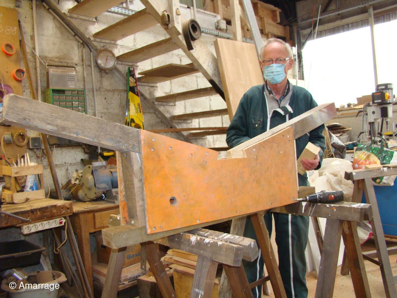 "GUEPARD": le travail de calfatage a débuté et va se poursuivre les jours provhains. Fabrication d'un "Ber", pour poser le bateau une fois le retournement effectué.