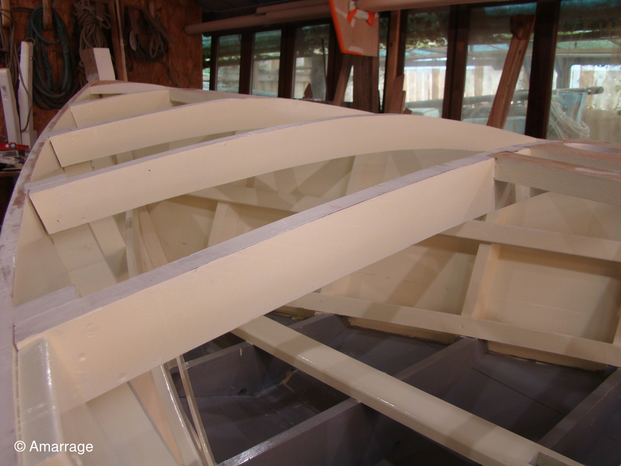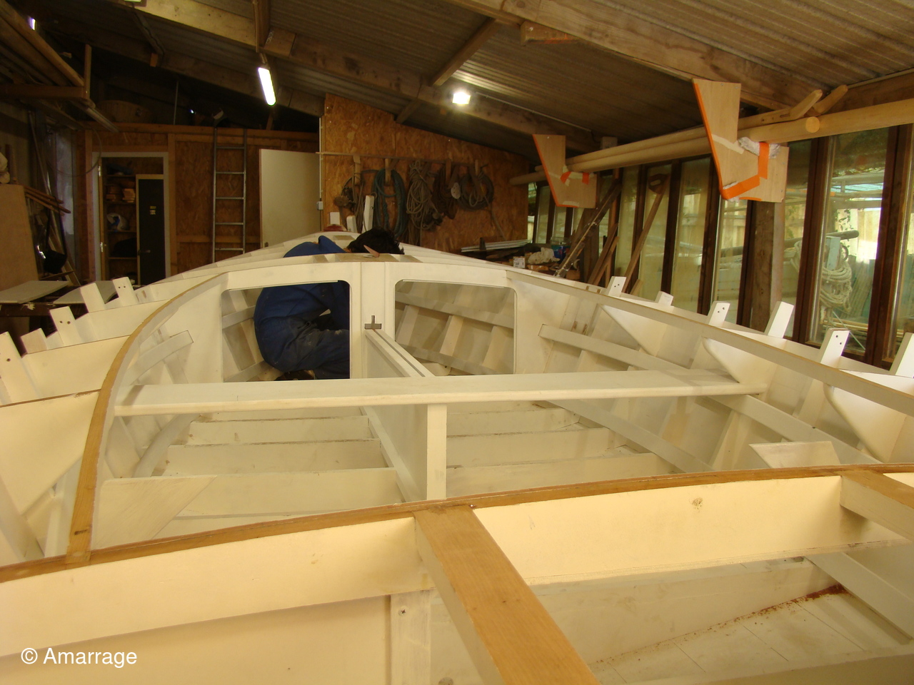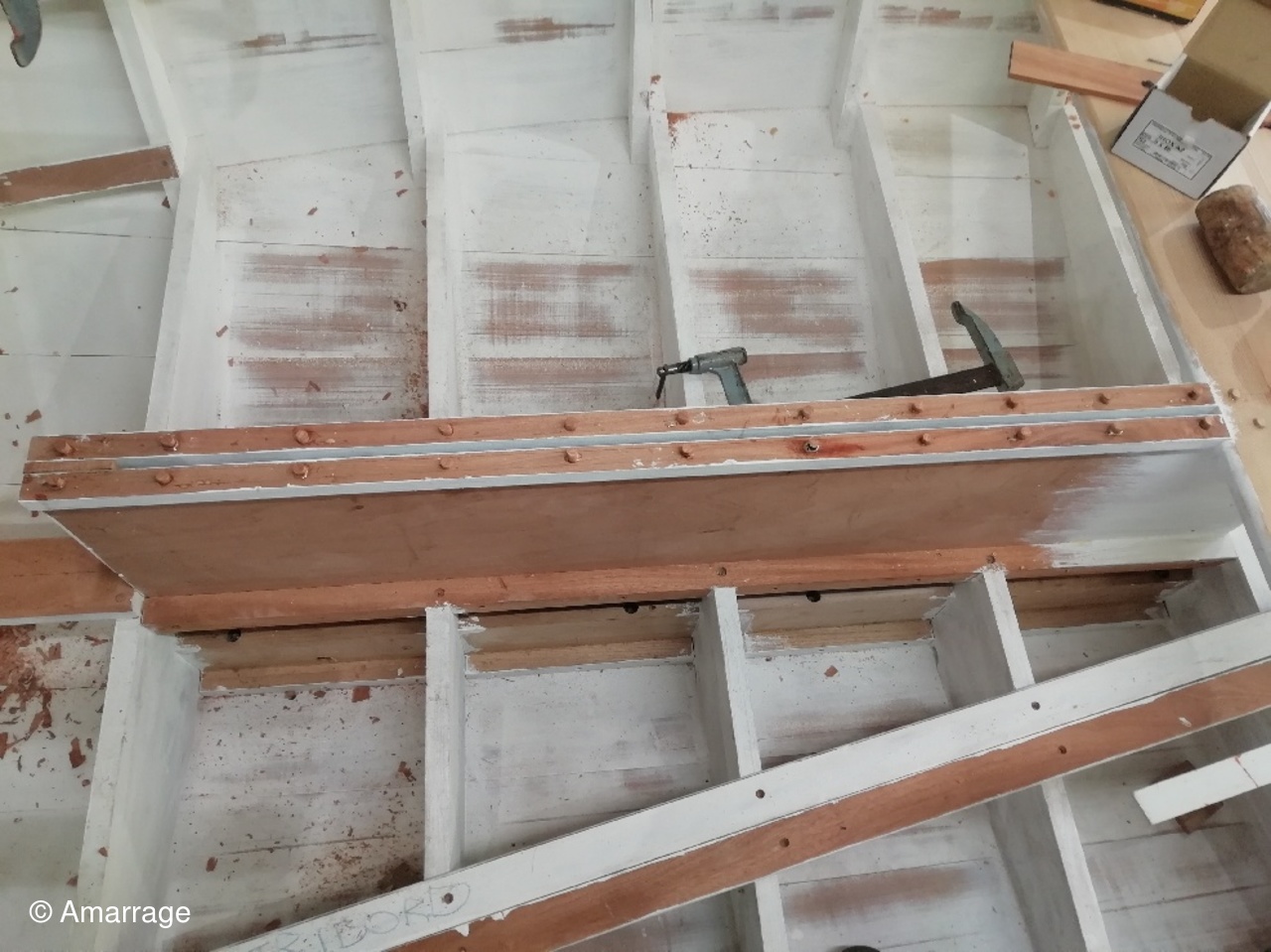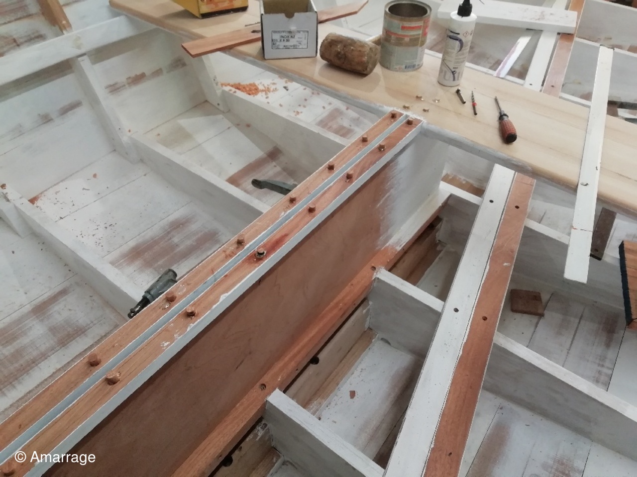 "GUEPARD": pose des élongis tribord et bâbord- fabrication des bancs latéraux, mise en peinture et présentation - égrenage peinture intérieure coque- première couche de peinture (grise) sur le fond du bateau - système de fermeture des portes de cloison.