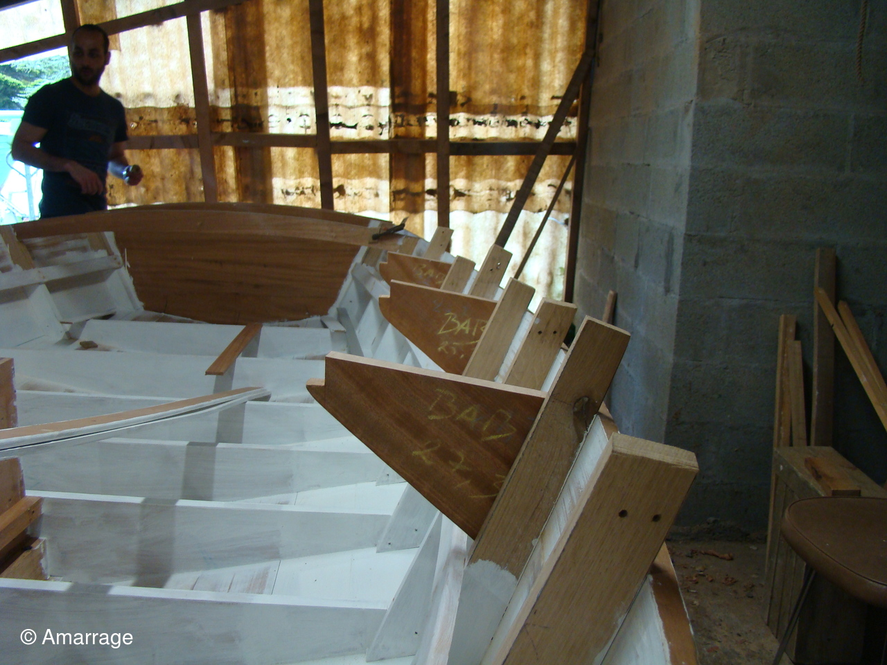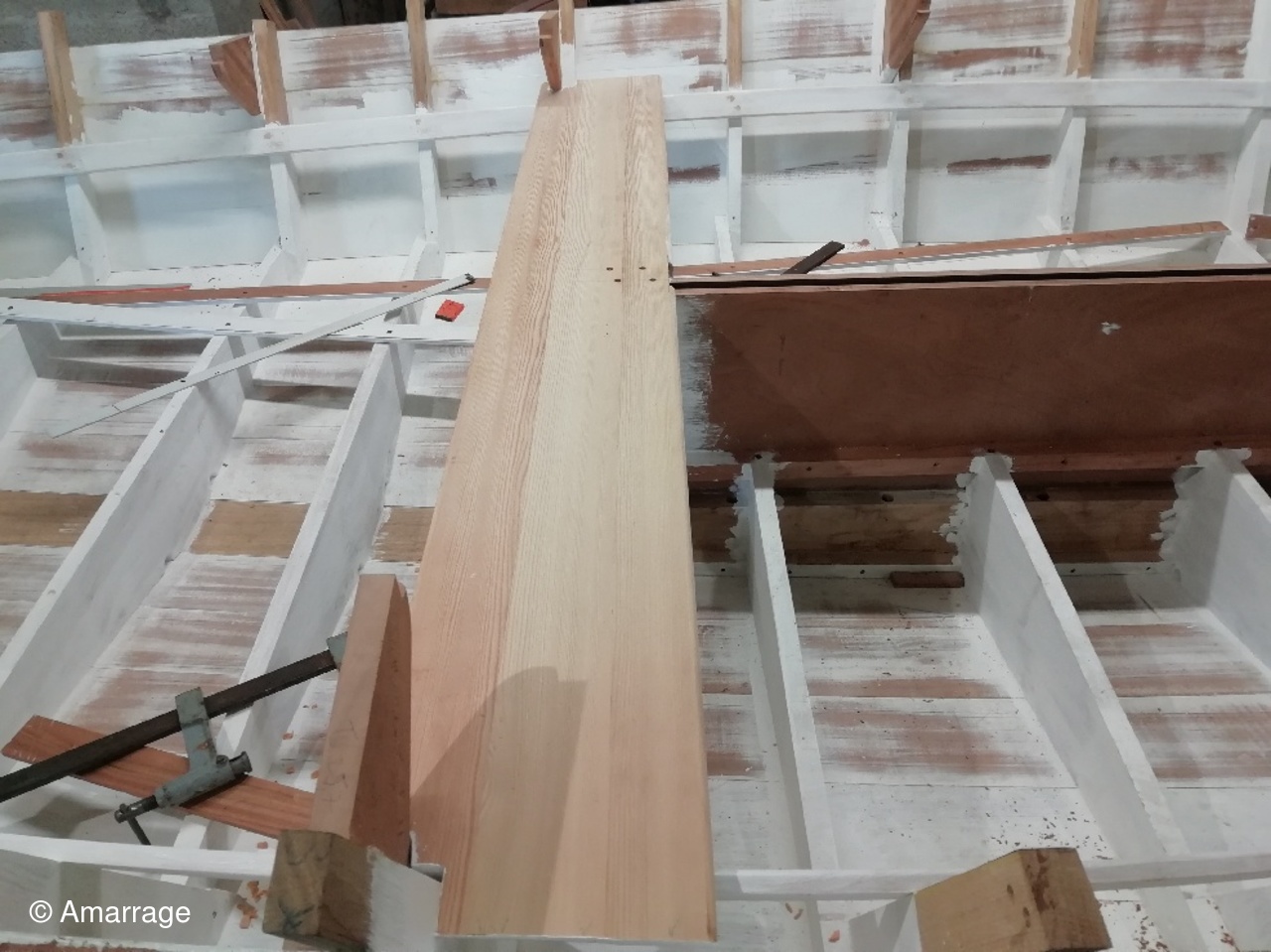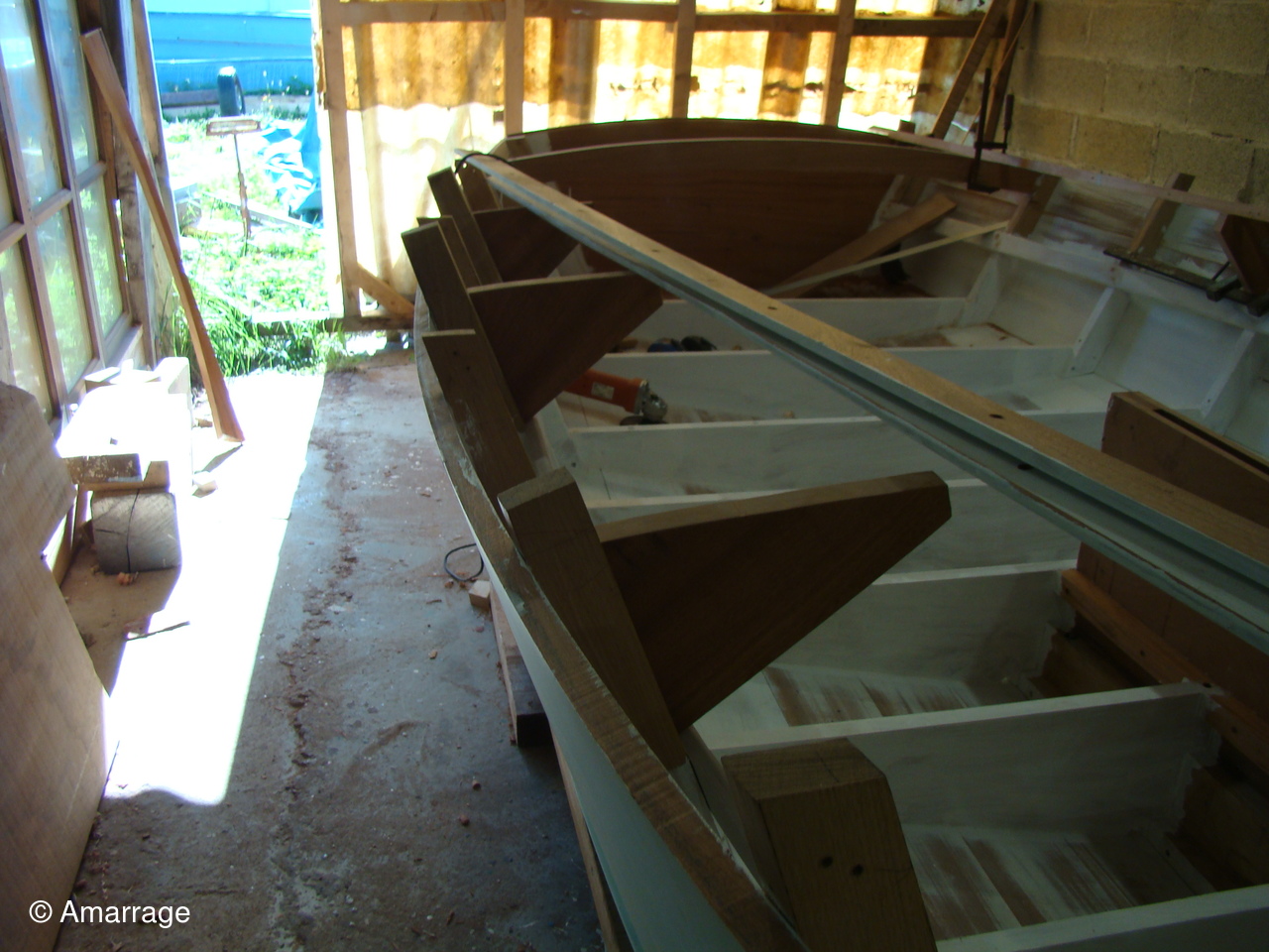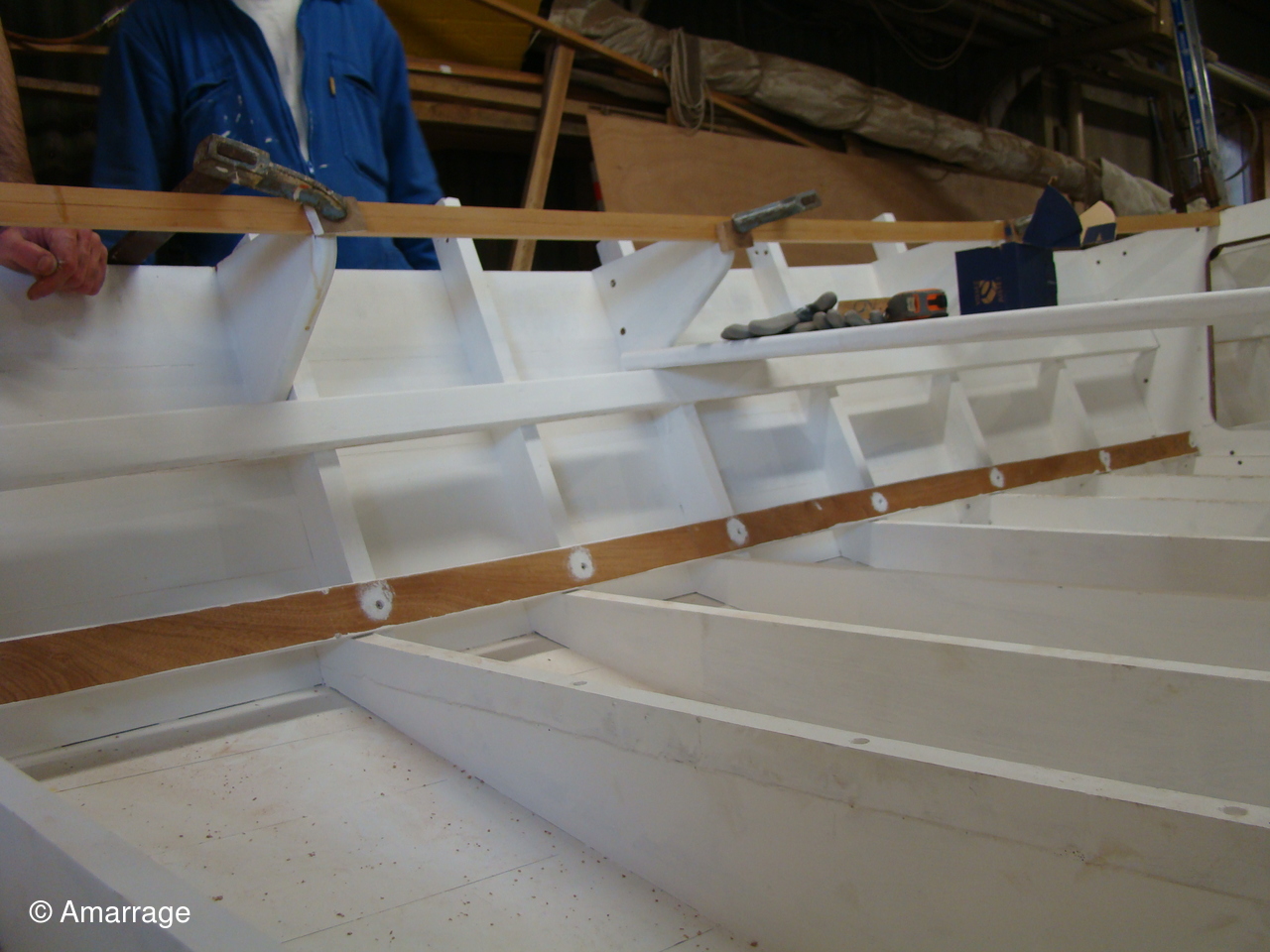 "GUEPARD": pose des élongis tribord et bâbord- fabrication des bancs latéraux, mise en peinture et présentation - égrenage peinture intérieure coque- première couche de peinture (grise) sur le fond du bateau - système de fermeture des portes de cloison.