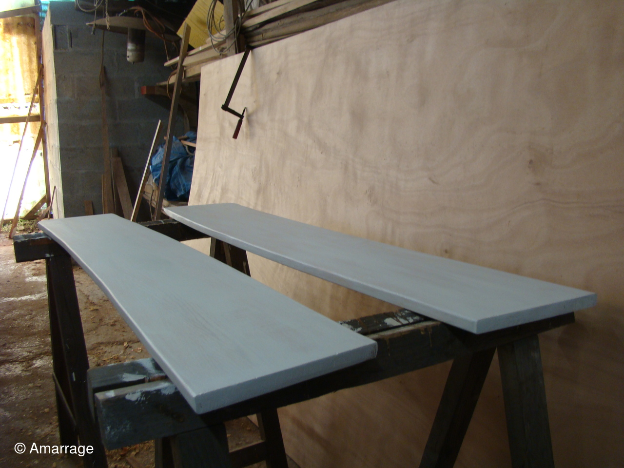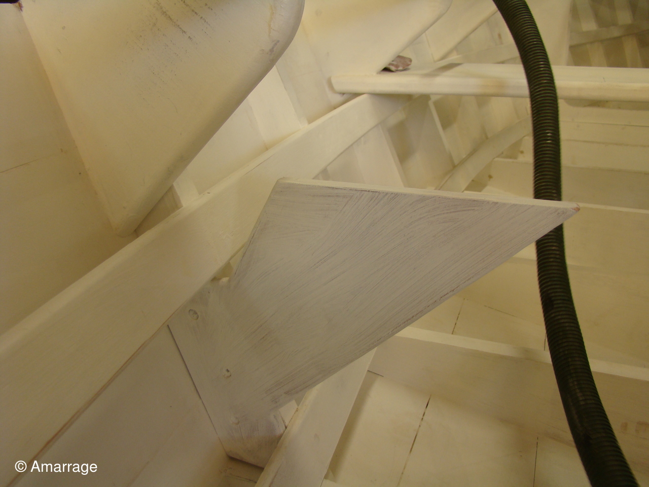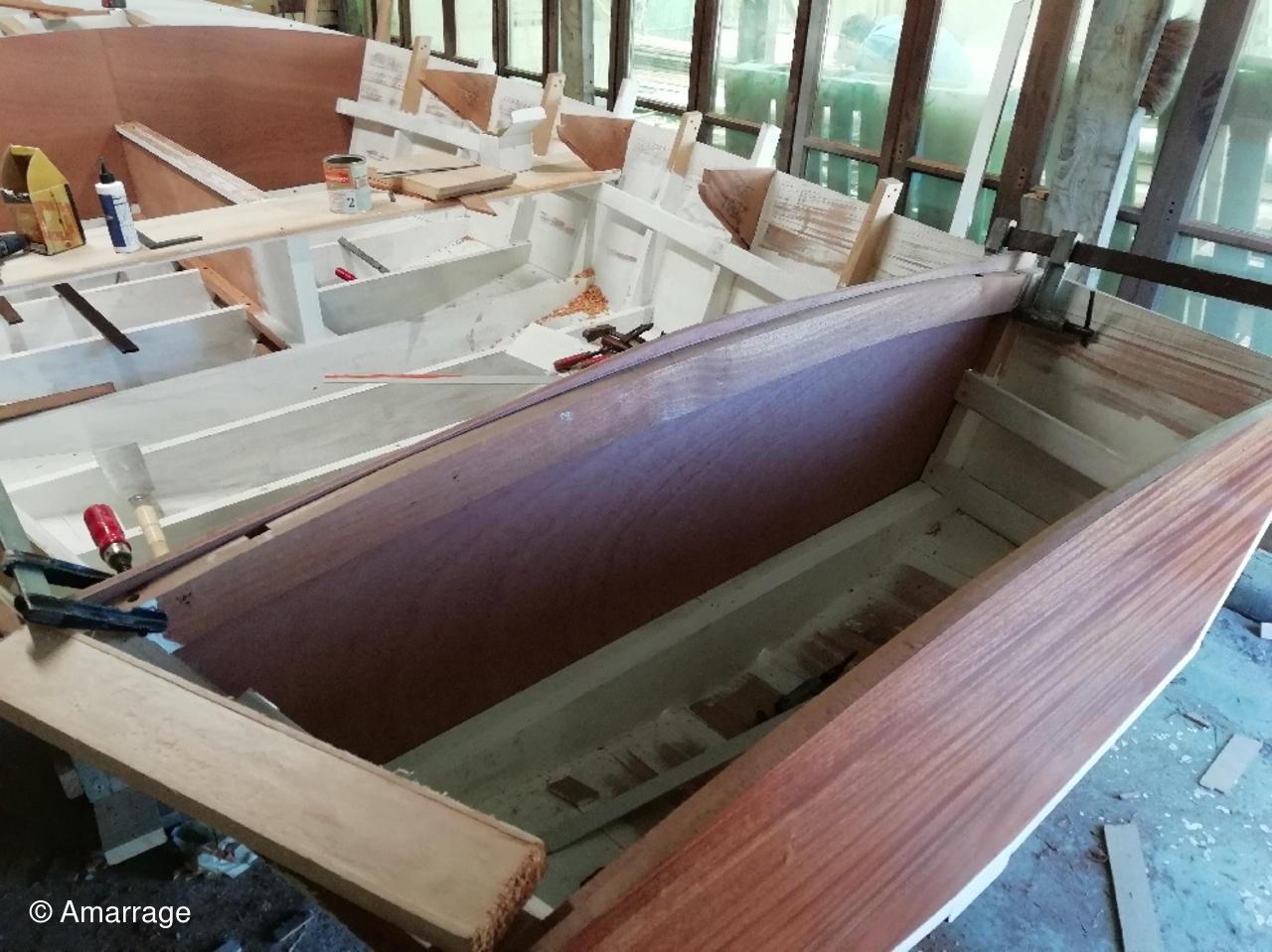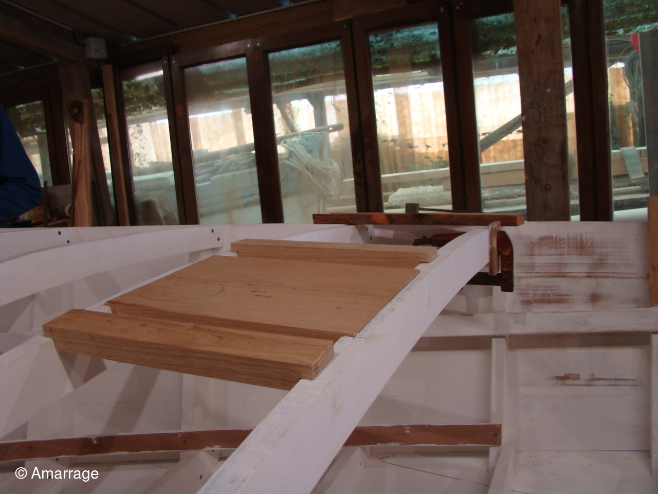 "GUEPARD": pose des élongis tribord et bâbord- fabrication des bancs latéraux, mise en peinture et présentation - égrenage peinture intérieure coque- première couche de peinture (grise) sur le fond du bateau - système de fermeture des portes de cloison.