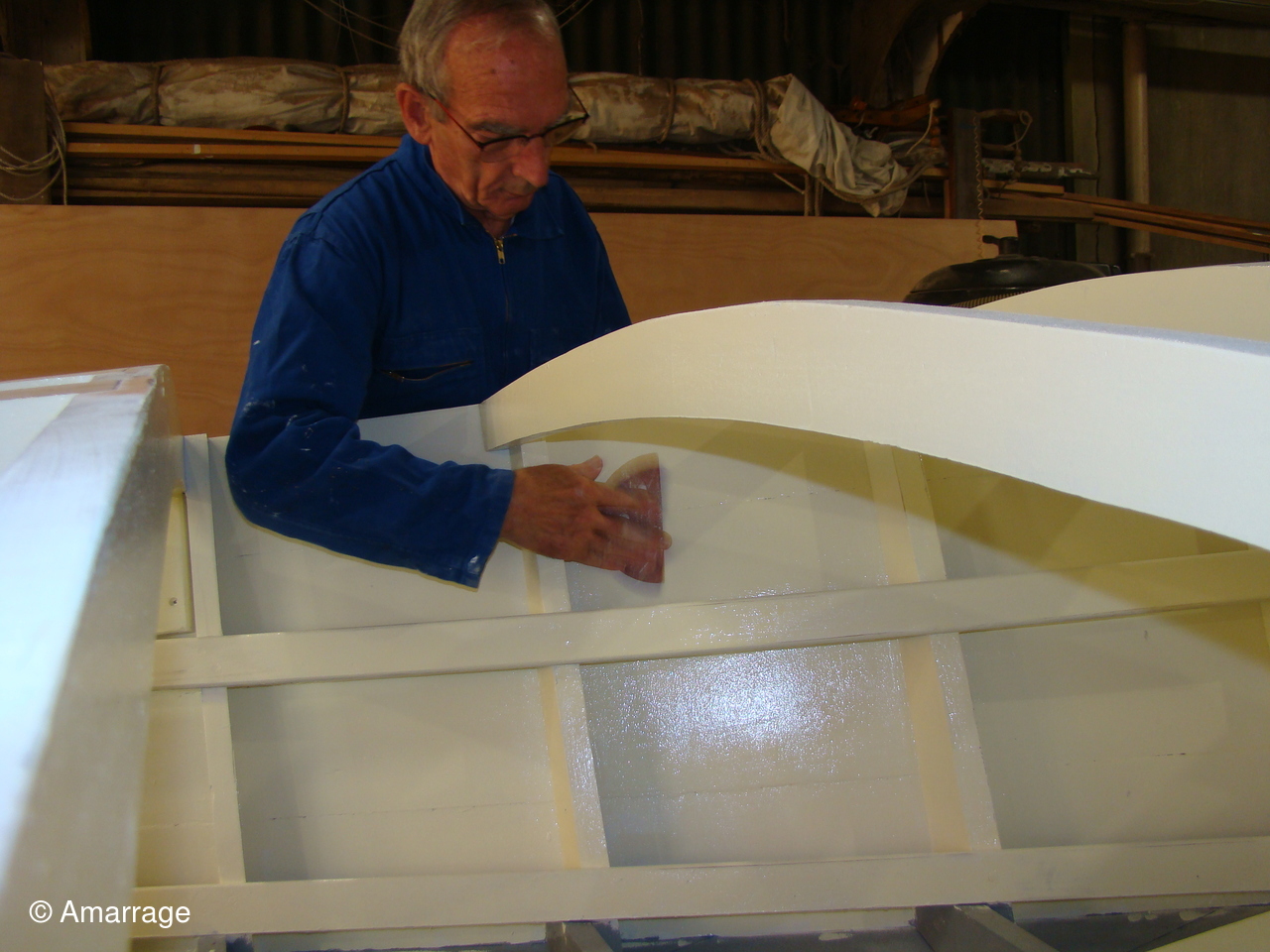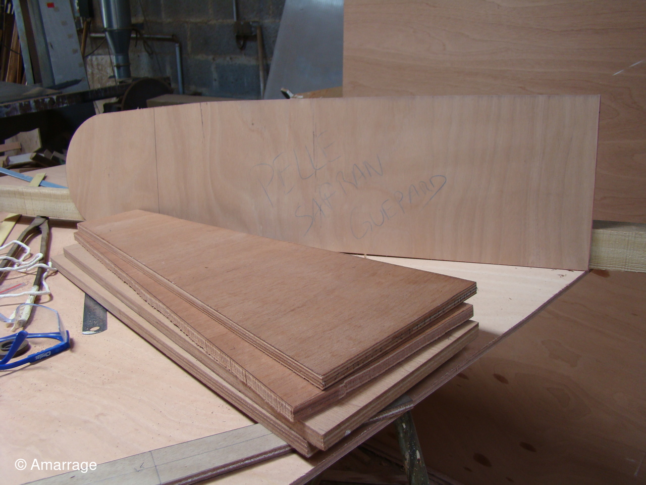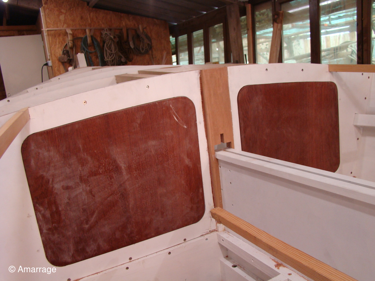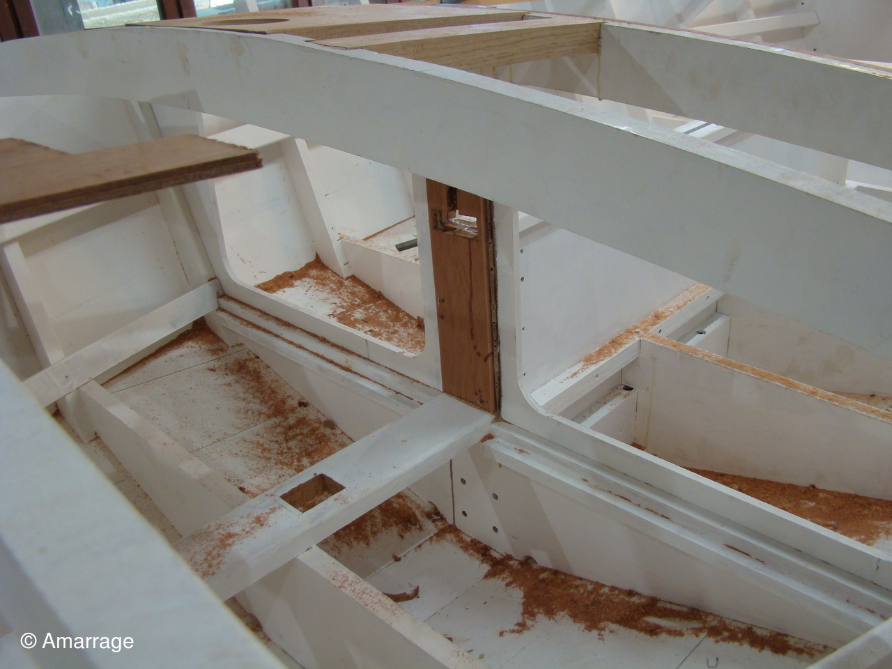 "GUEPARD": Egrenage de la coque interne avant la 1ère couche de peinture laquée- la première de peinture laquée est passée, ainsi que les bancs, portes de cloison et système de fermeture des portes- fabrication en CP du gabarit de la dérive-découpe des pièces de CP pour le safran.