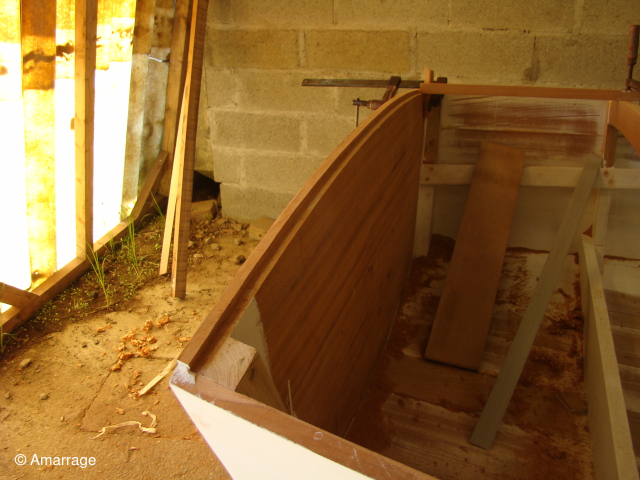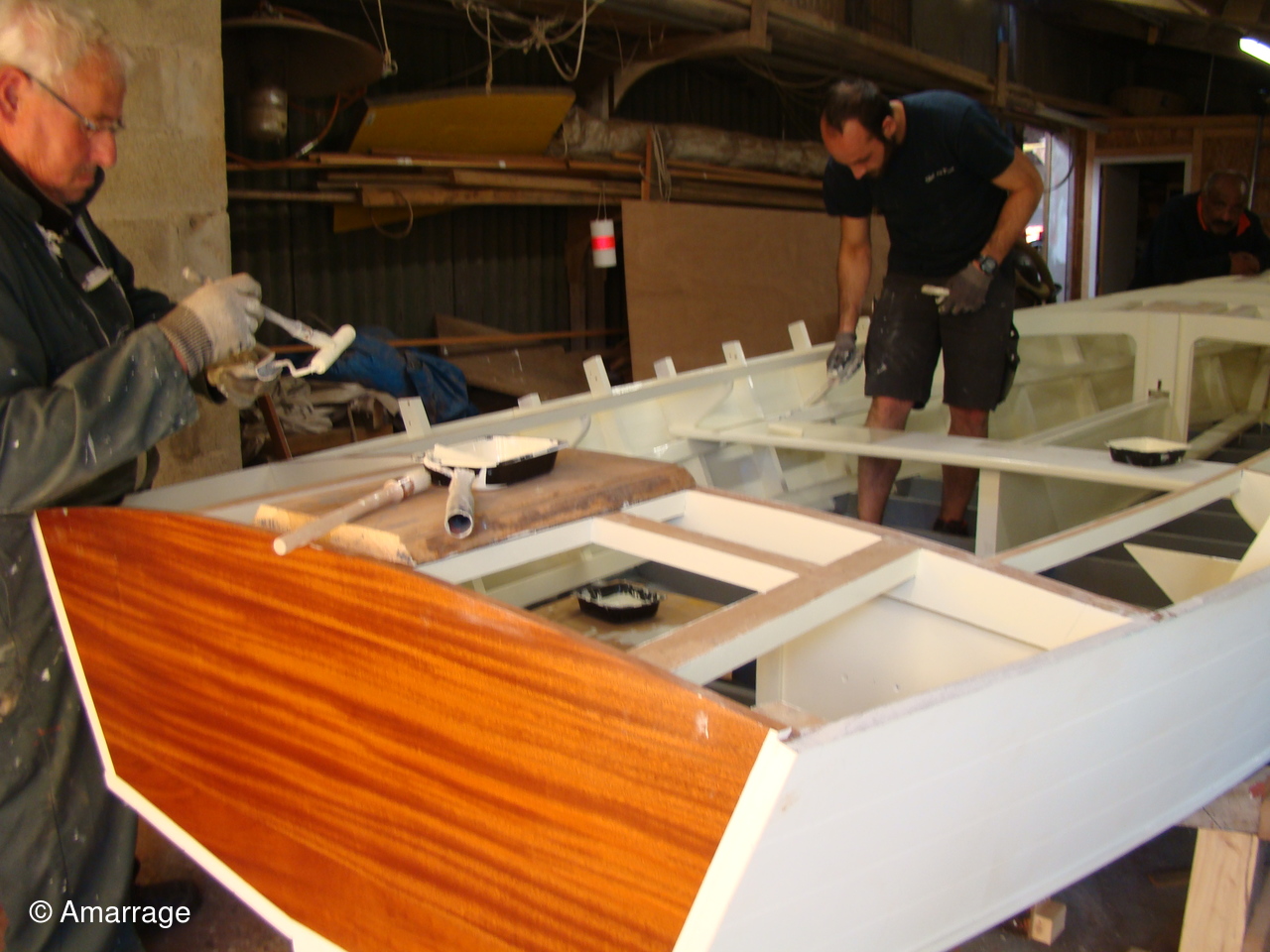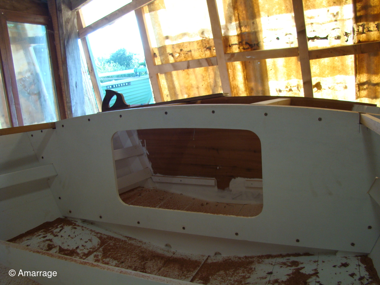 "GUEPARD": Egrenage de la coque interne avant la 1ère couche de peinture laquée- la première de peinture laquée est passée, ainsi que les bancs, portes de cloison et système de fermeture des portes- fabrication en CP du gabarit de la dérive-découpe des pièces de CP pour le safran.
